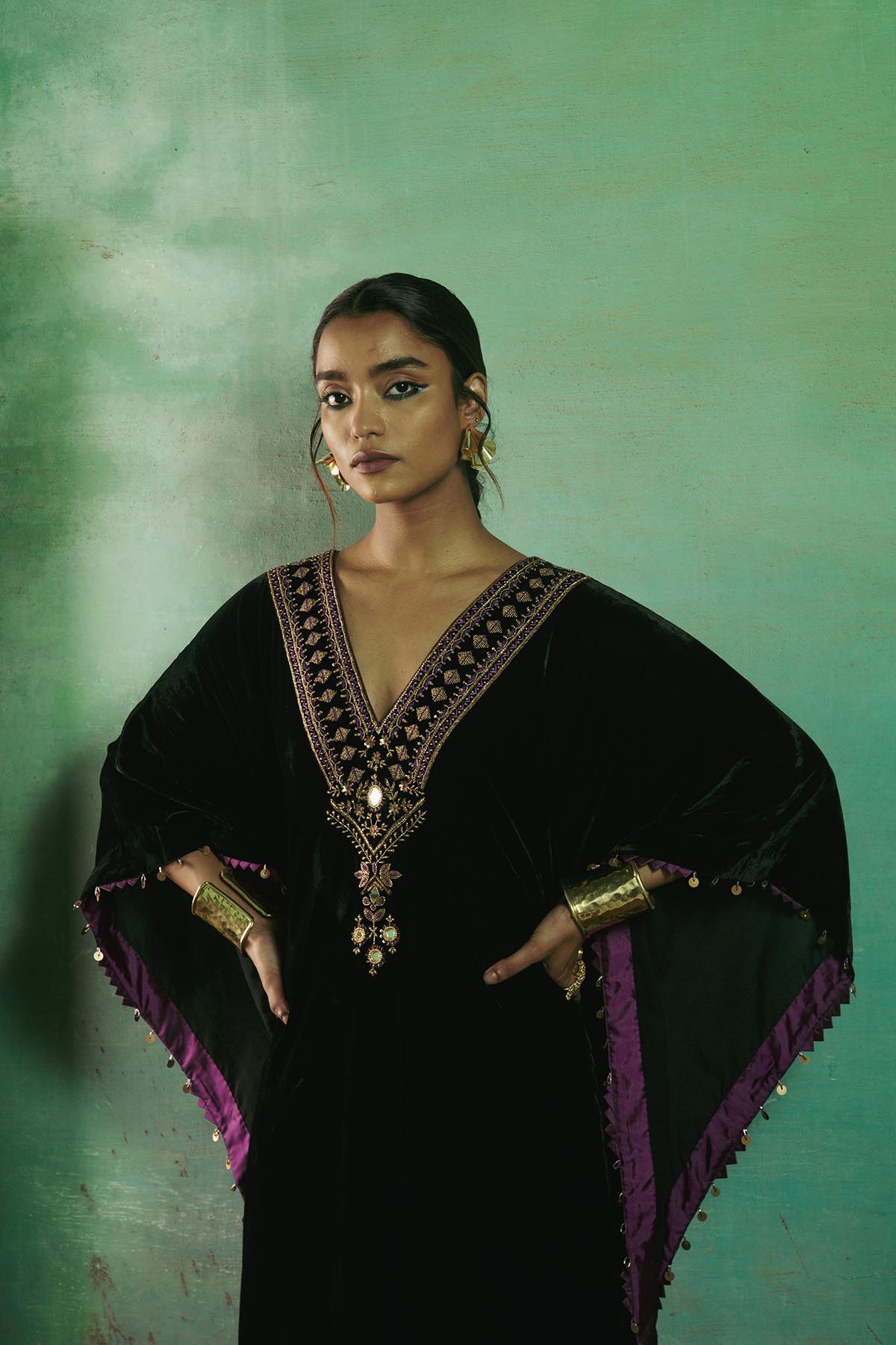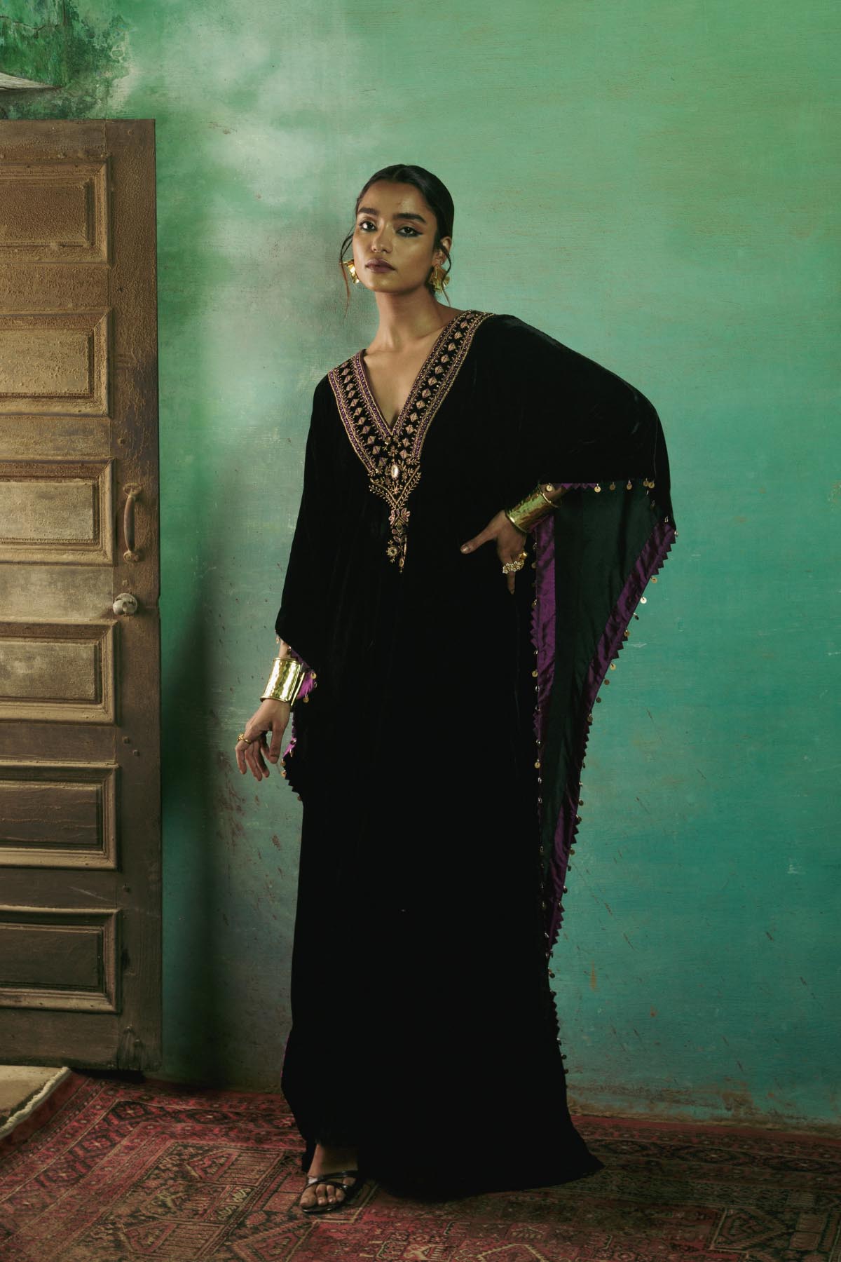 Black silk velvet drapes down the shoulder to the ankle in this floor-skimming kaftan with a plunging neckline and contrast silk panel hemming the inside. An intricately embroidered yoke is what makes this otherwise casual look go the extra mile.