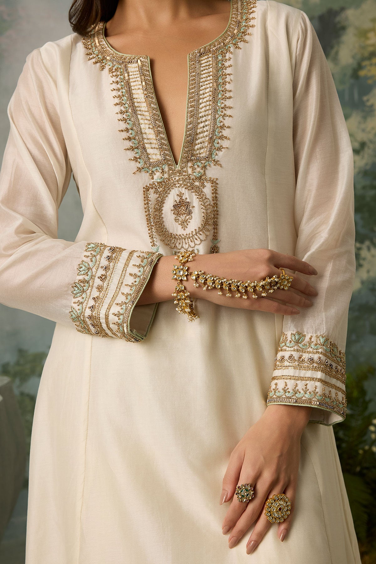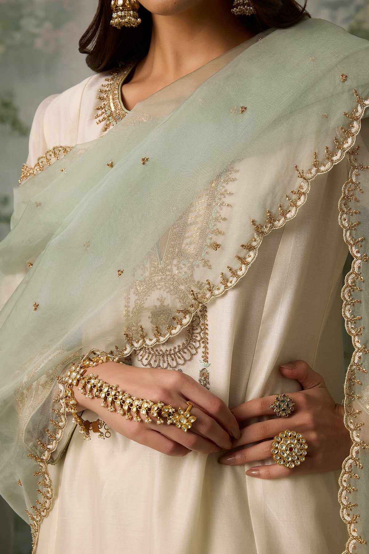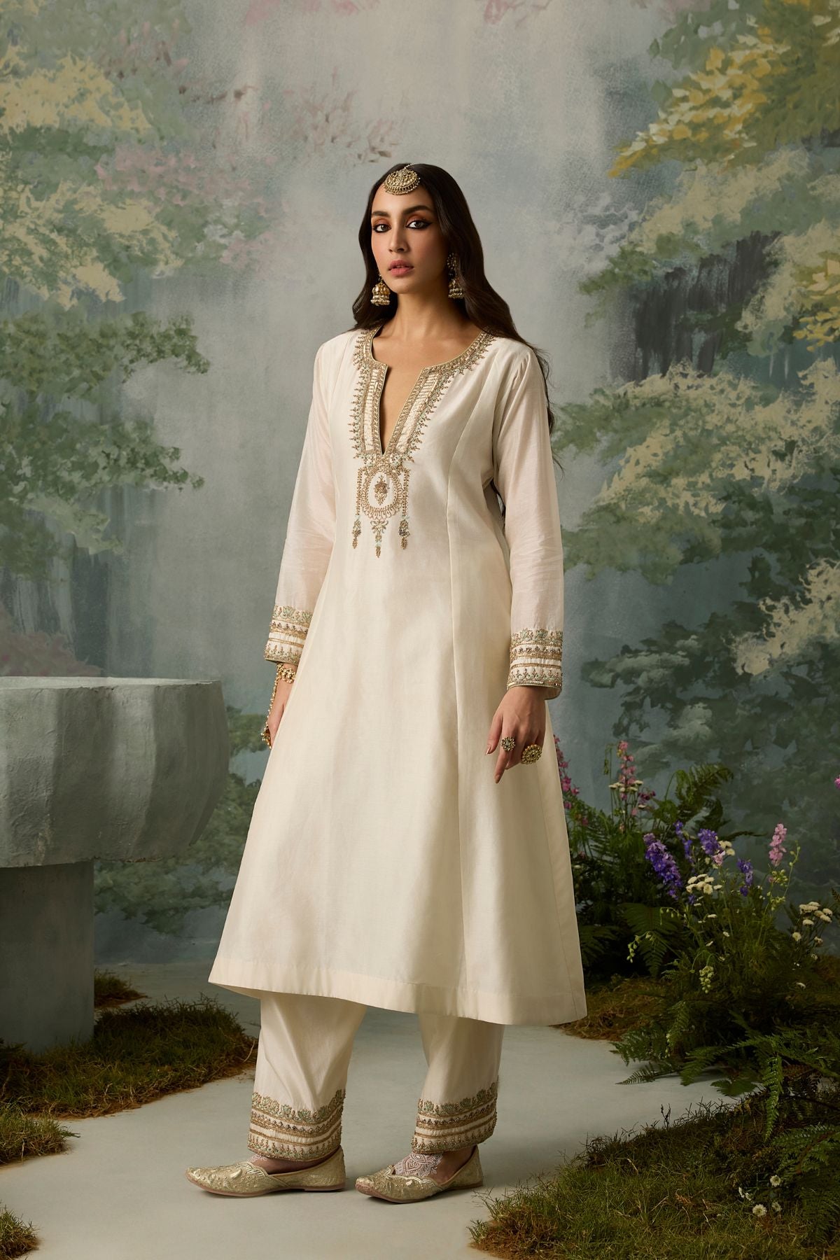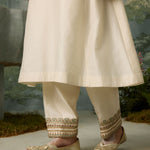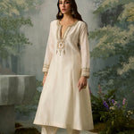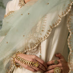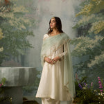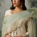 The perfect blend of decadence and simplicity — this ivory kurta and salwar set is intricately hand-embroidered with aari threadwork, then elevated with delicate touches of zari, bead, and sitara. A classic Mughal neckline pairs effortlessly with a sea green scalloped dupatta, bringing contrast and charm. An ensemble that promises timeless elegance.