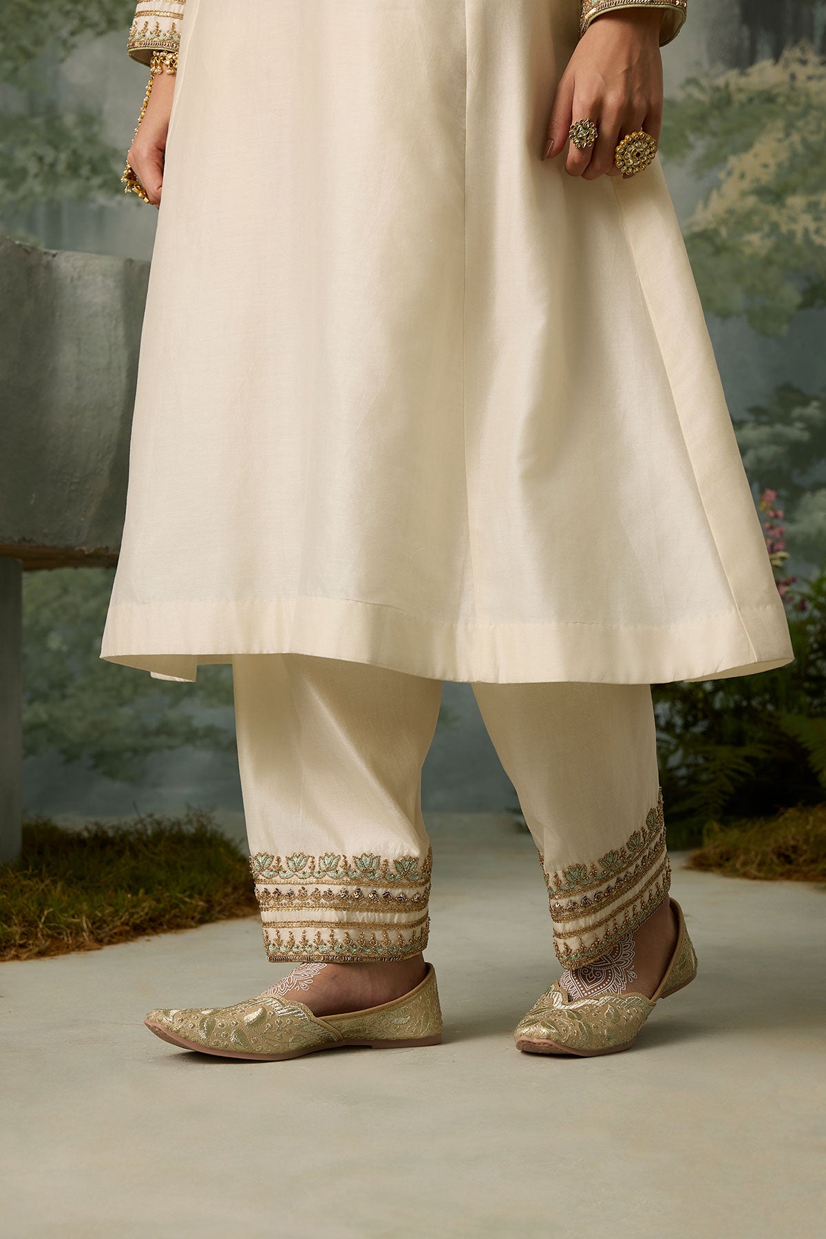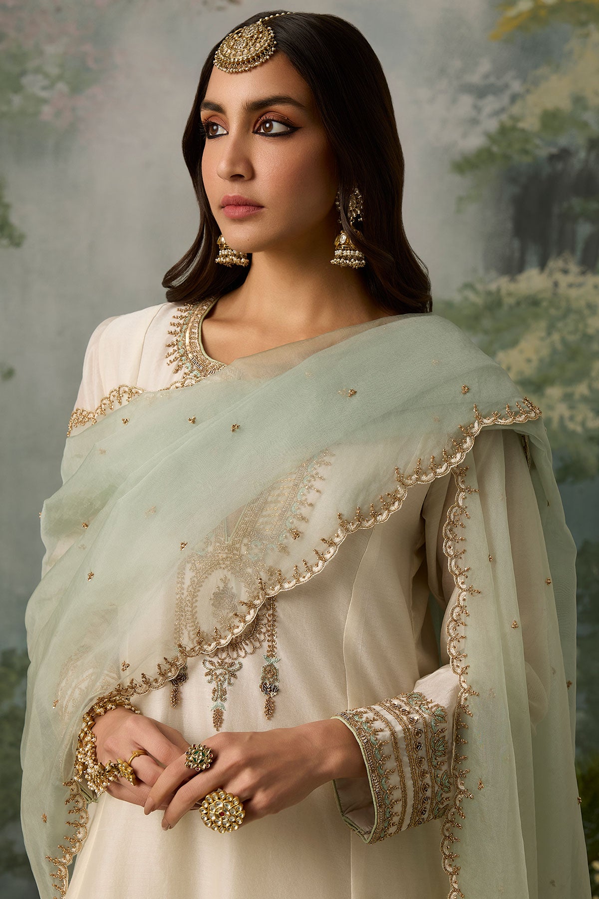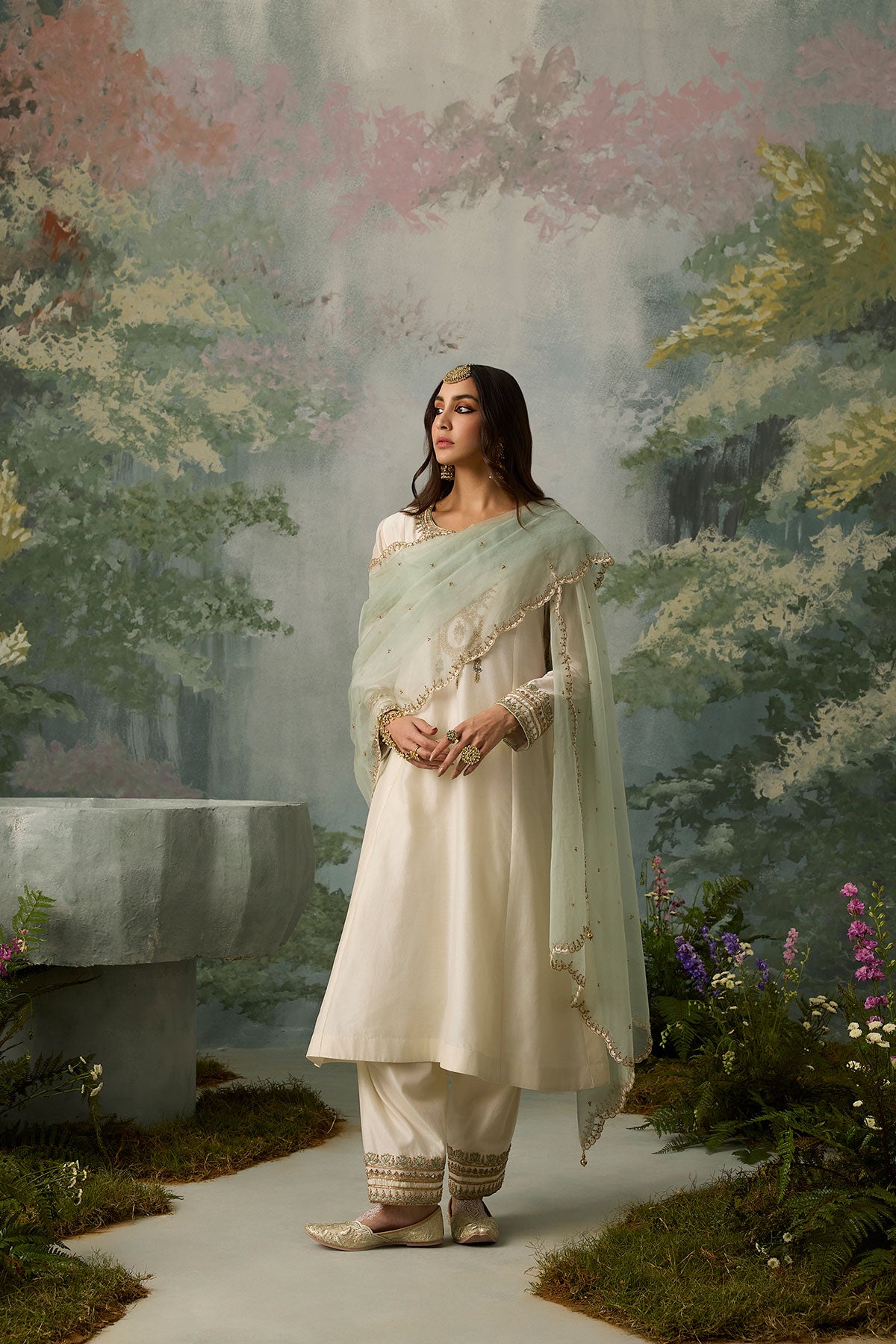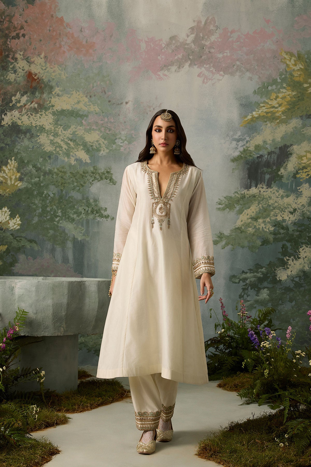 The perfect blend of decadence and simplicity — this ivory kurta and salwar set is intricately hand-embroidered with aari threadwork, then elevated with delicate touches of zari, bead, and sitara. A classic Mughal neckline pairs effortlessly with a sea green scalloped dupatta, bringing contrast and charm. An ensemble that promises timeless elegance.