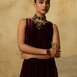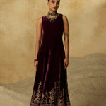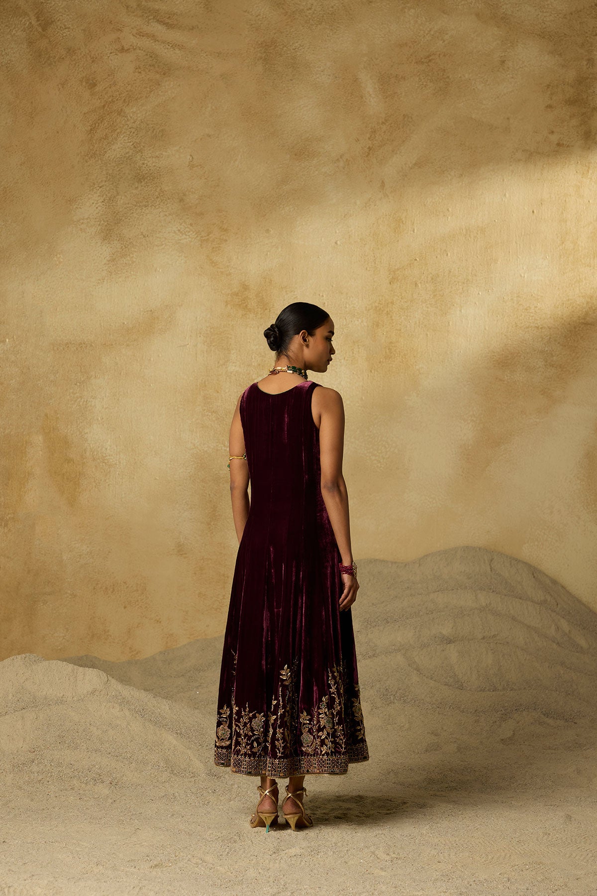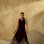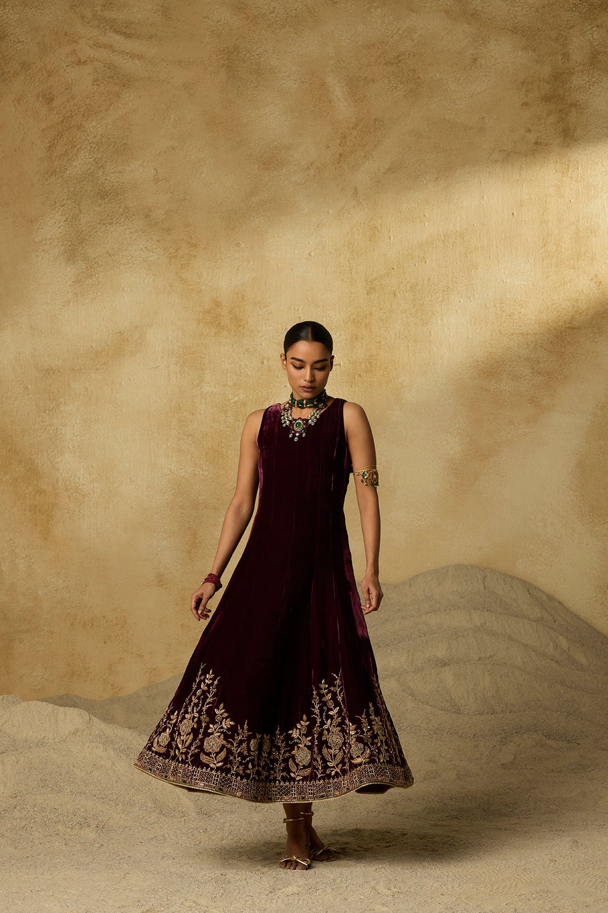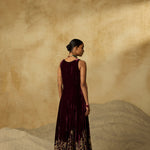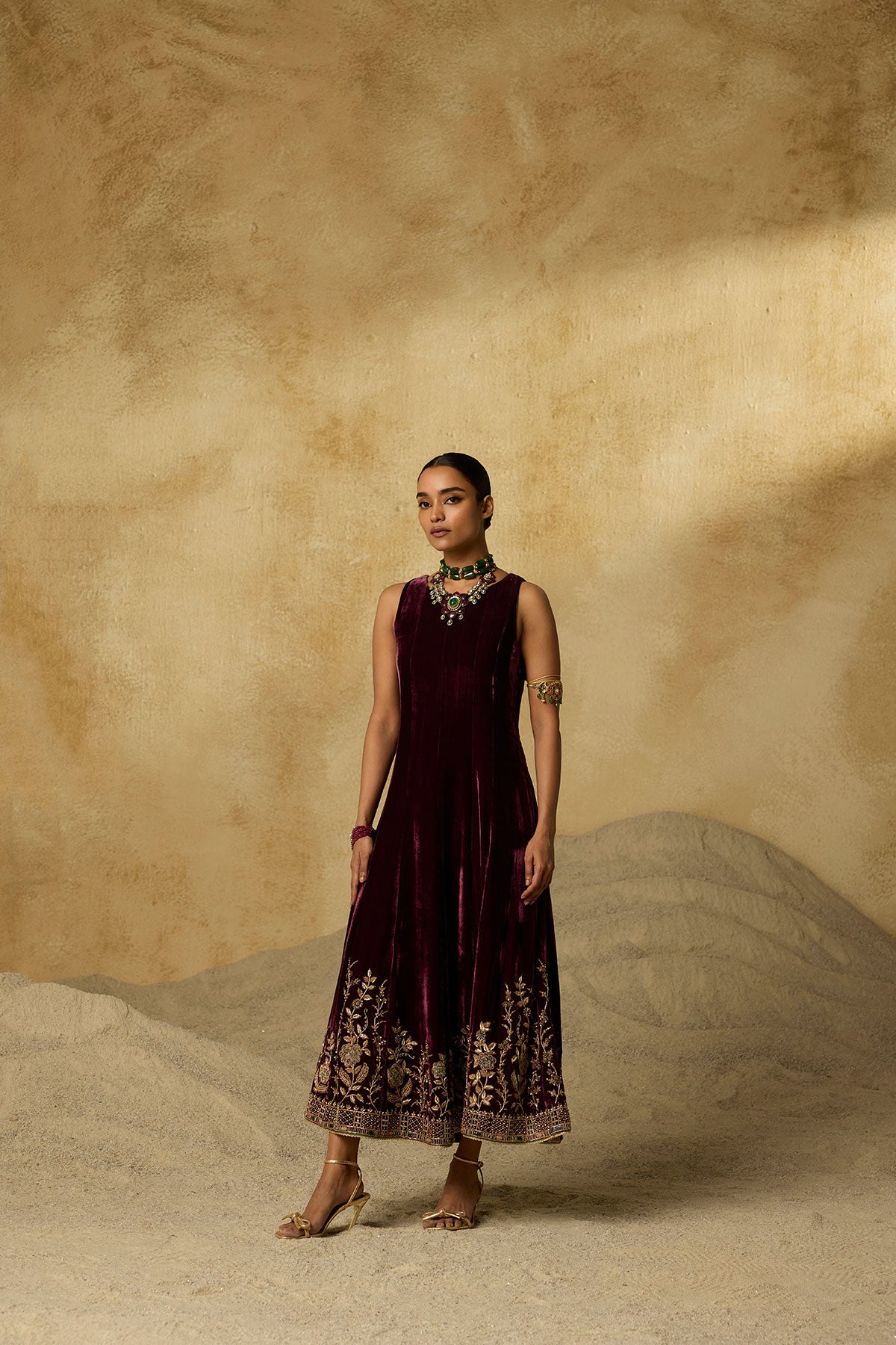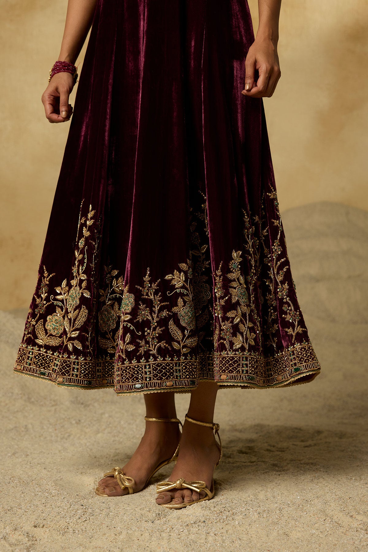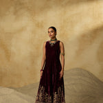 An ode to East meets West, our velvet dress in deep wine is anchored by a dramatic hem, where zardozi, aari, gemstones, sequins, cut dana, and dabka form intricate floral motifs. Perfect for intimate celebrations, it effortlessly bridges Indian and Western styling.