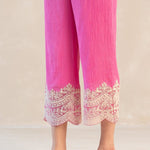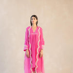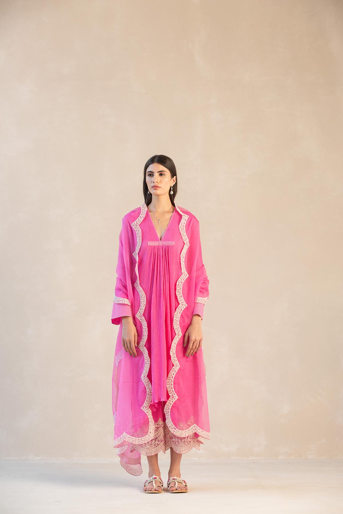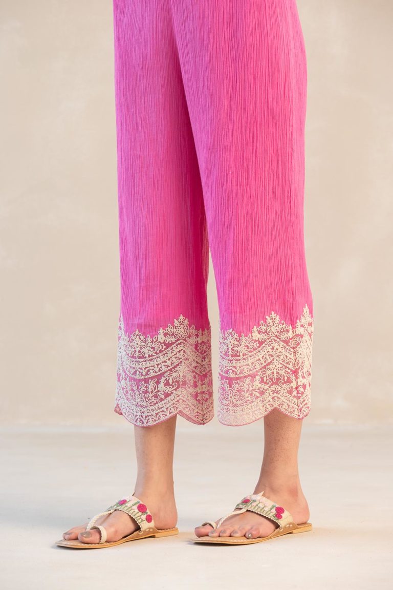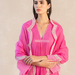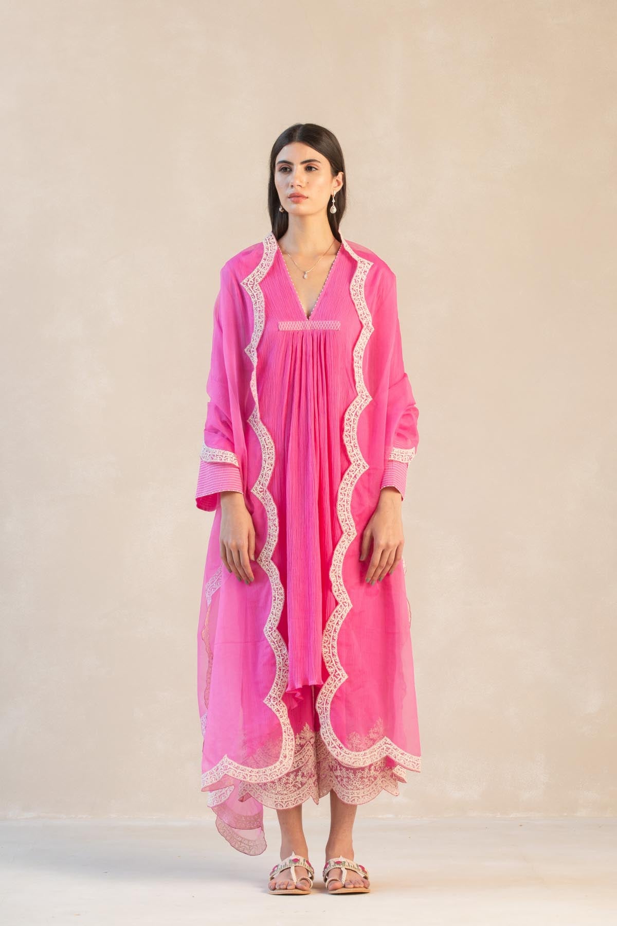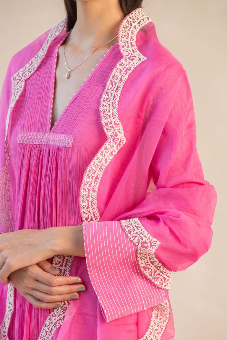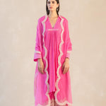 Something old, something new — this fuschia asymmetrical cotton gauze kurta with bell sleeves and a plunging neckline is traditional yet modern. The silhouette is its standout feature, while the drama has been reserved for the scalloped palazzos accentuated with contrast ecru thread. Add the wide scalloped embroidered organza dupatta for a traditional look or skip it for modern charm.