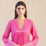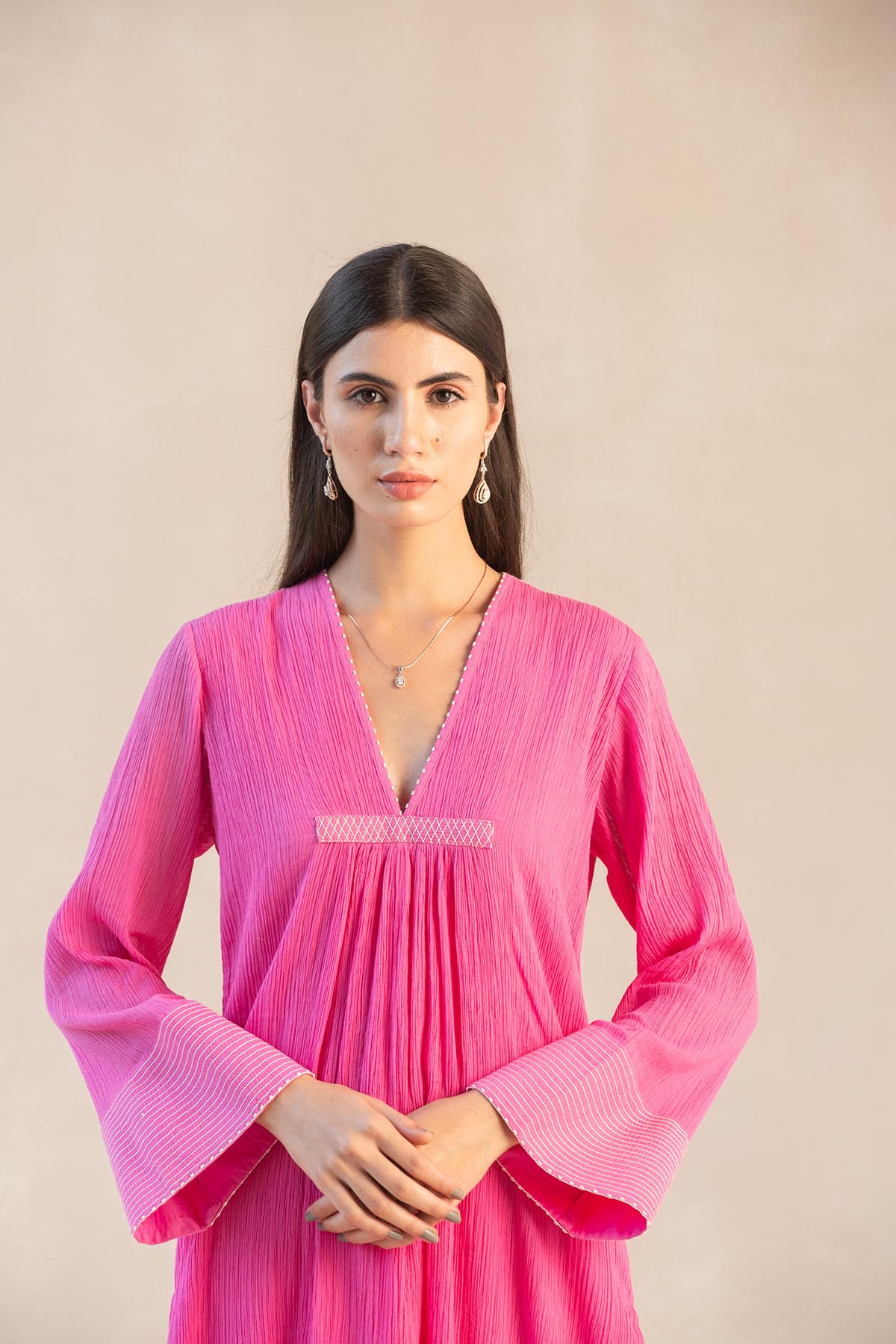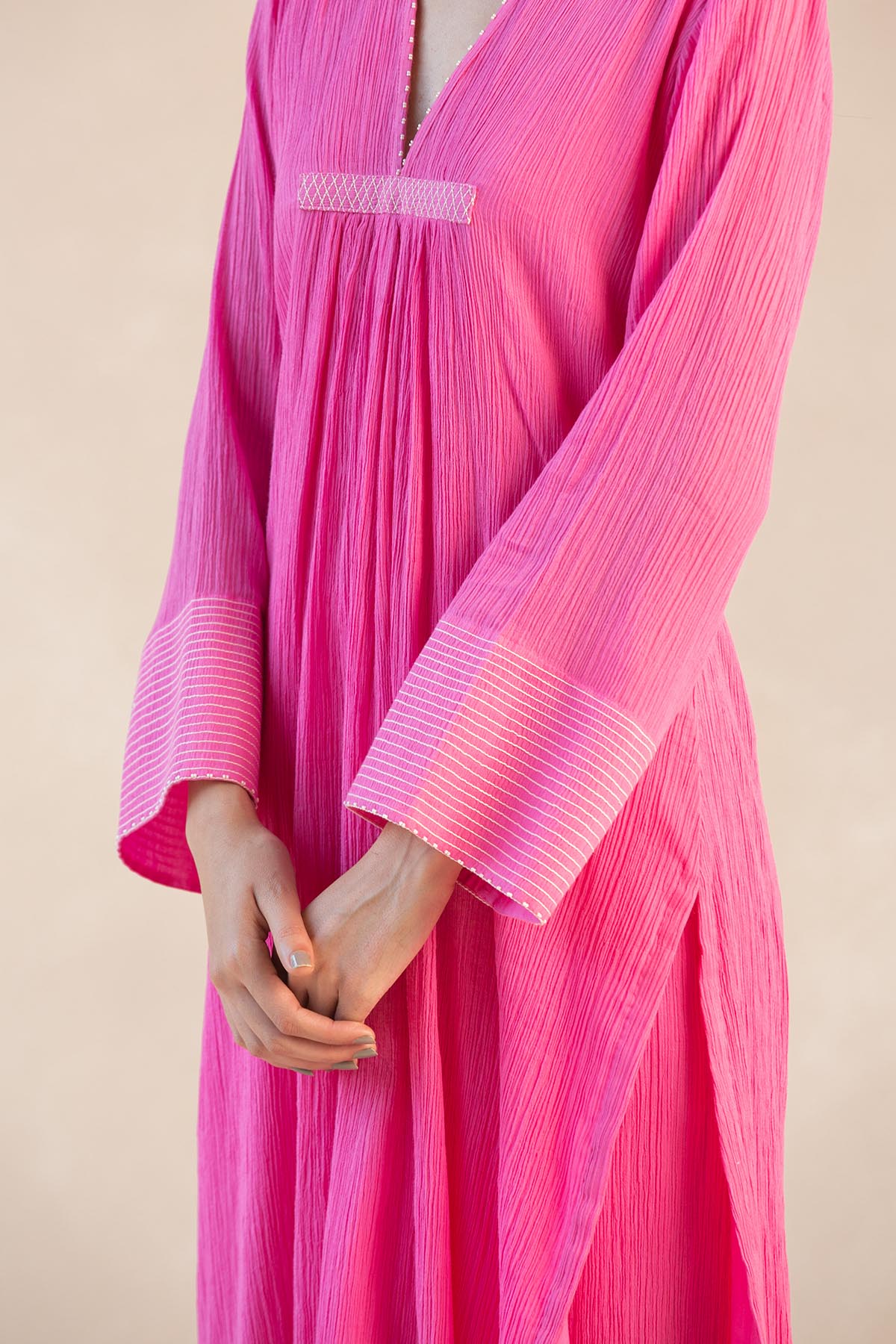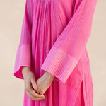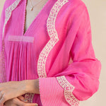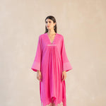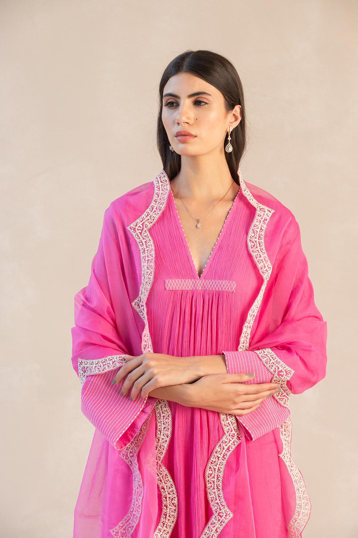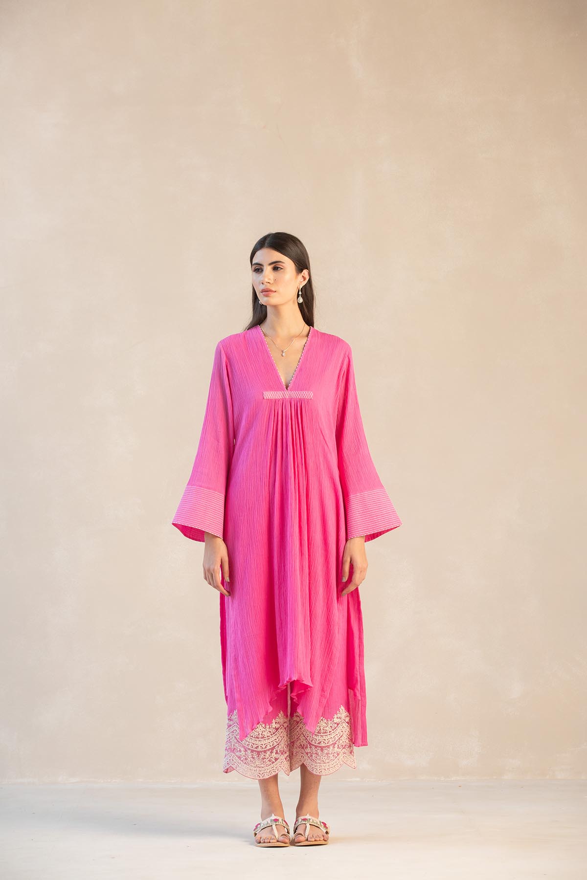 Something old, something new — this fuschia asymmetrical cotton gauze kurta with bell sleeves and a plunging neckline is traditional yet modern. The silhouette is its standout feature, while the drama has been reserved for the scalloped palazzos accentuated with contrast ecru thread. Add the wide scalloped embroidered organza dupatta for a traditional look or skip it for modern charm.