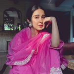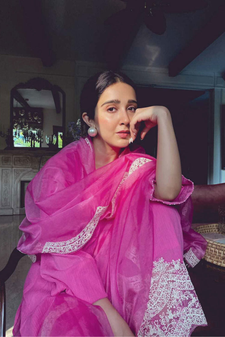 Something old, something new — this fuschia asymmetrical cotton gauze kurta with bell sleeves and a plunging neckline is traditional yet modern. The silhouette is its standout feature, while the drama has been reserved for the scalloped palazzos accentuated with contrast ecru thread. Add the wide scalloped embroidered organza dupatta for a traditional look or skip it for modern charm.