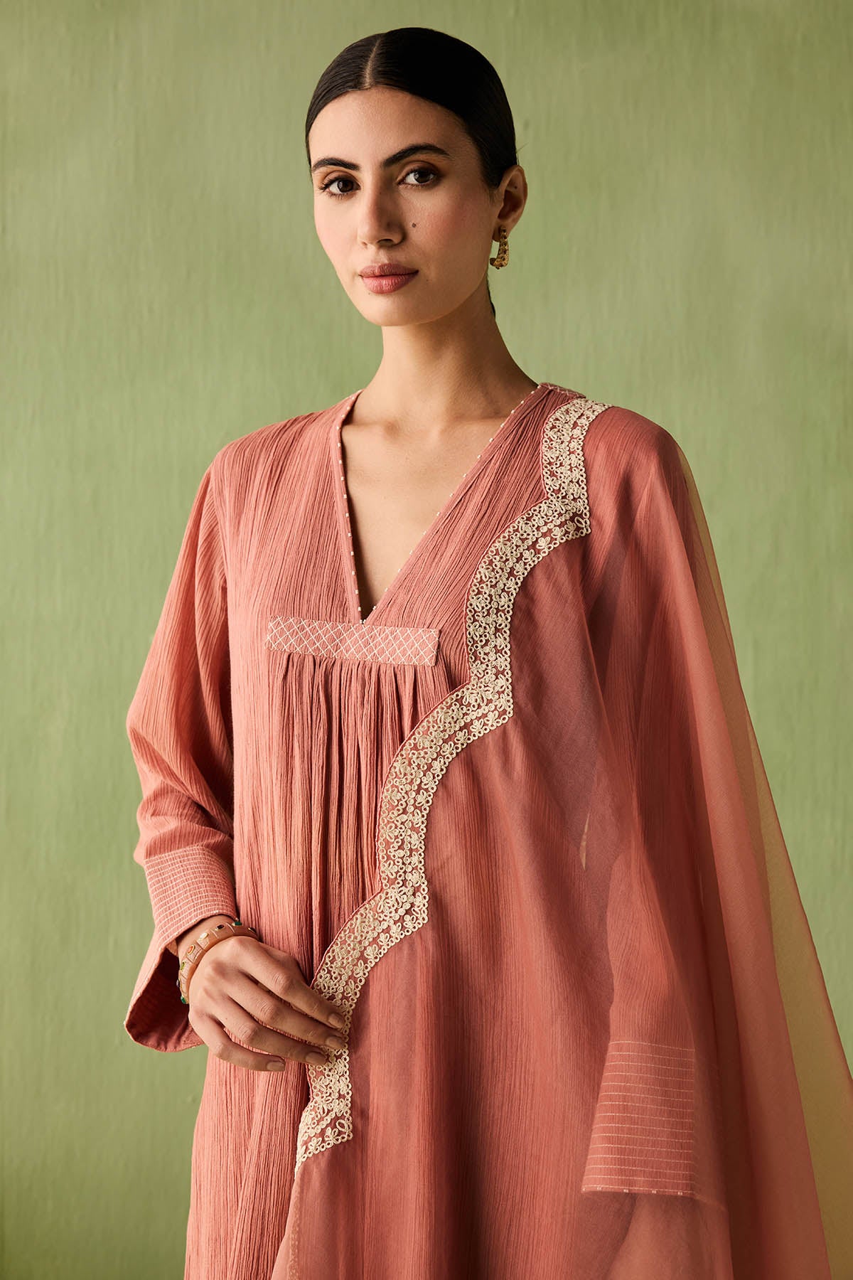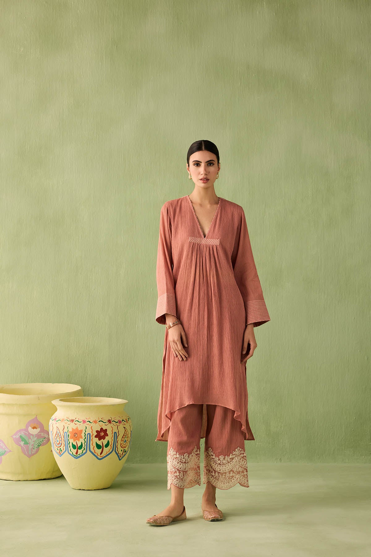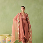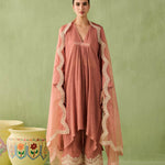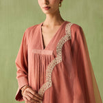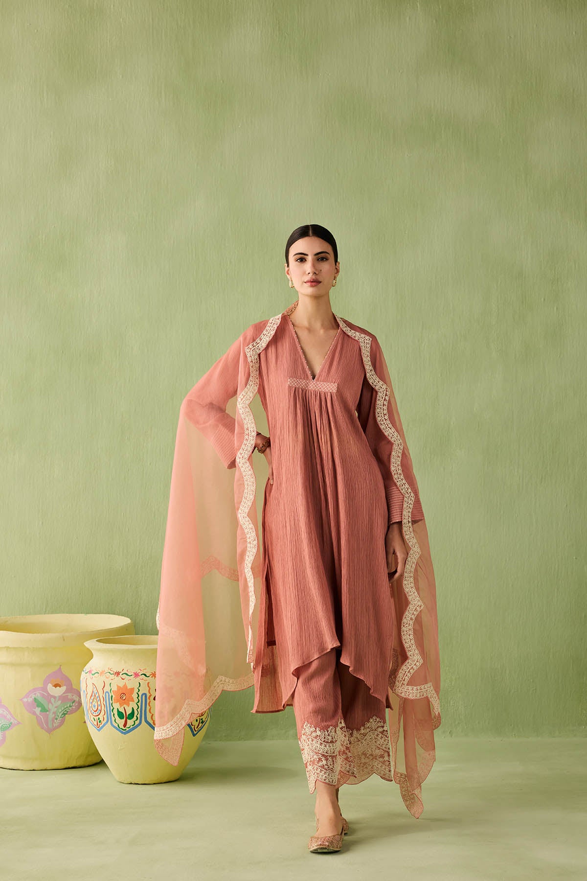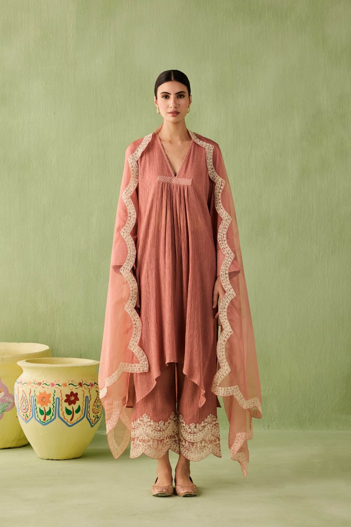 Something old, something new — this rust asymmetrical cotton gauze kurta with bell sleeves and a plunging neckline is traditional yet modern. The silhouette is its standout feature, while the drama has been reserved for the scalloped palazzos accentuated with contrast ecru thread. Add the wide scalloped embroidered organza dupatta for a traditional look or skip it for modern charm.