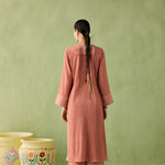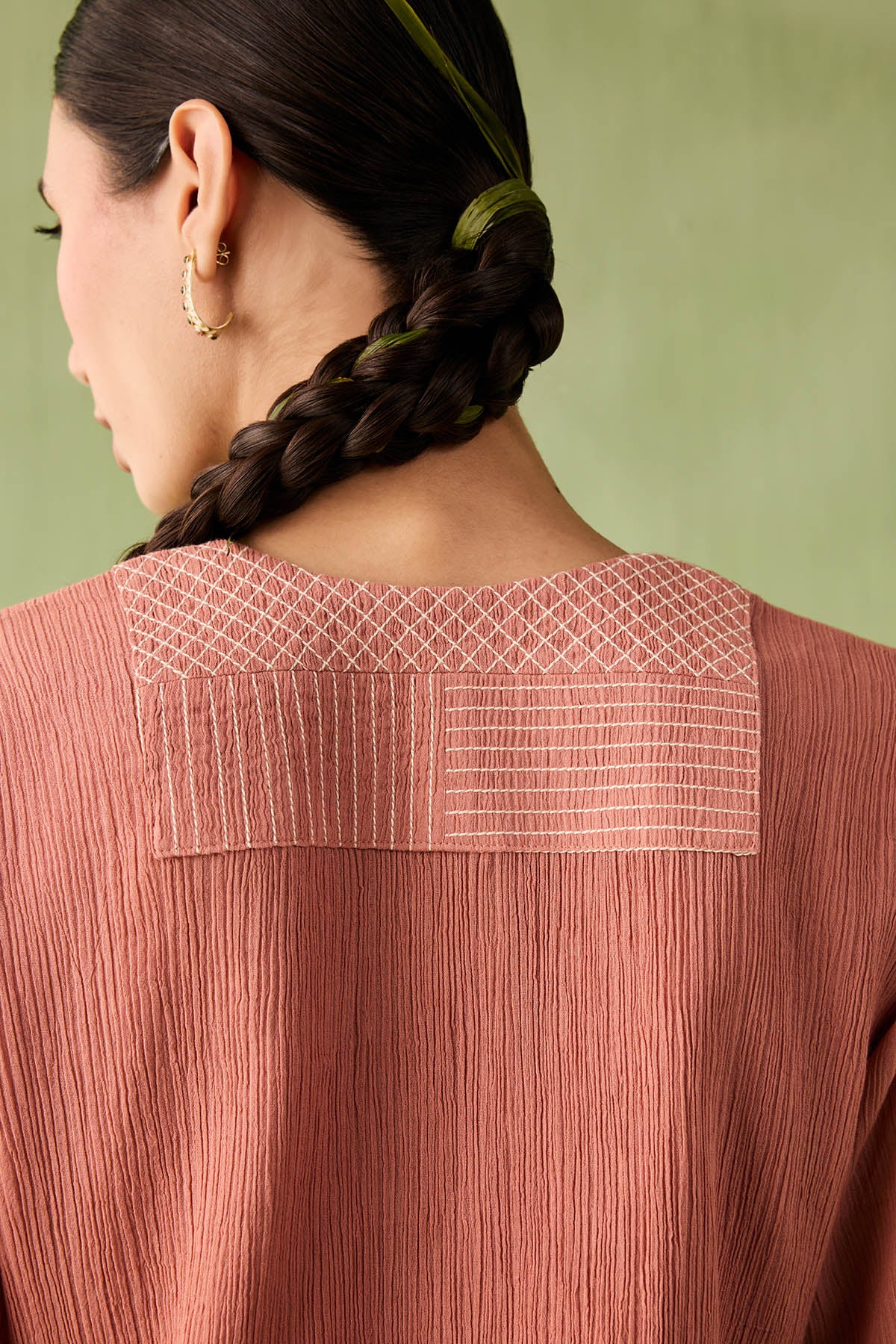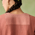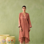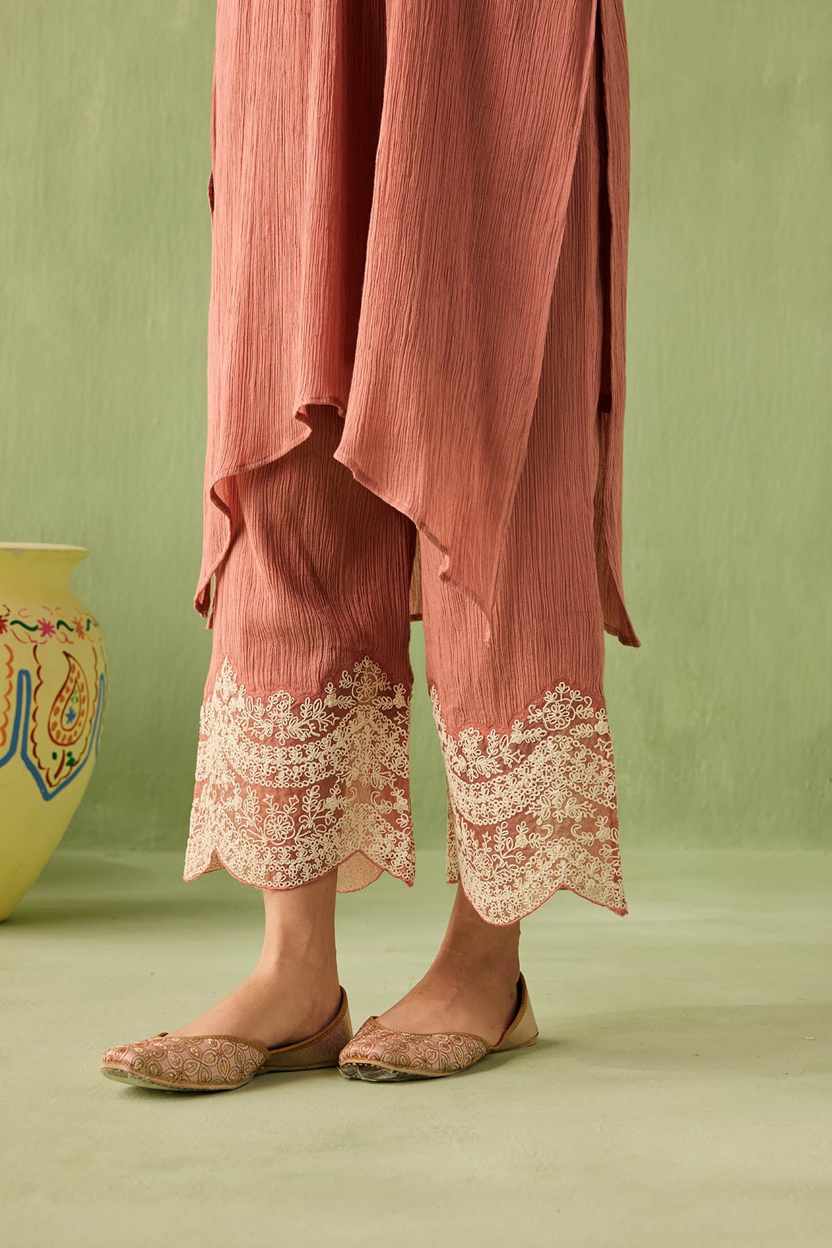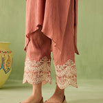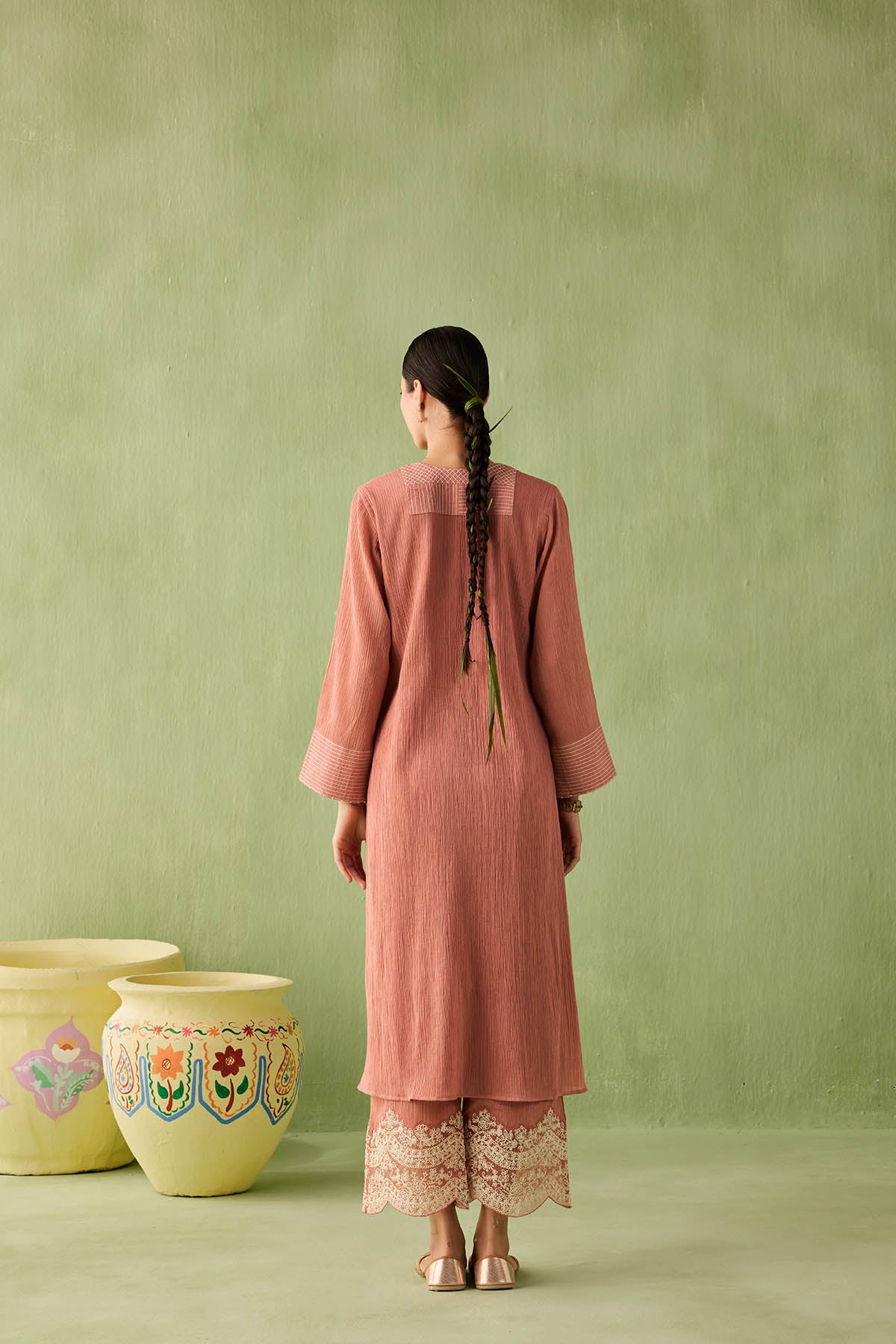 Something old, something new — this rust asymmetrical cotton gauze kurta with bell sleeves and a plunging neckline is traditional yet modern. The silhouette is its standout feature, while the drama has been reserved for the scalloped palazzos accentuated with contrast ecru thread. Add the wide scalloped embroidered organza dupatta for a traditional look or skip it for modern charm.