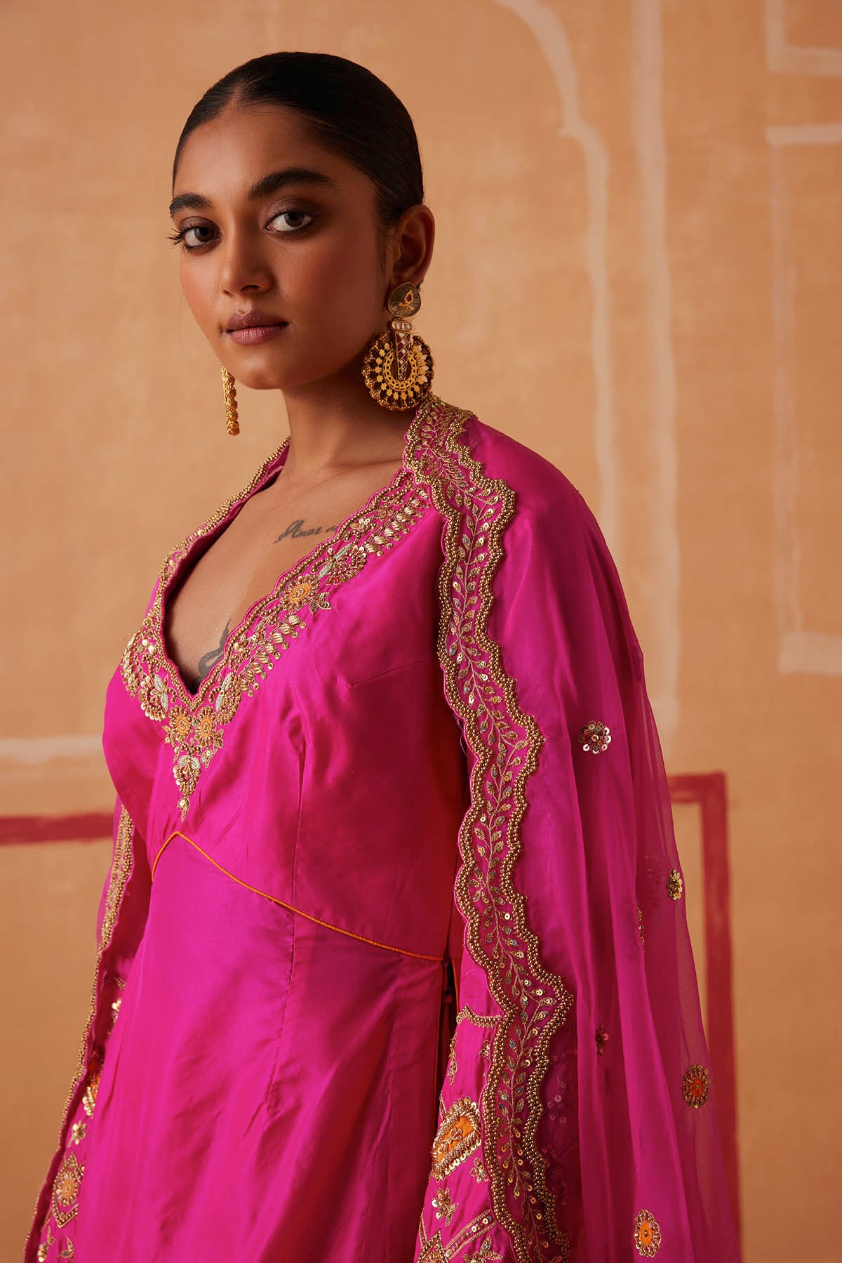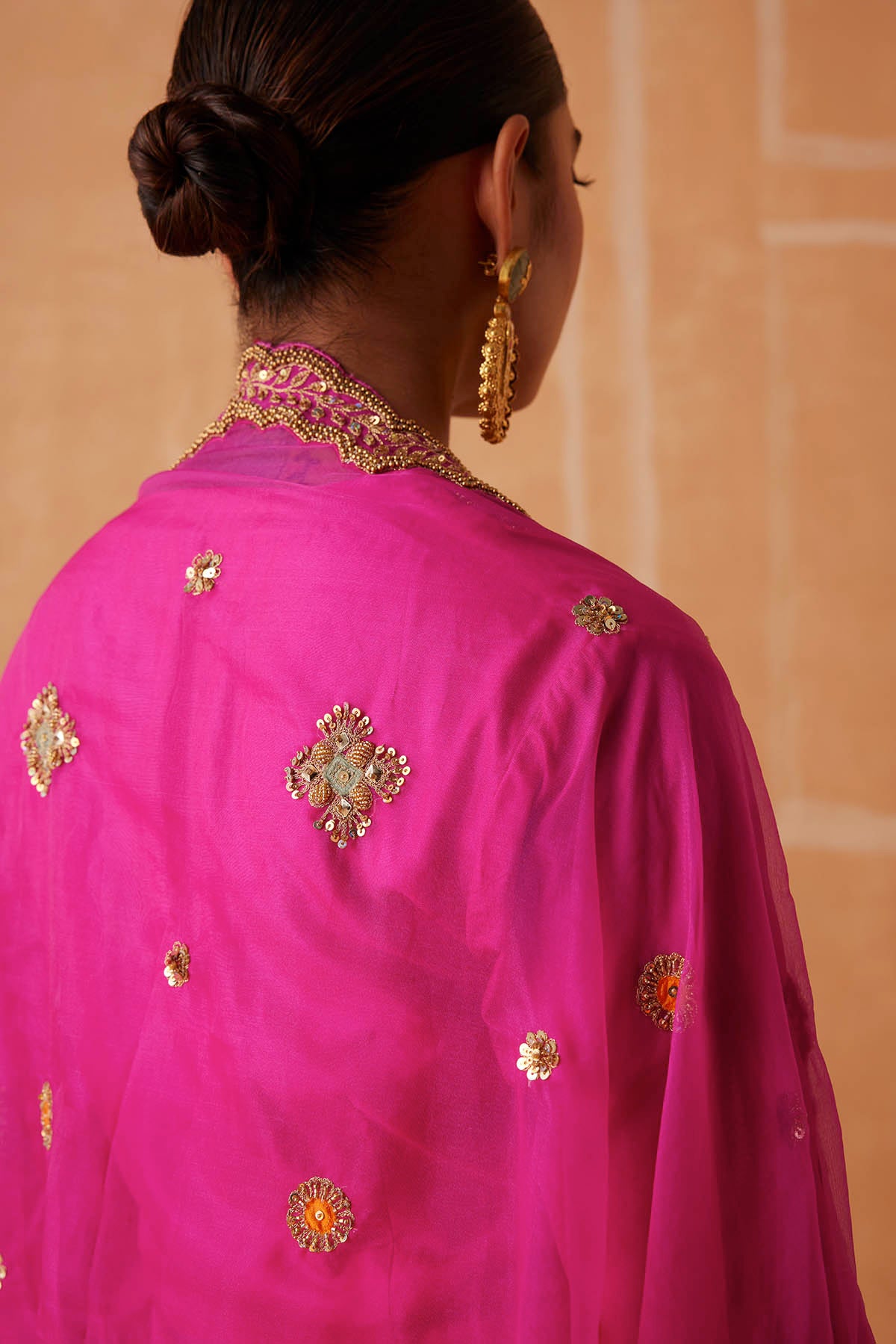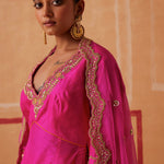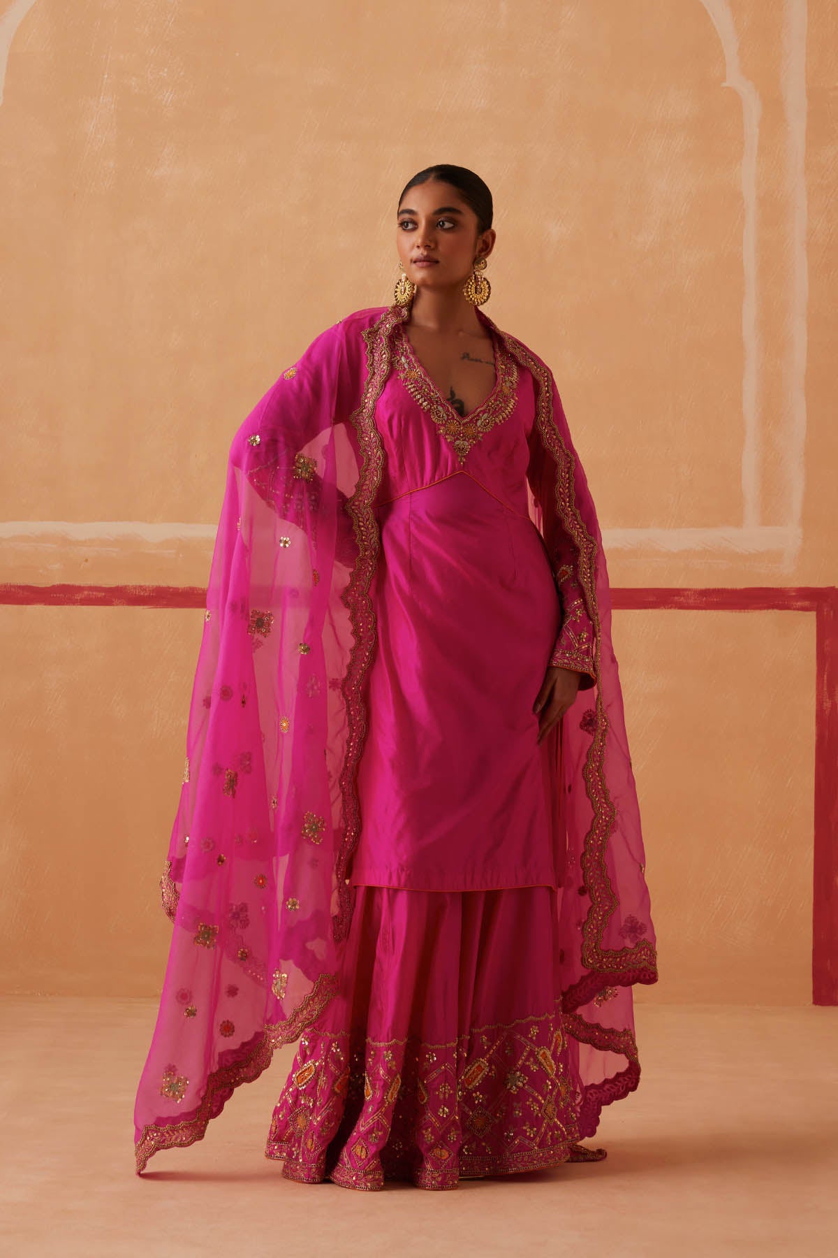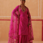 An all-time favorite, this classic gharara set is a wardrobe must-have to make a statement on any occasion. The ethereal fuchsia base is accentuated with contrasting floral appliqué patches that create a sophisticated yet playful look. The voluminous gharara adds a touch of drama while the scalloped dupatta completes the look.