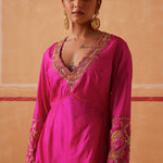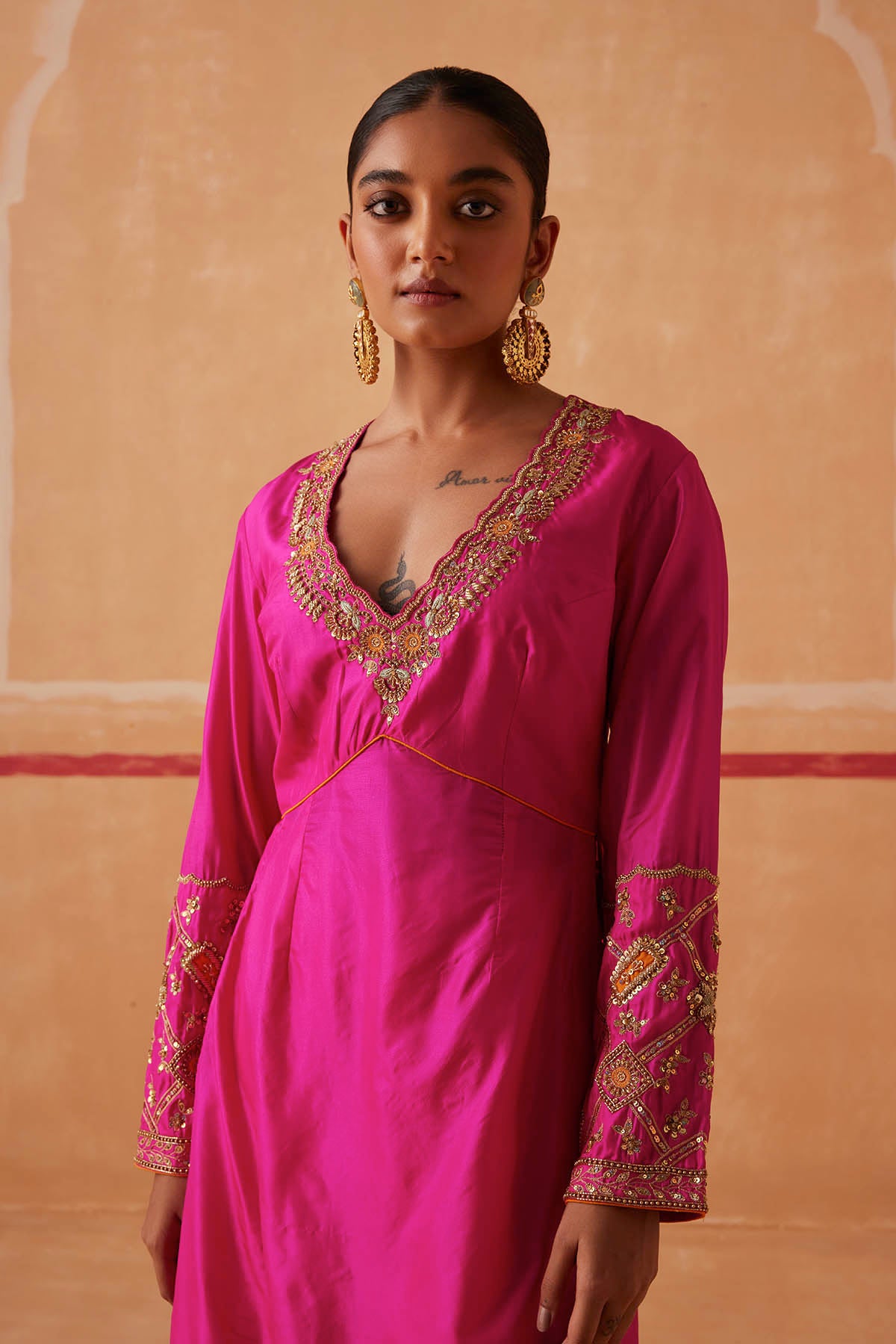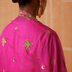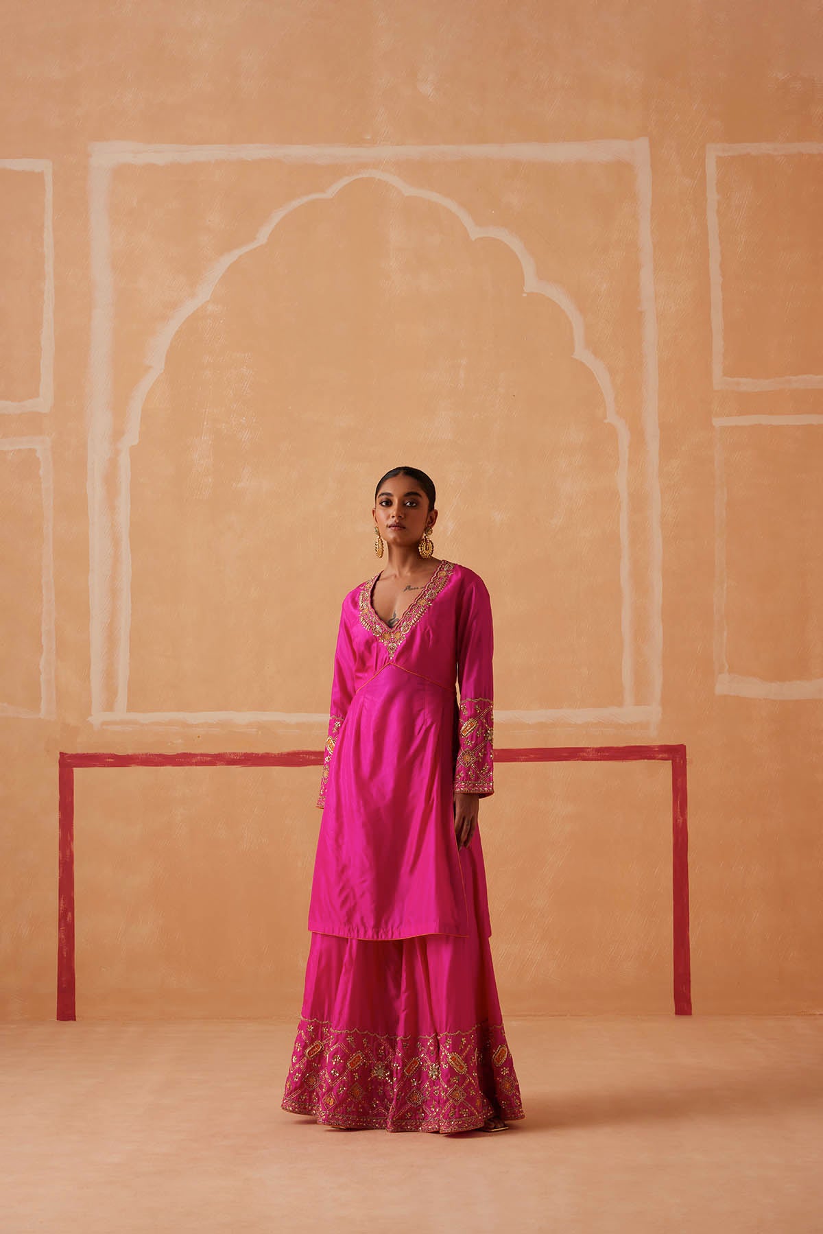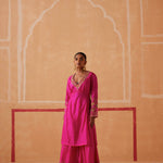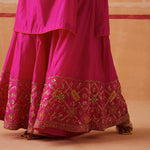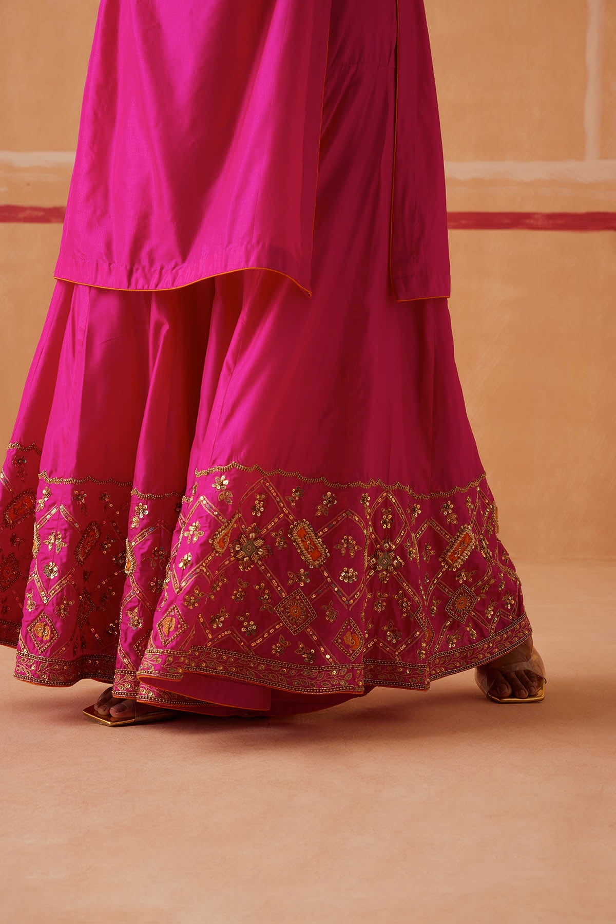 An all-time favorite, this classic gharara set is a wardrobe must-have to make a statement on any occasion. The ethereal fuchsia base is accentuated with contrasting floral appliqué patches that create a sophisticated yet playful look. The voluminous gharara adds a touch of drama while the scalloped dupatta completes the look.