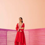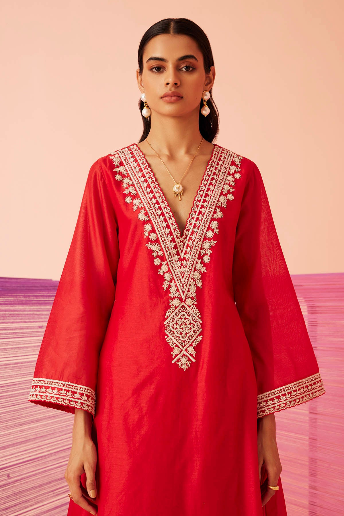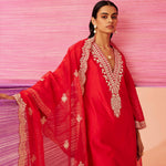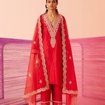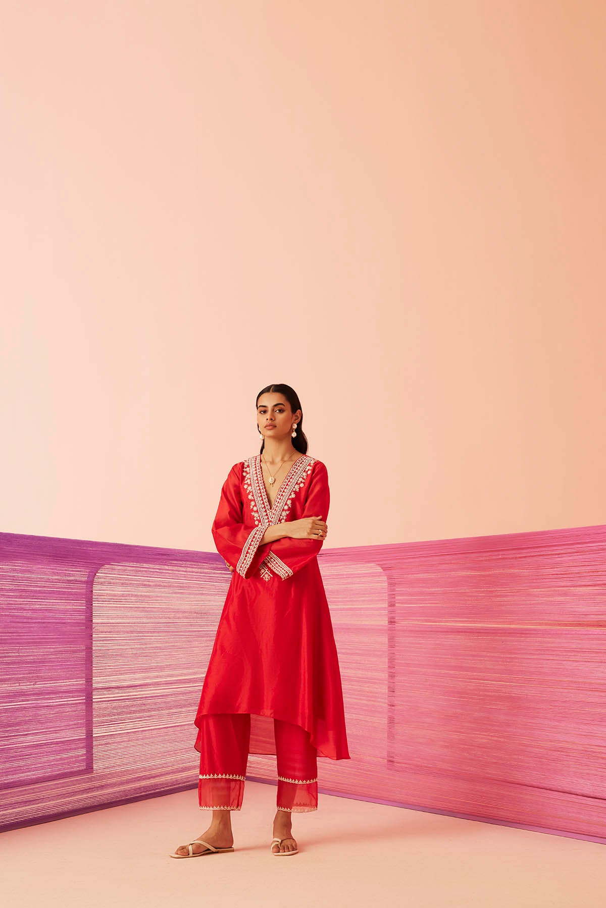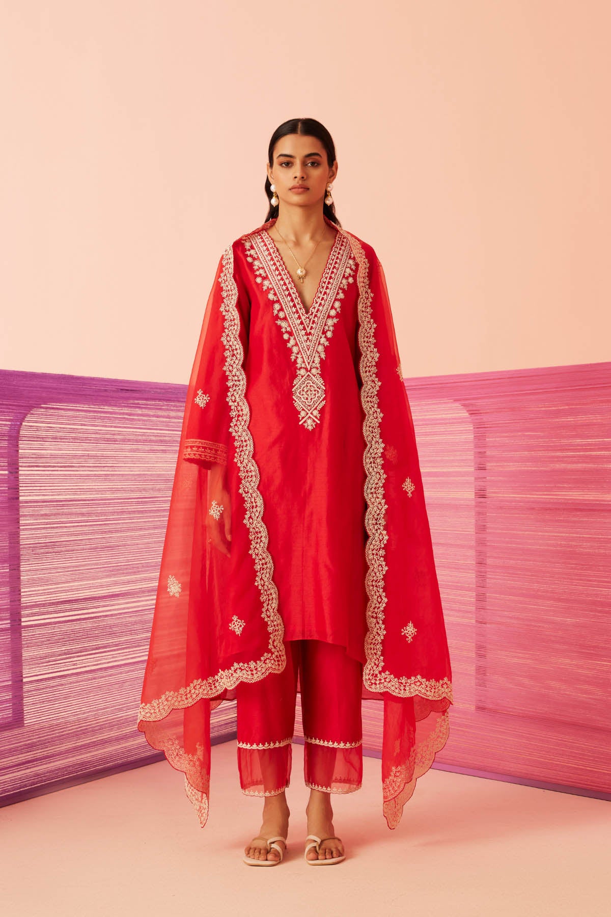 This asymmetrical high-low kurta set is a festive favourite with its intricate dori work, aari embroidery, and embellishments of pearls, sequins, and beads. The outfit is perfect for a day to night look and makes for an effortlessly versatile addition to your wardrobe.