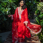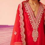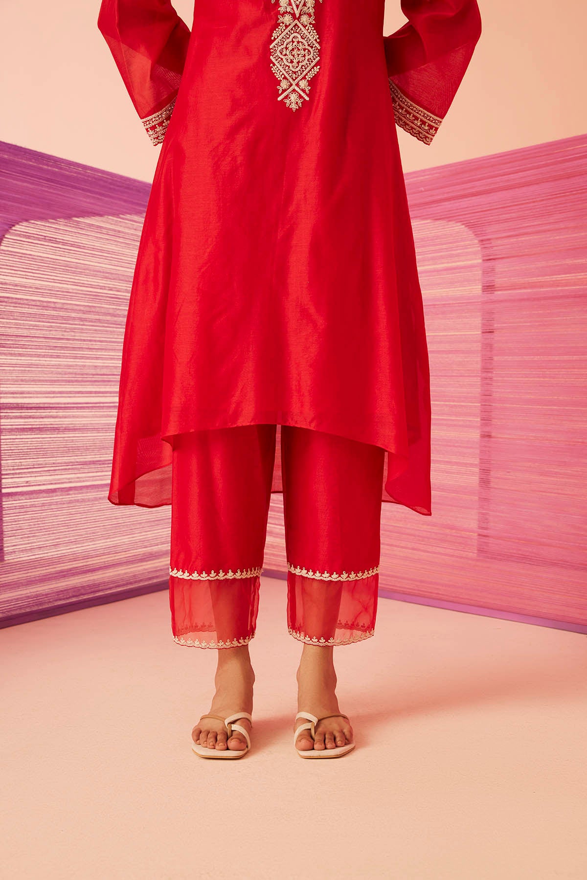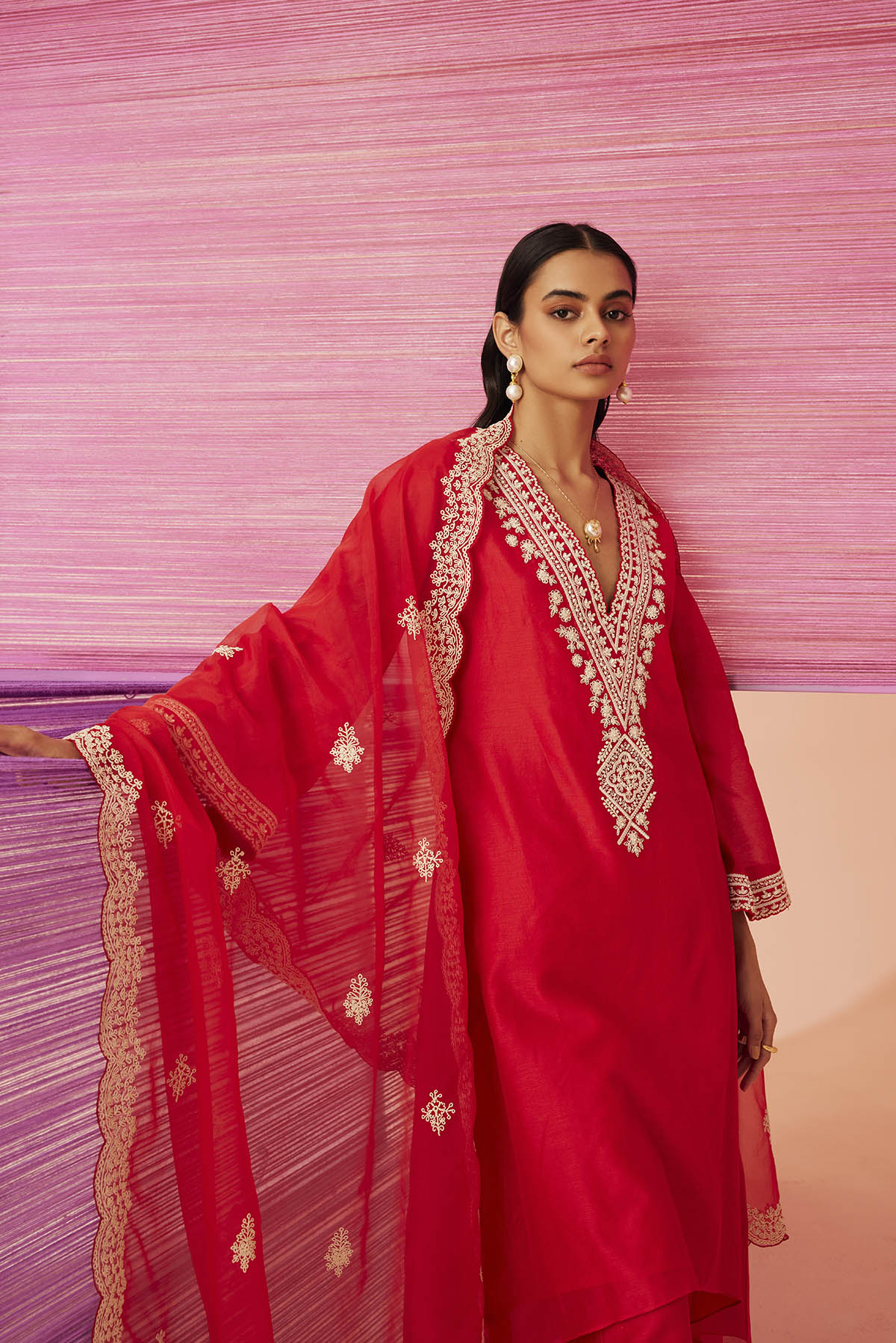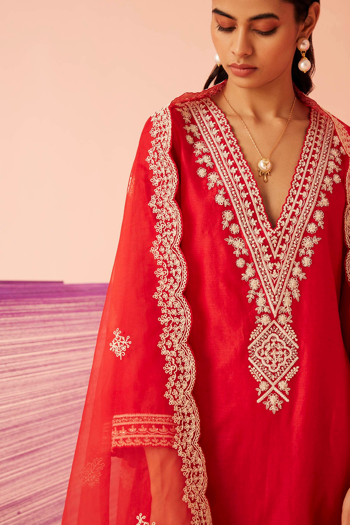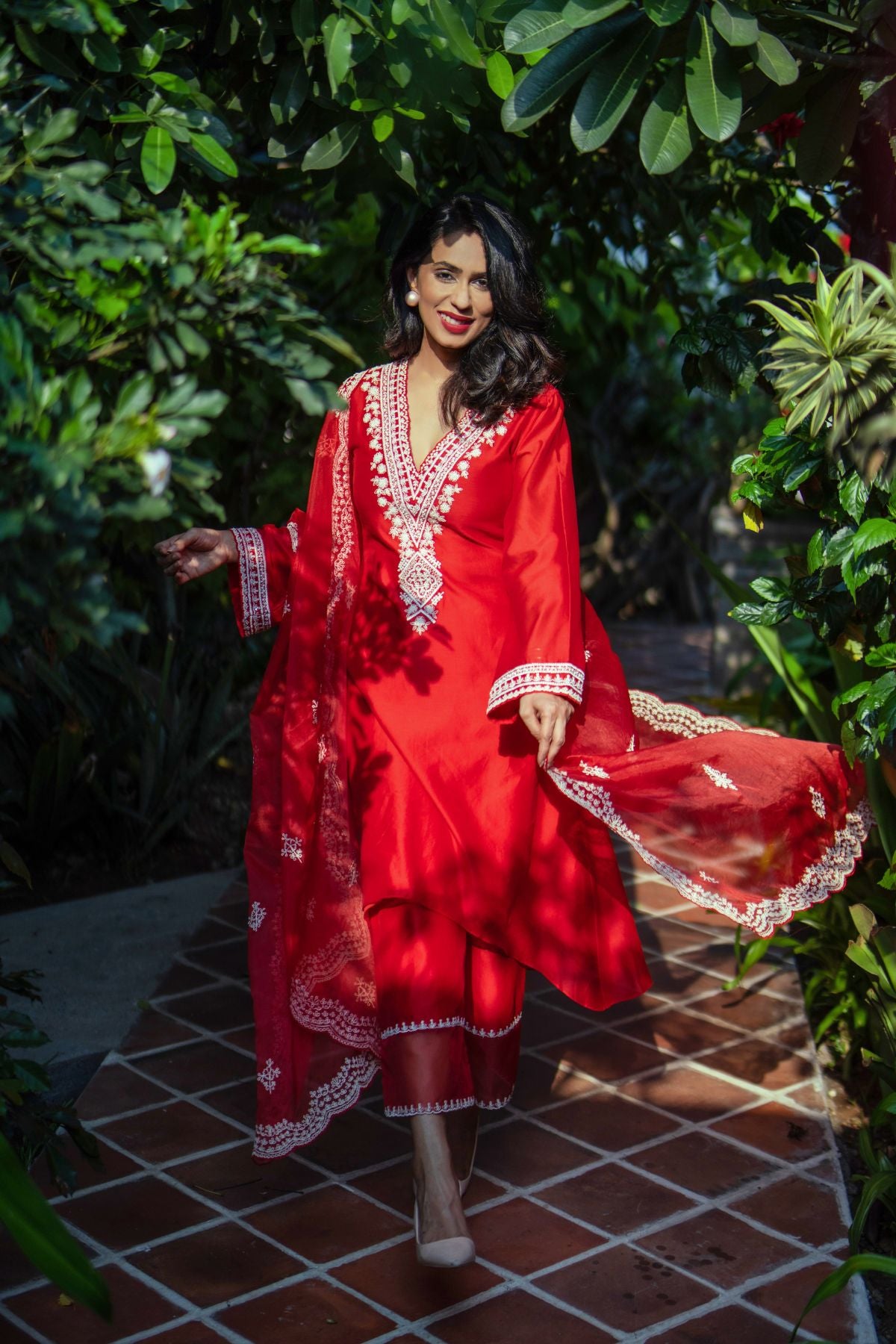 This asymmetrical high-low kurta set is a festive favourite with its intricate dori work, aari embroidery, and embellishments of pearls, sequins, and beads. The outfit is perfect for a day to night look and makes for an effortlessly versatile addition to your wardrobe.