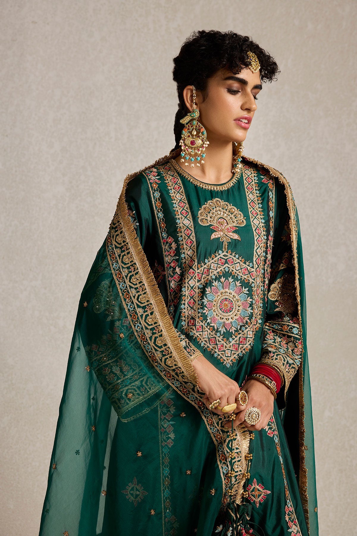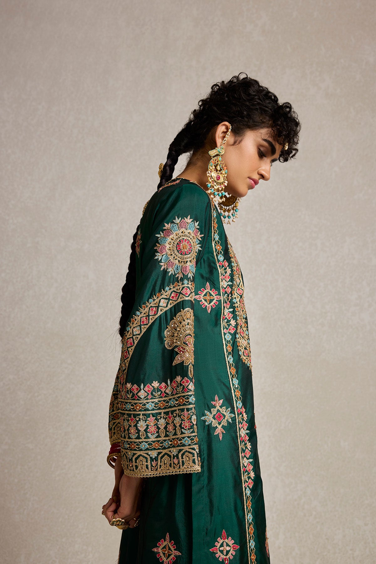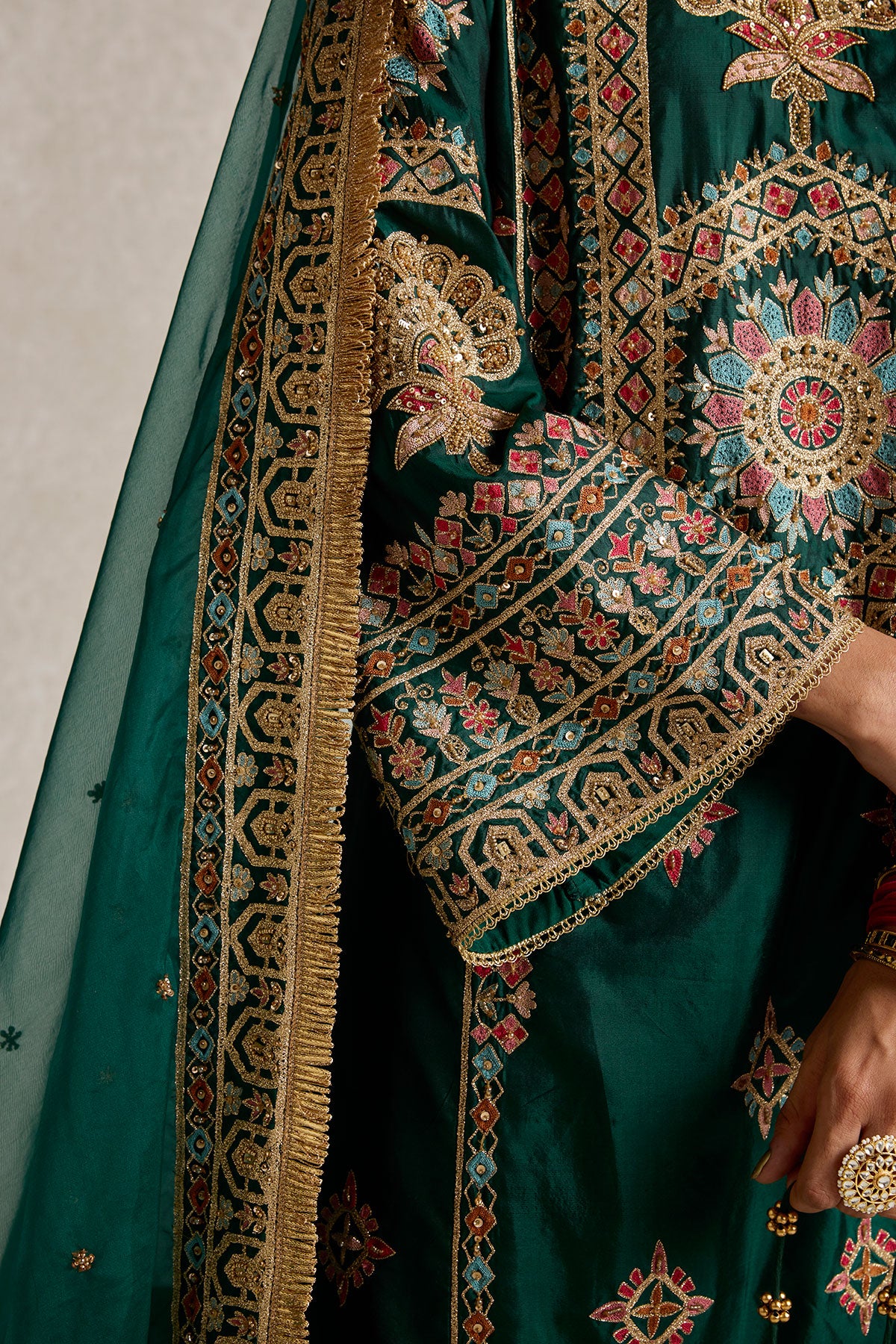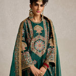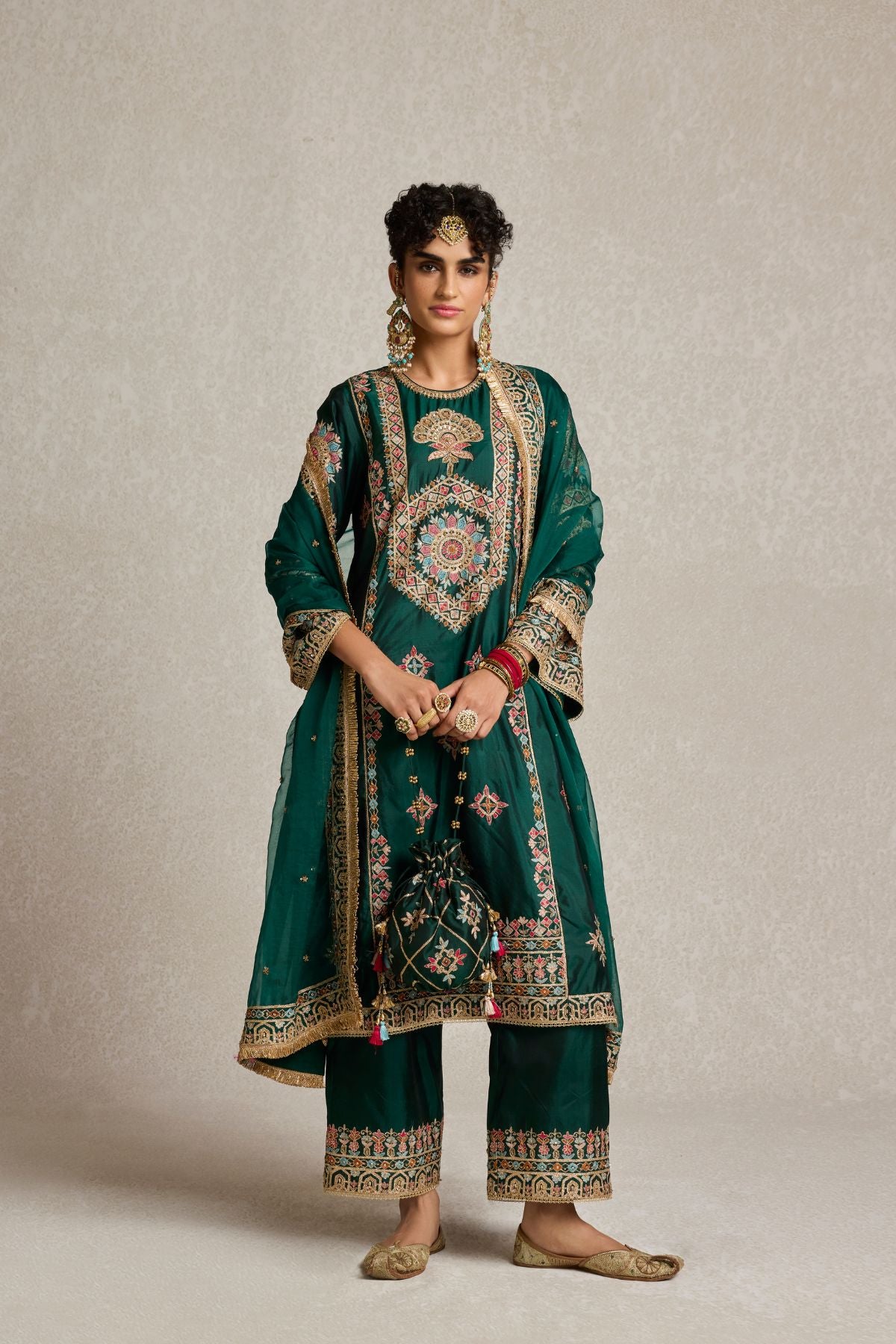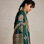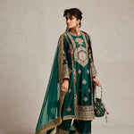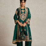 Lush, deep bottle green pure silk adorned with intricate aari, kiran dori, sitara, and beadwork embroidery makes this kurta set a masterpiece of traditional artistry. The fine detailing on both the kurta and the lounge pants brings together classic aesthetics and modern comfort, making it a versatile piece for your festive wardrobe.
