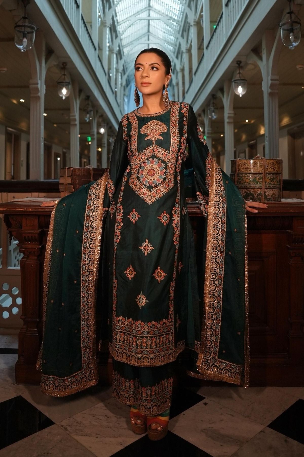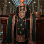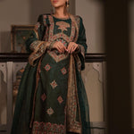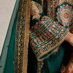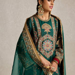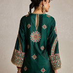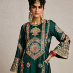 Lush, deep bottle green pure silk adorned with intricate aari, kiran dori, sitara, and beadwork embroidery makes this kurta set a masterpiece of traditional artistry. The fine detailing on both the kurta and the lounge pants brings together classic aesthetics and modern comfort, making it a versatile piece for your festive wardrobe.