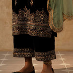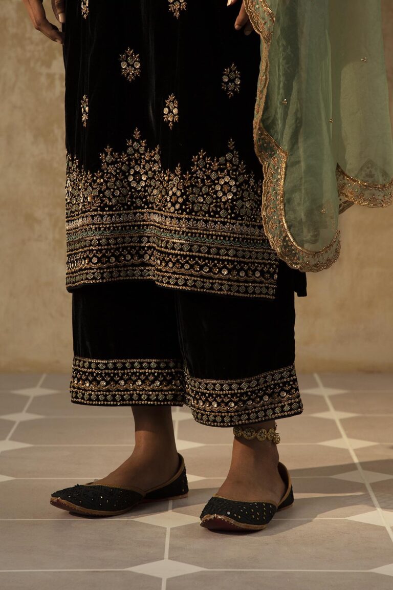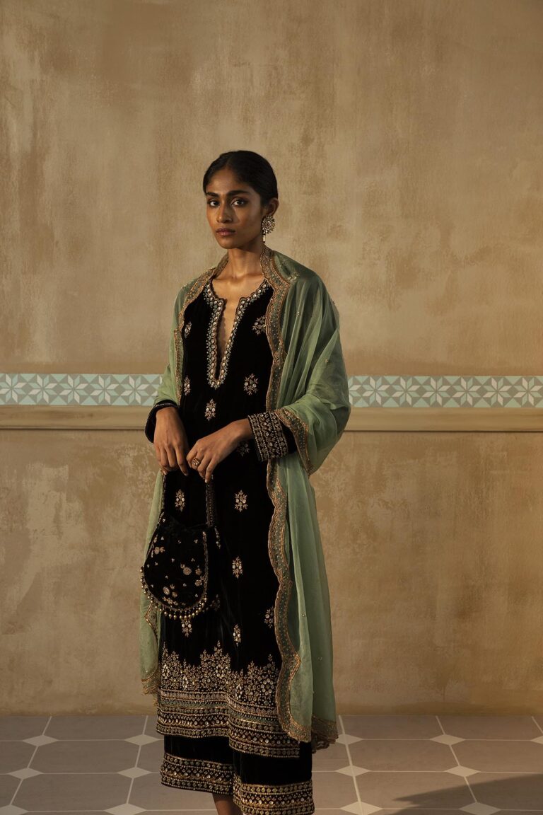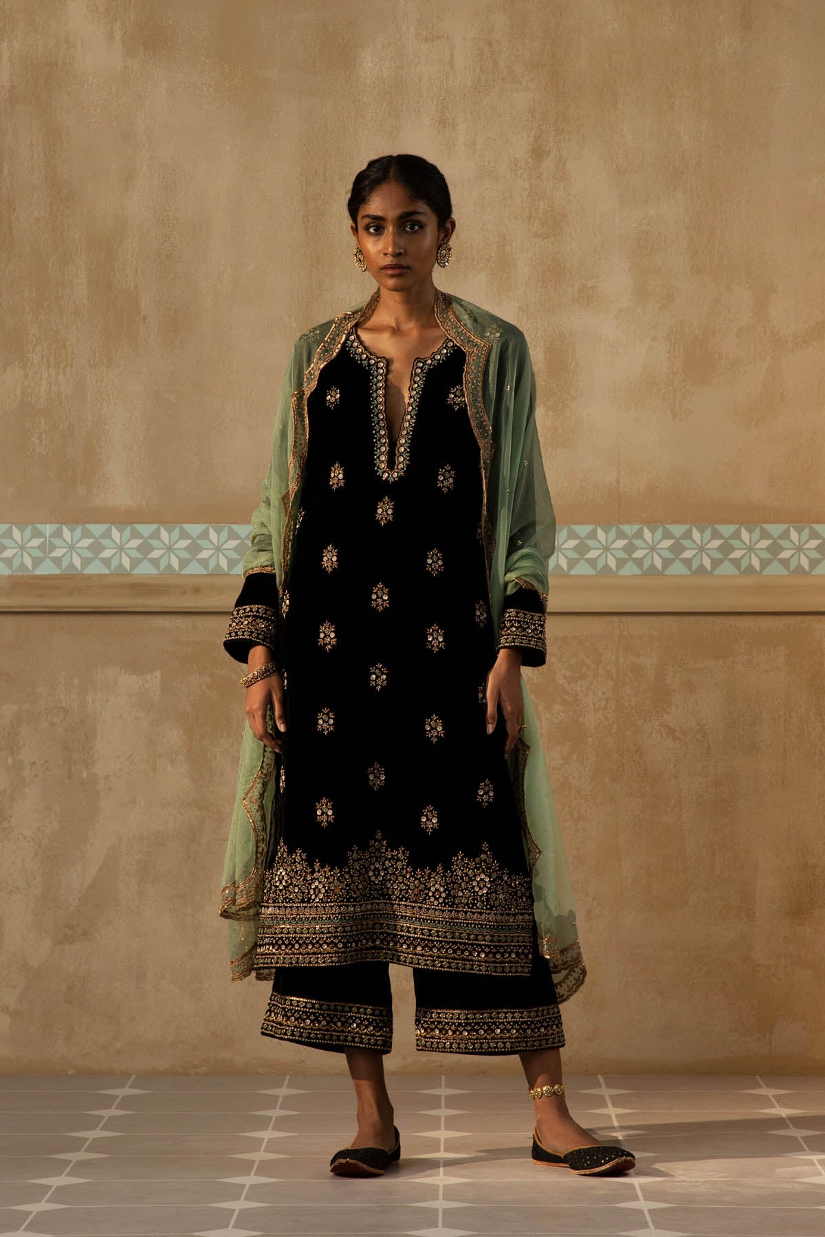 Don head-to-toe velvet with this black straight silk velvet kurta and palazzo set. The zardozi hand-embroidered motifs spread across the kurta are the hero of this piece, and find their inspiration in the royal robes of Mughal queens. Add drama to this look with our contrast sea green organza dupatta that is intricately embroidered and scalloped to perfection.