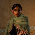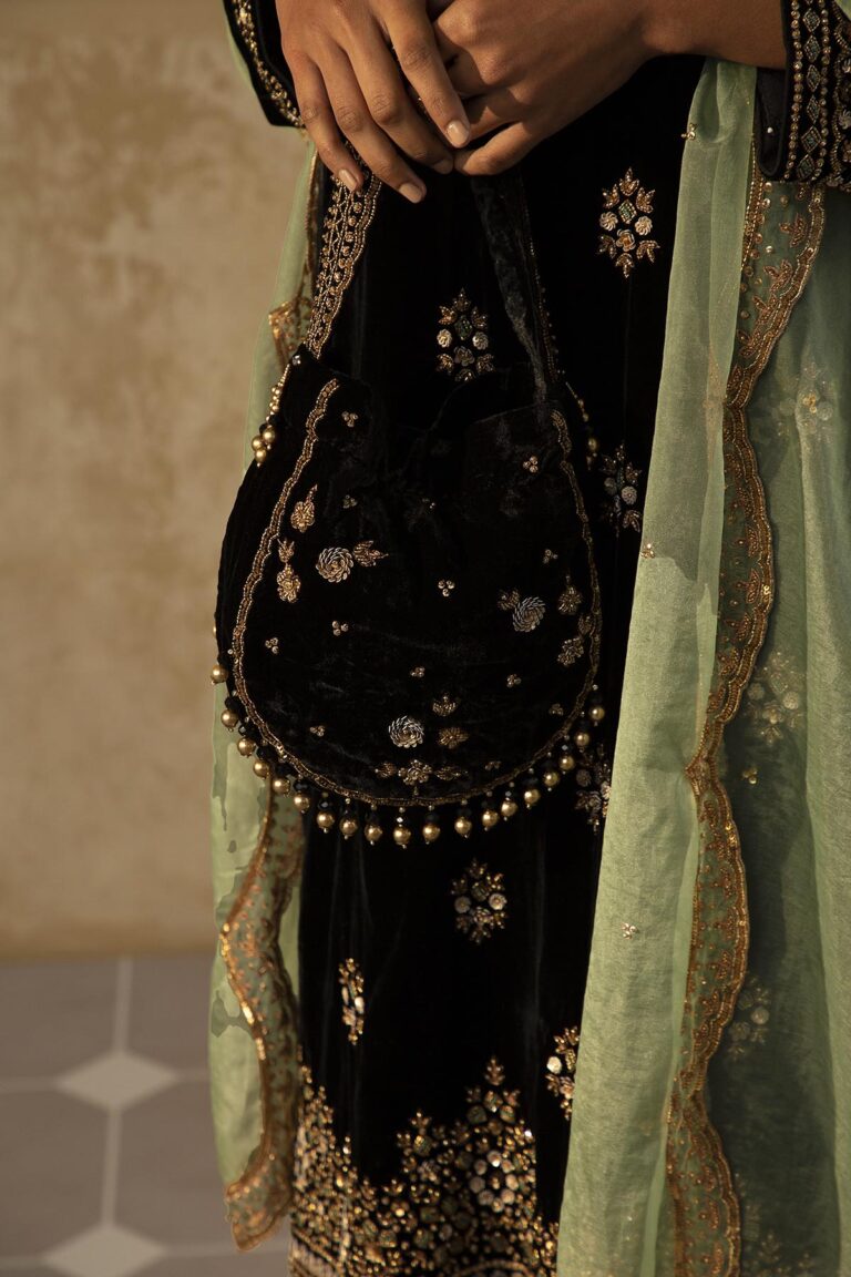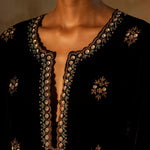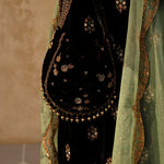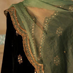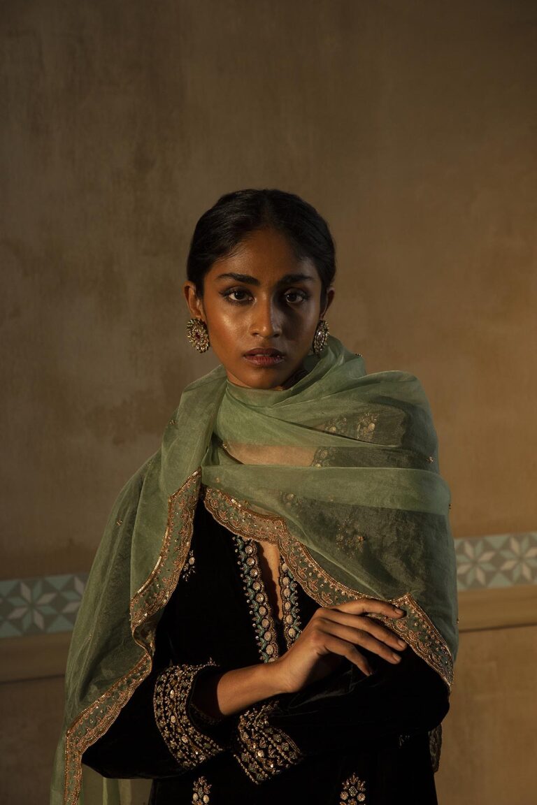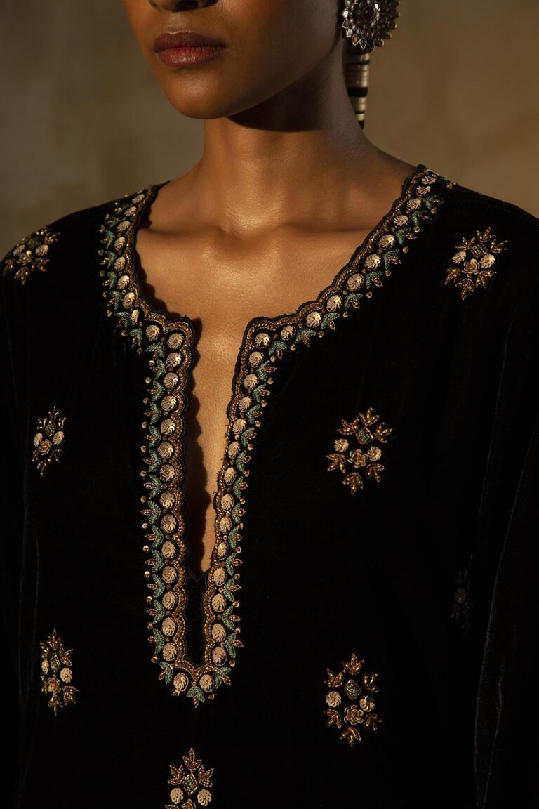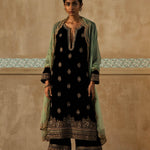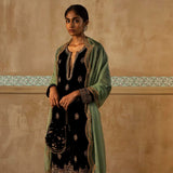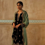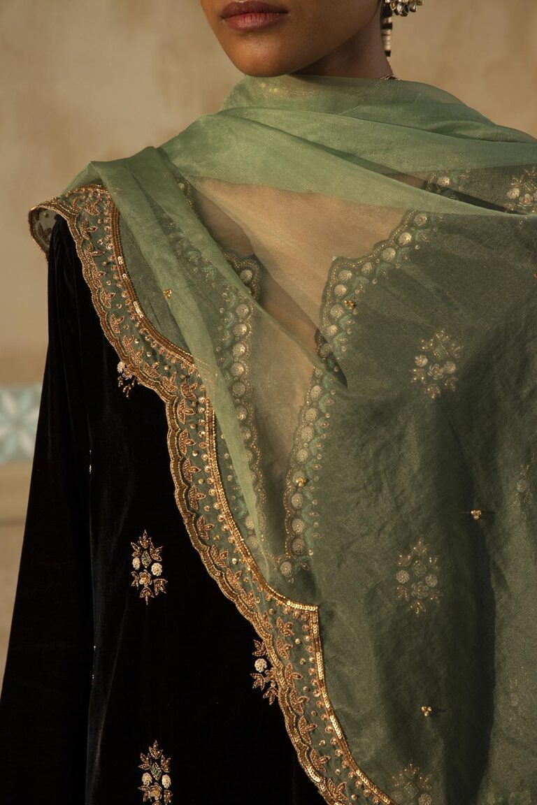 Don head-to-toe velvet with this black straight silk velvet kurta and palazzo set. The zardozi hand-embroidered motifs spread across the kurta are the hero of this piece, and find their inspiration in the royal robes of Mughal queens. Add drama to this look with our contrast sea green organza dupatta that is intricately embroidered and scalloped to perfection.