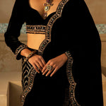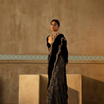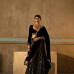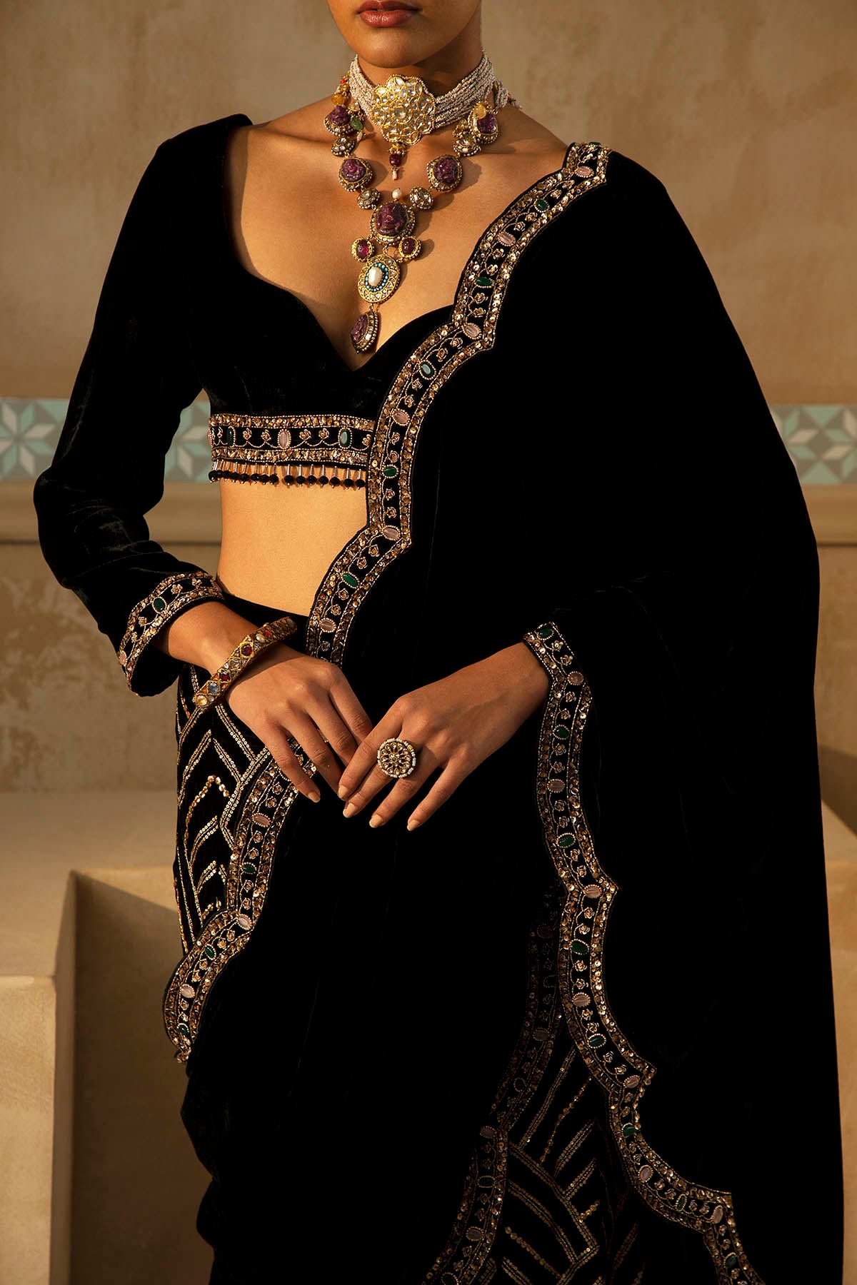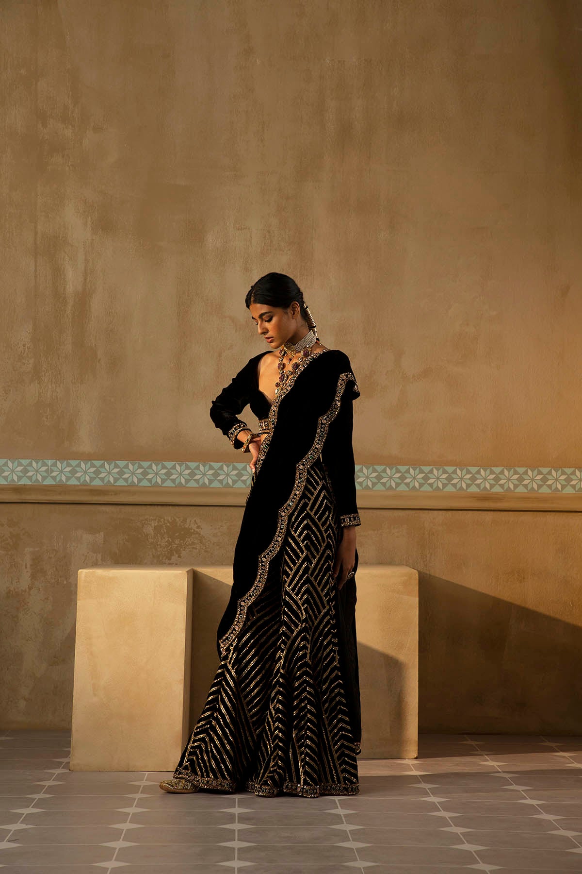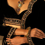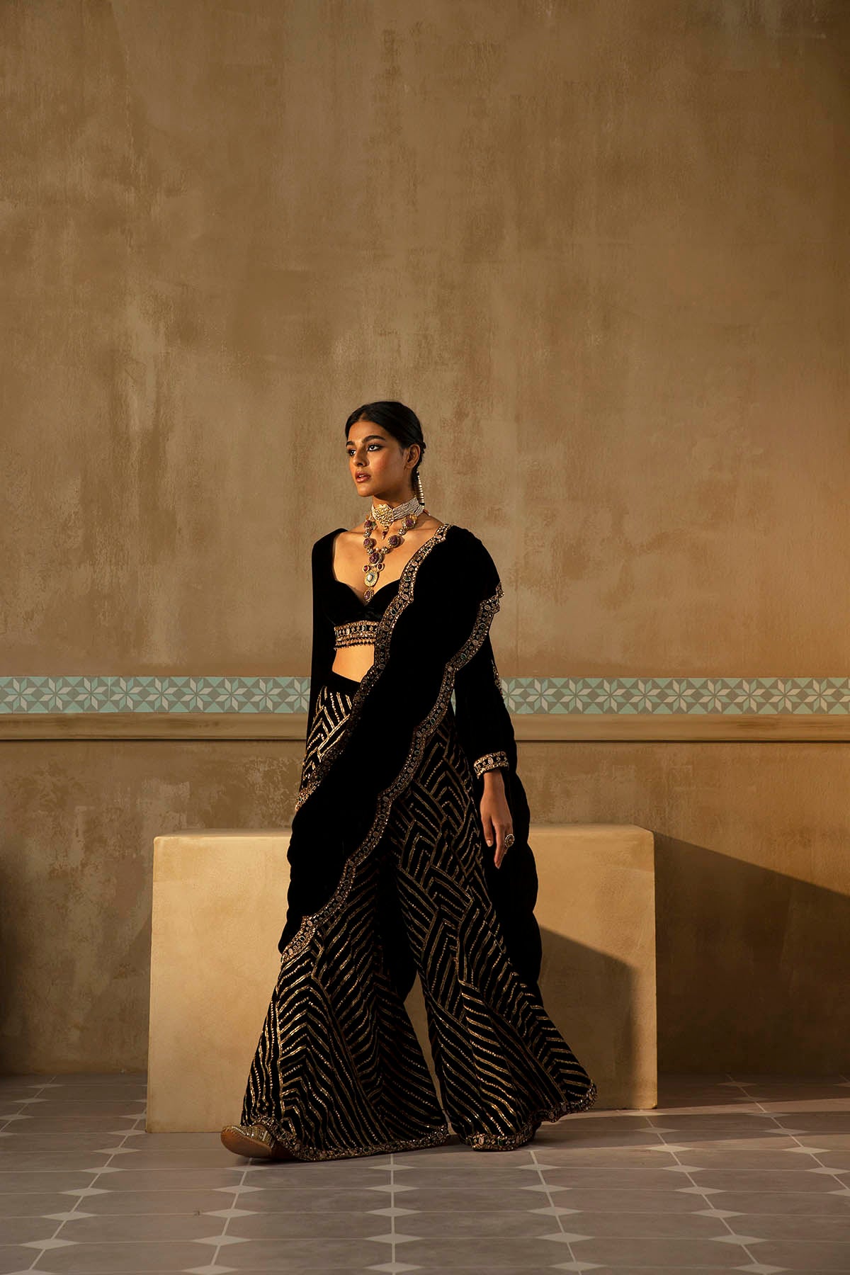 Borrowed from the past – this season, we revisit the old-world sharara silhouette to reimagine it for present-day festivities. The result is our hero silhouette for the season. A draped silk velvet take on the sharara paired with a matching blouse and scalloped dupatta, accentuated with semi-precious embellishments and antique gold embroideries.