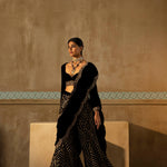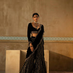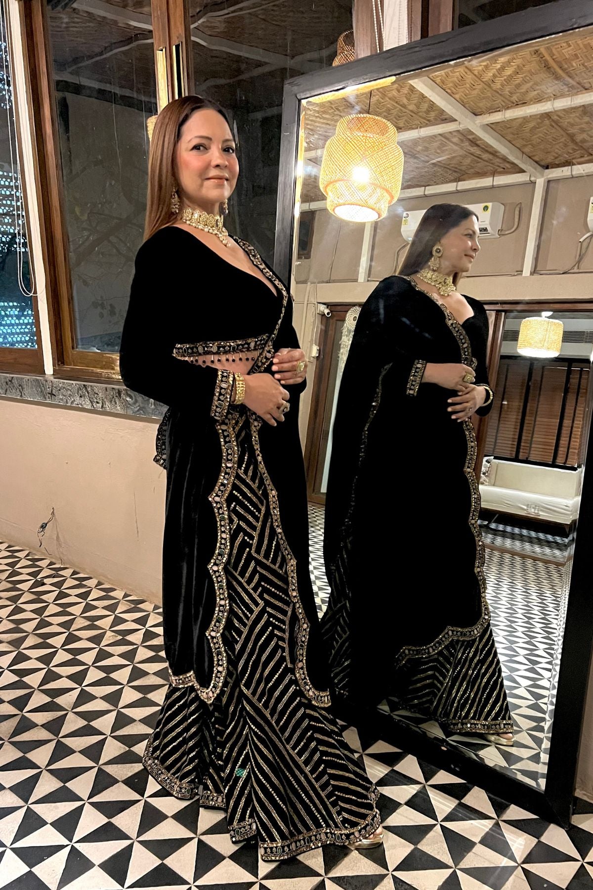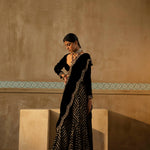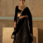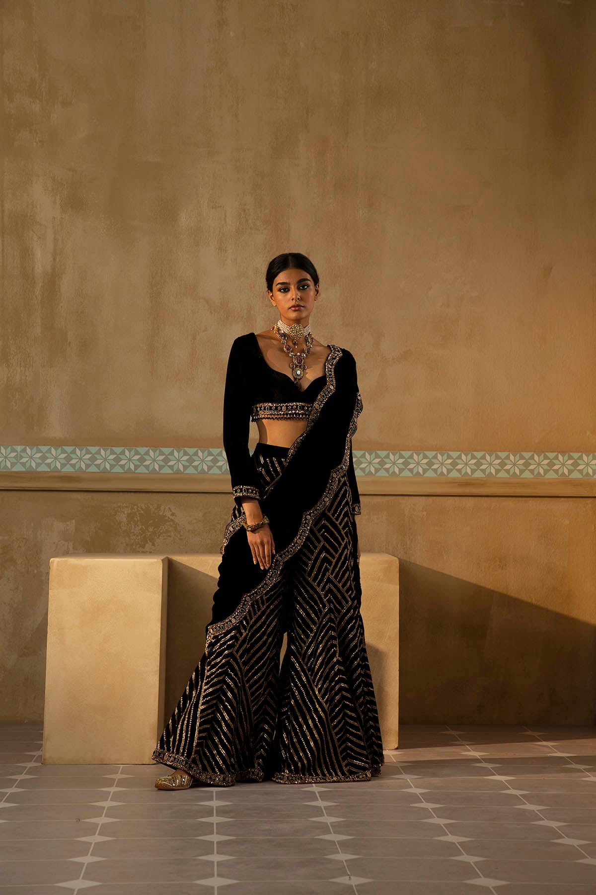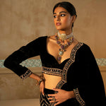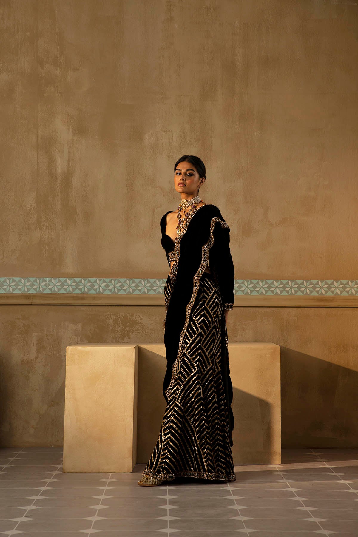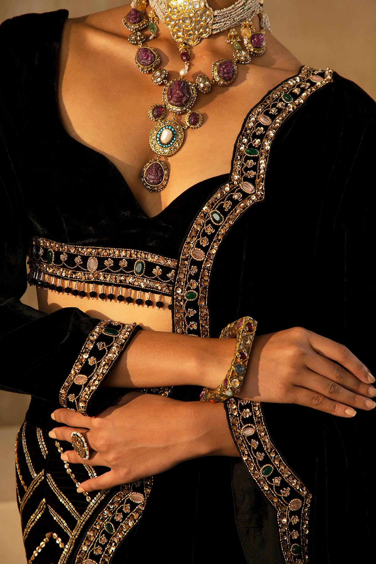 Borrowed from the past – this season, we revisit the old-world sharara silhouette to reimagine it for present-day festivities. The result is our hero silhouette for the season. A draped silk velvet take on the sharara paired with a matching blouse and scalloped dupatta, accentuated with semi-precious embellishments and antique gold embroideries.