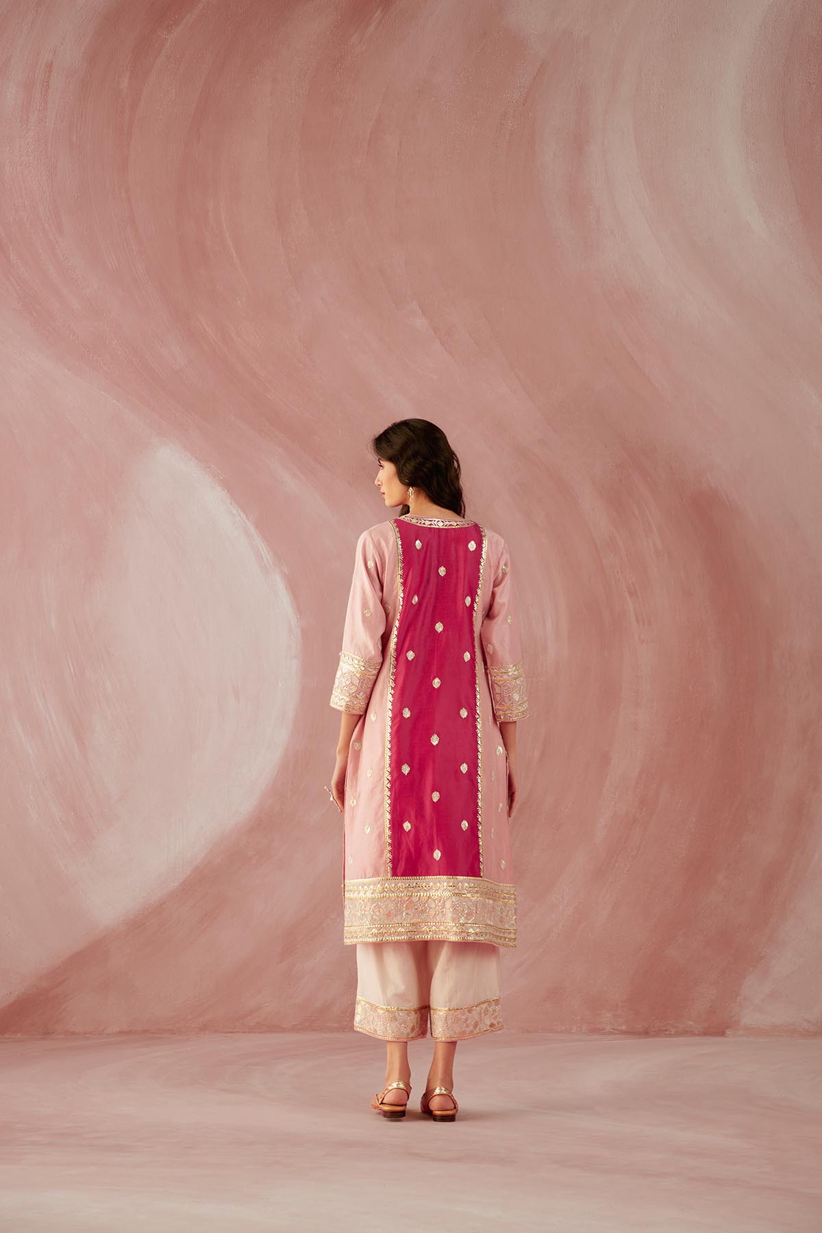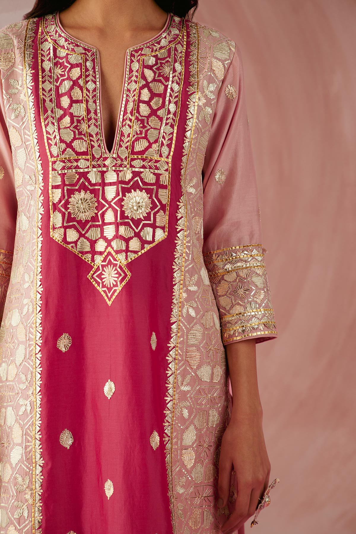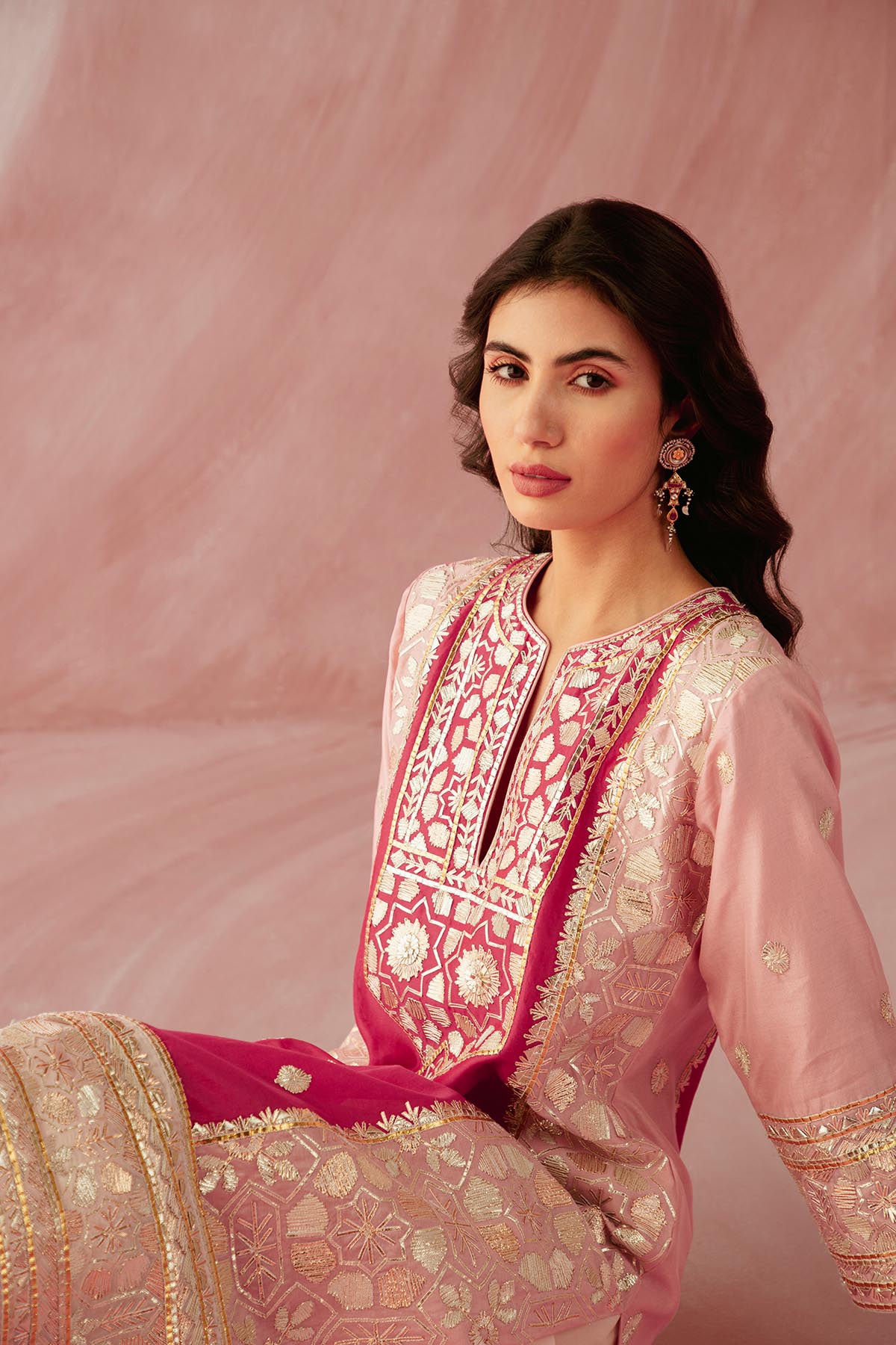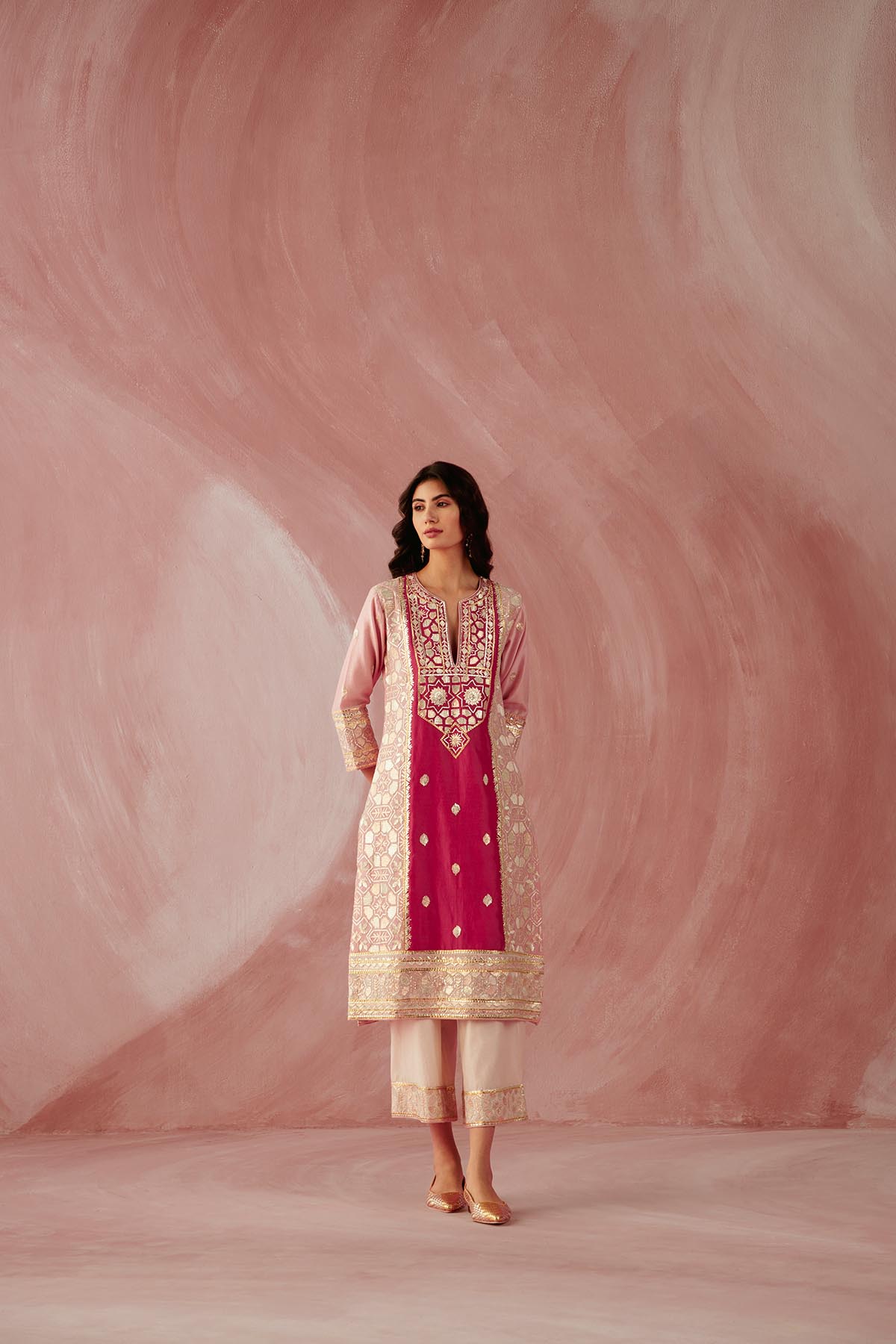Ready for the spotlight— this vibrant chanderi kurta is enriched with intricate gota work across the surface and while the contrast yellow panel adds character, the flared embroidered palazzos lend it old world charm. Complete the look with an intricately embroidered yellow dupatta that comes with a matching gota border and floral motifs across the centre. A refreshing take on color blocking – this ivory and yellow number is heavy on yesteryear charm.