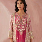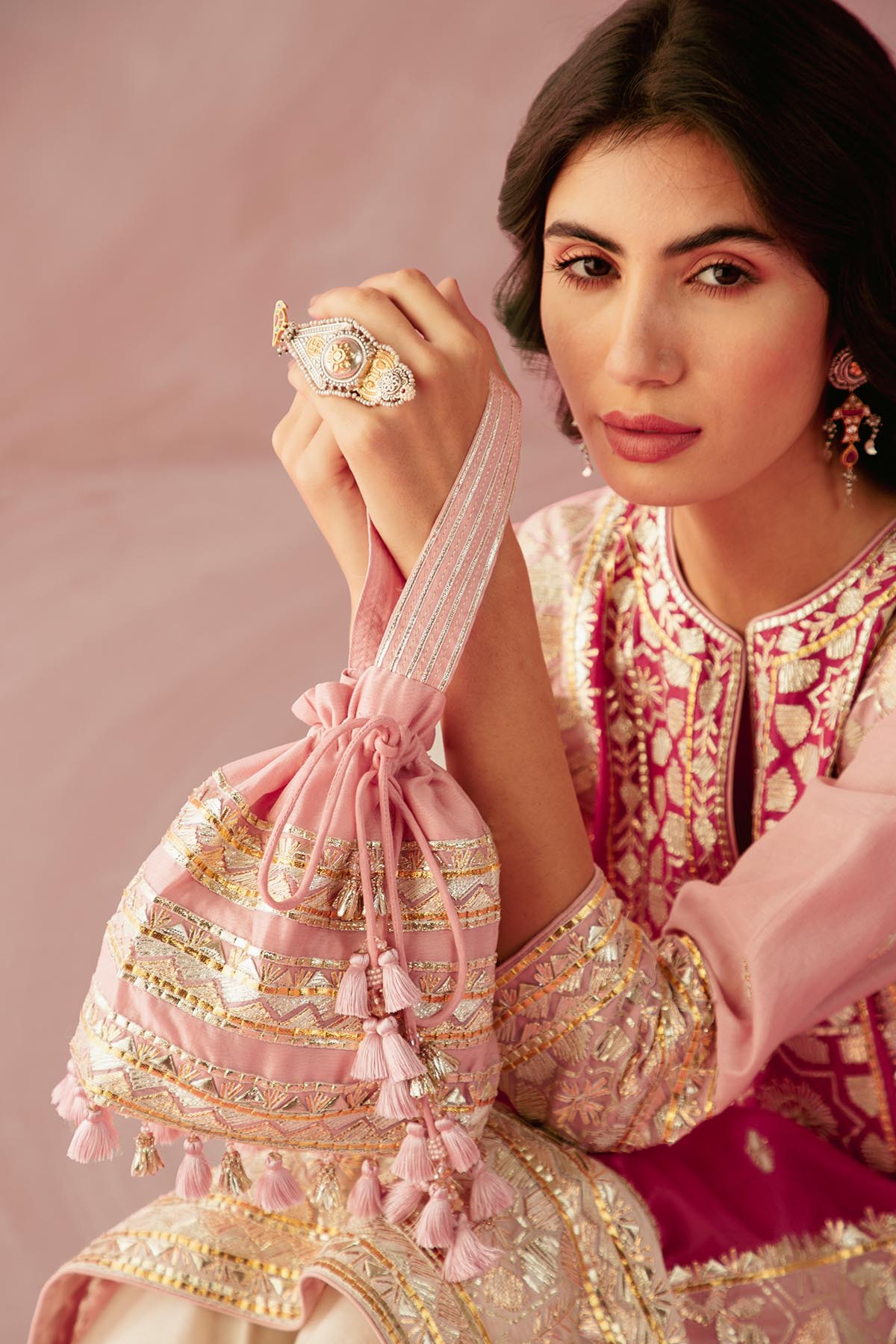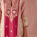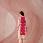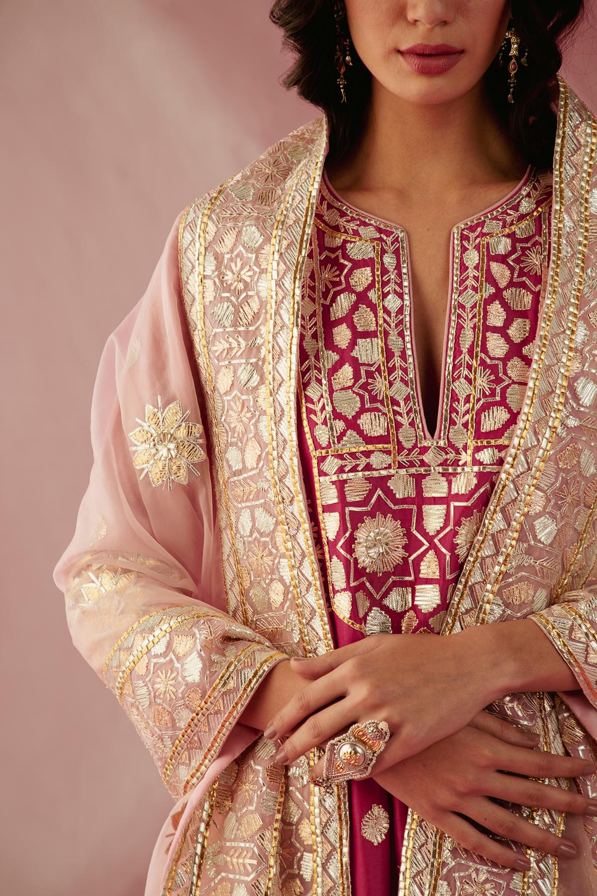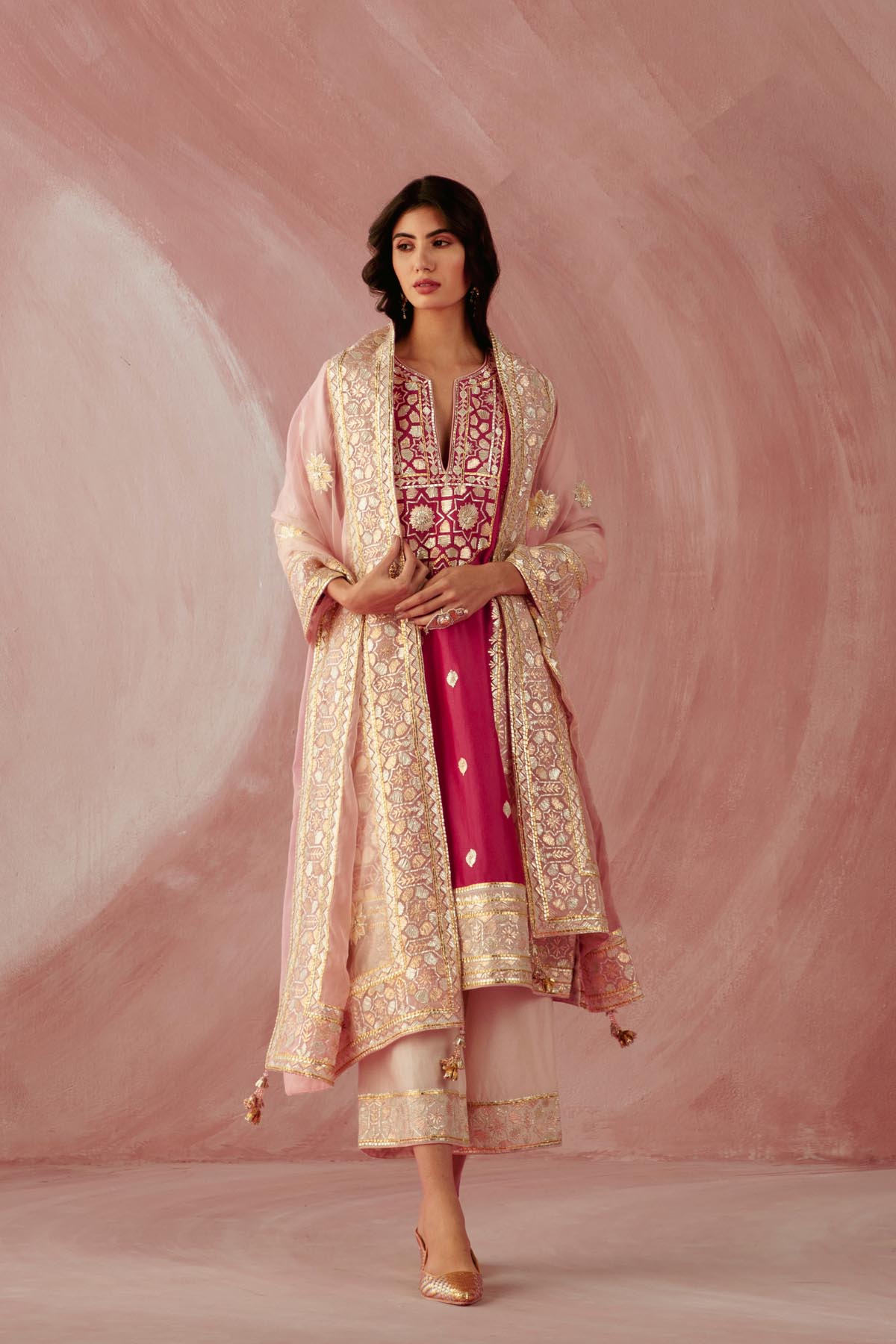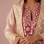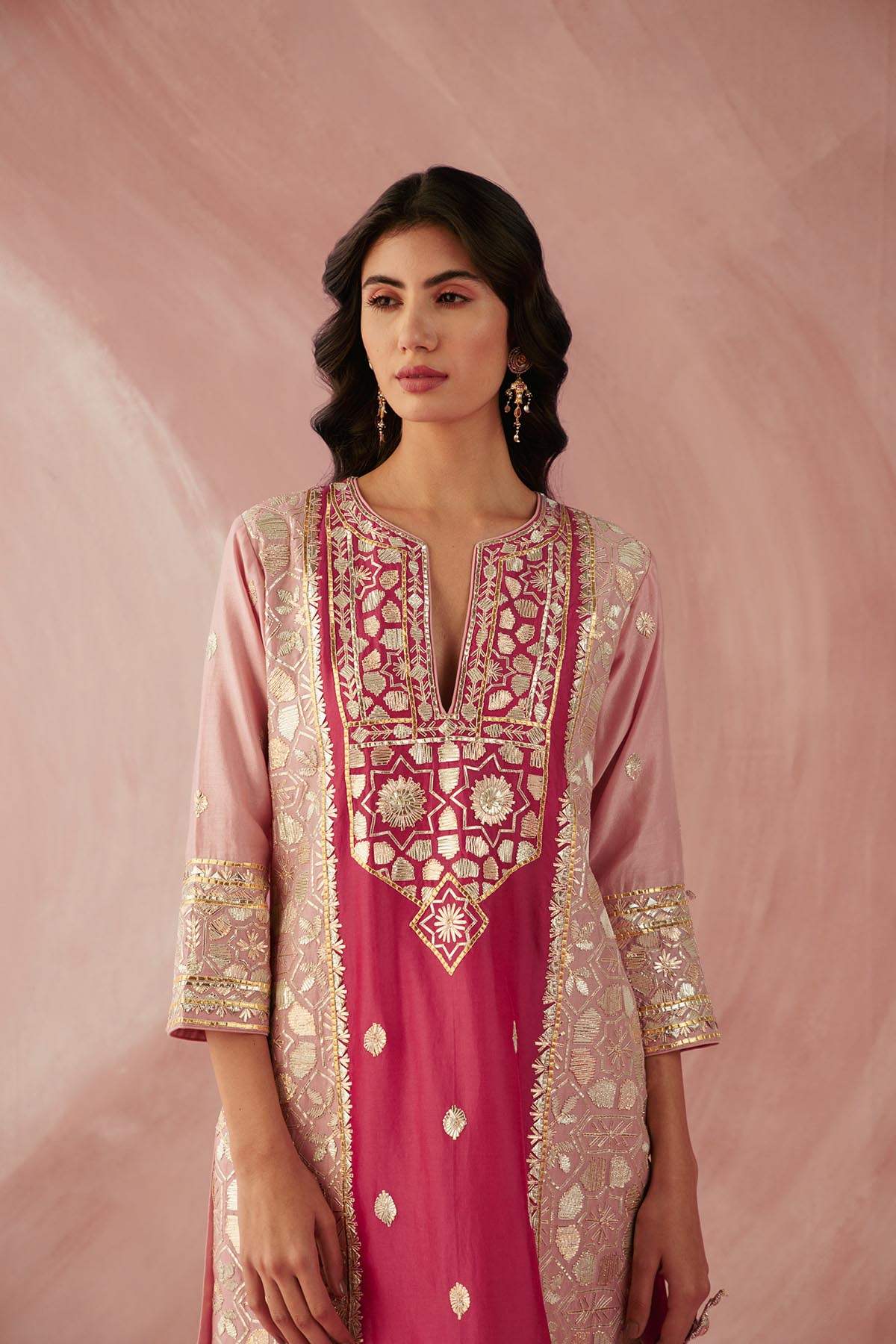 Ready for the spotlight— this vibrant chanderi kurta is enriched with intricate gota work across the surface and while the contrast yellow panel adds character, the flared embroidered palazzos lend it old world charm. Complete the look with an intricately embroidered yellow dupatta that comes with a matching gota border and floral motifs across the centre. A refreshing take on color blocking – this ivory and yellow number is heavy on yesteryear charm.