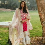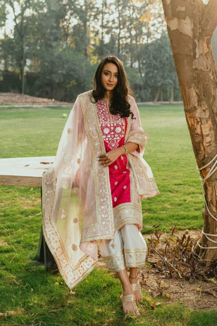 Ready for the spotlight— this vibrant chanderi kurta is enriched with intricate gota work across the surface and while the contrast yellow panel adds character, the flared embroidered palazzos lend it old world charm. Complete the look with an intricately embroidered yellow dupatta that comes with a matching gota border and floral motifs across the centre. A refreshing take on color blocking – this ivory and yellow number is heavy on yesteryear charm.