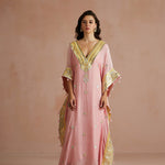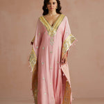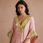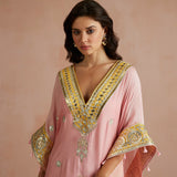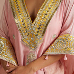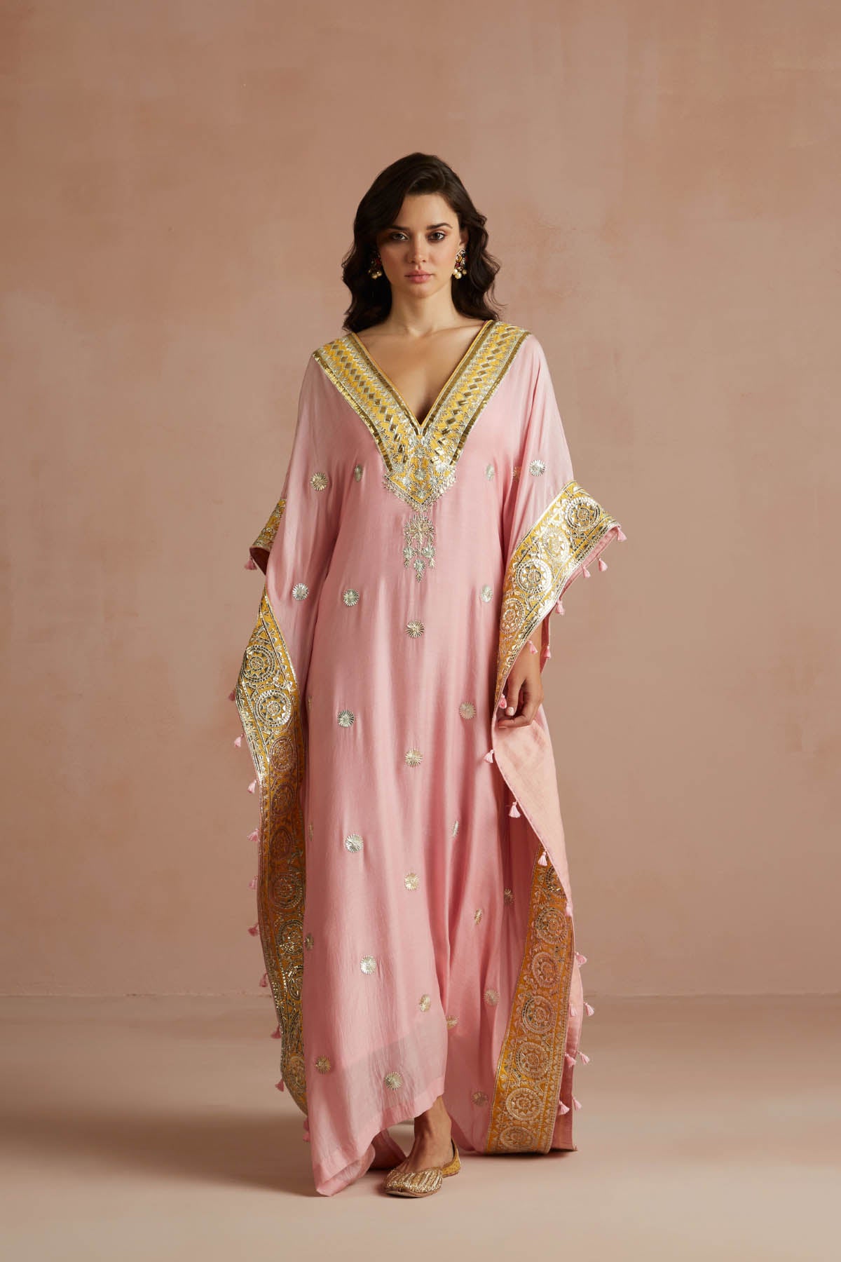 Kaftan cool: This blush pink kaftan nails fuss-free festive dressing, while keeping it polished. Hints of yellow at the sleeves and neckline, accentuated by glistening gota patchwork, make this a wedding season must-have.
