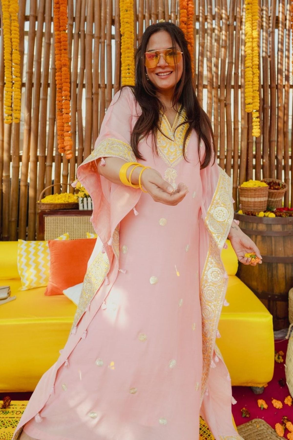 Kaftan cool: This blush pink kaftan nails fuss-free festive dressing, while keeping it polished. Hints of yellow at the sleeves and neckline, accentuated by glistening gota patchwork, make this a wedding season must-have.