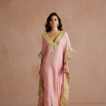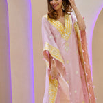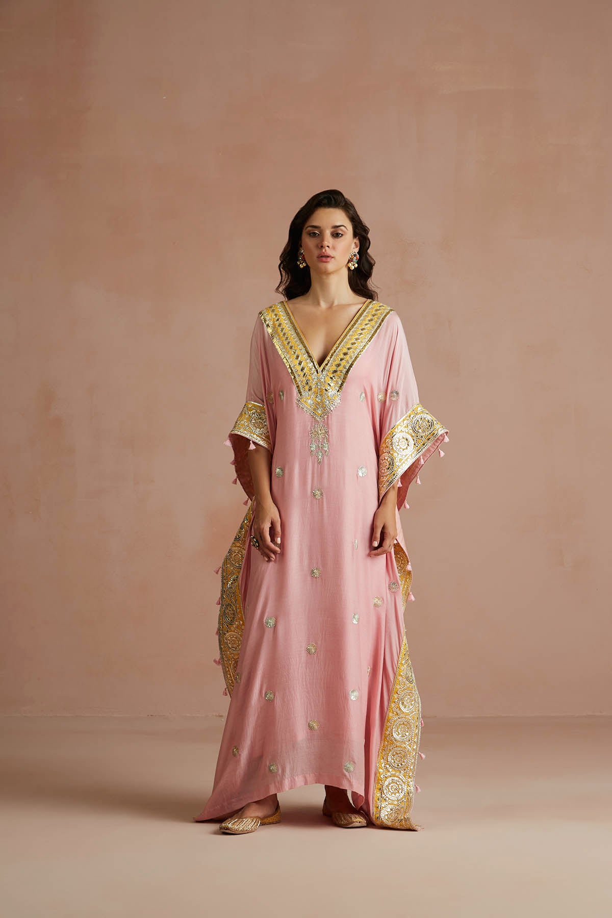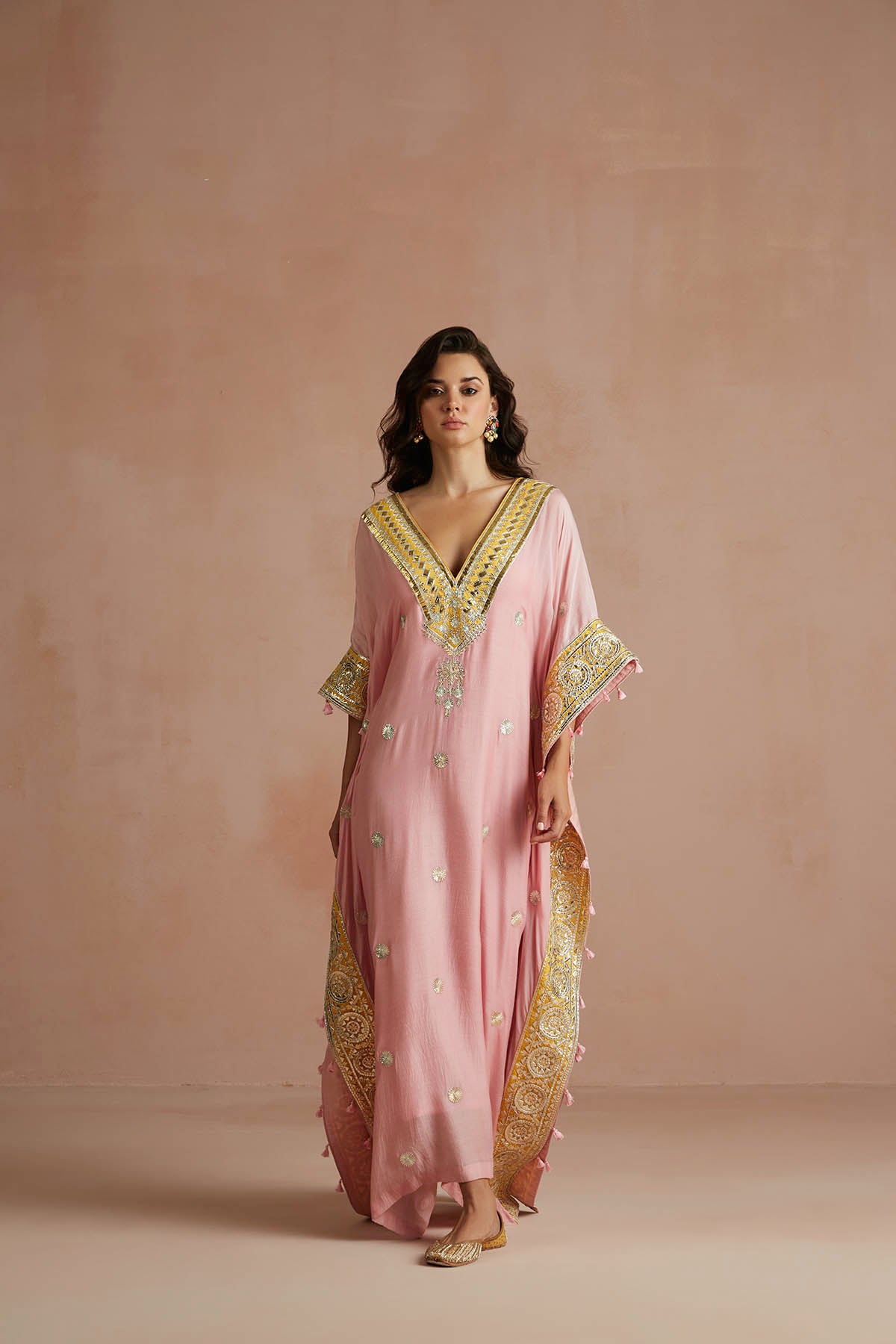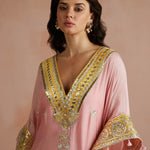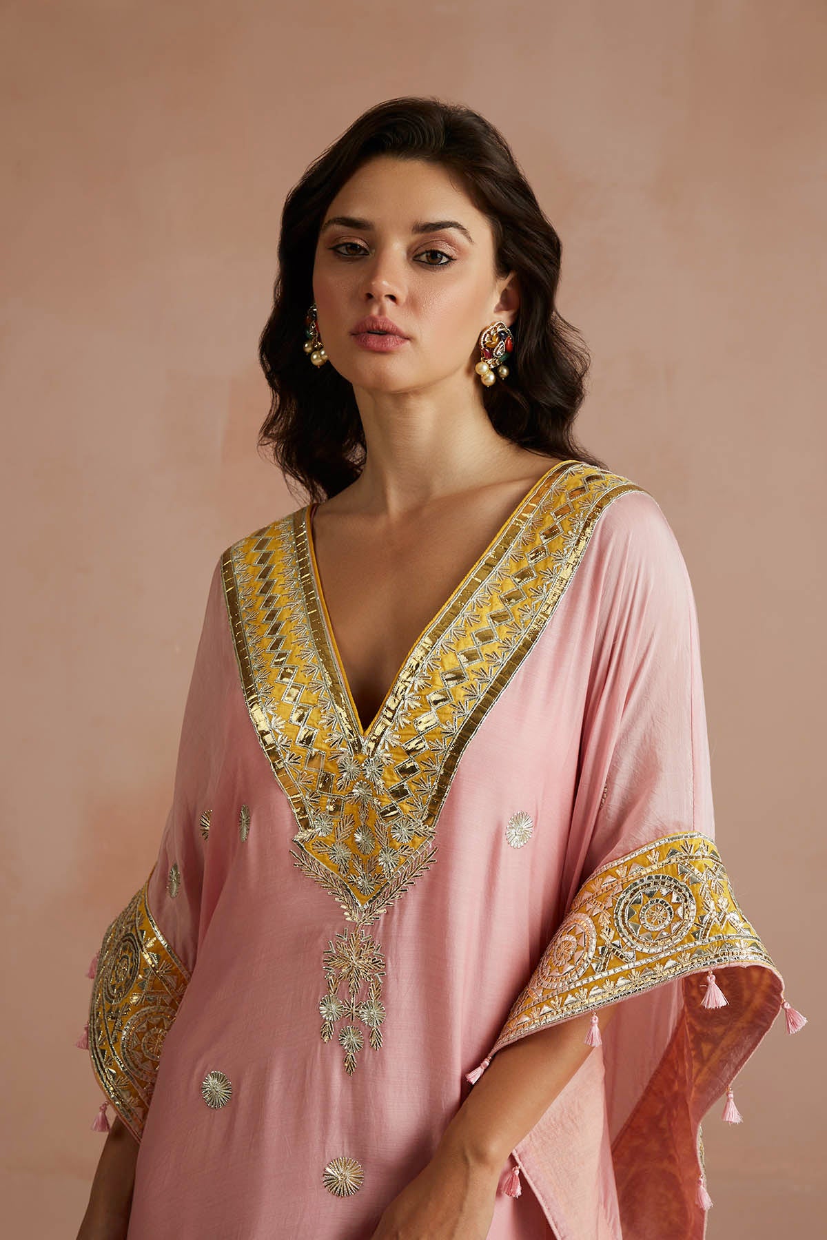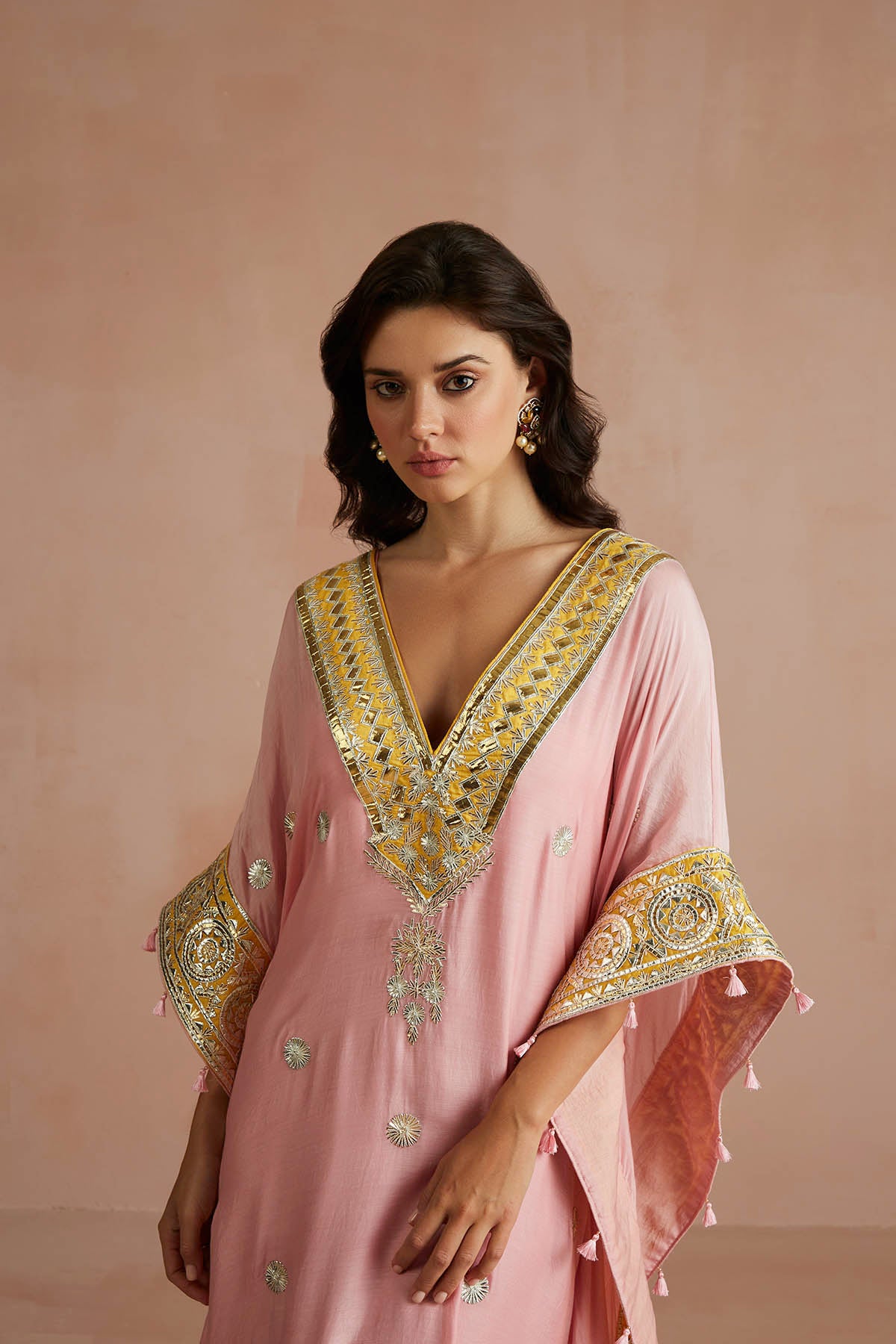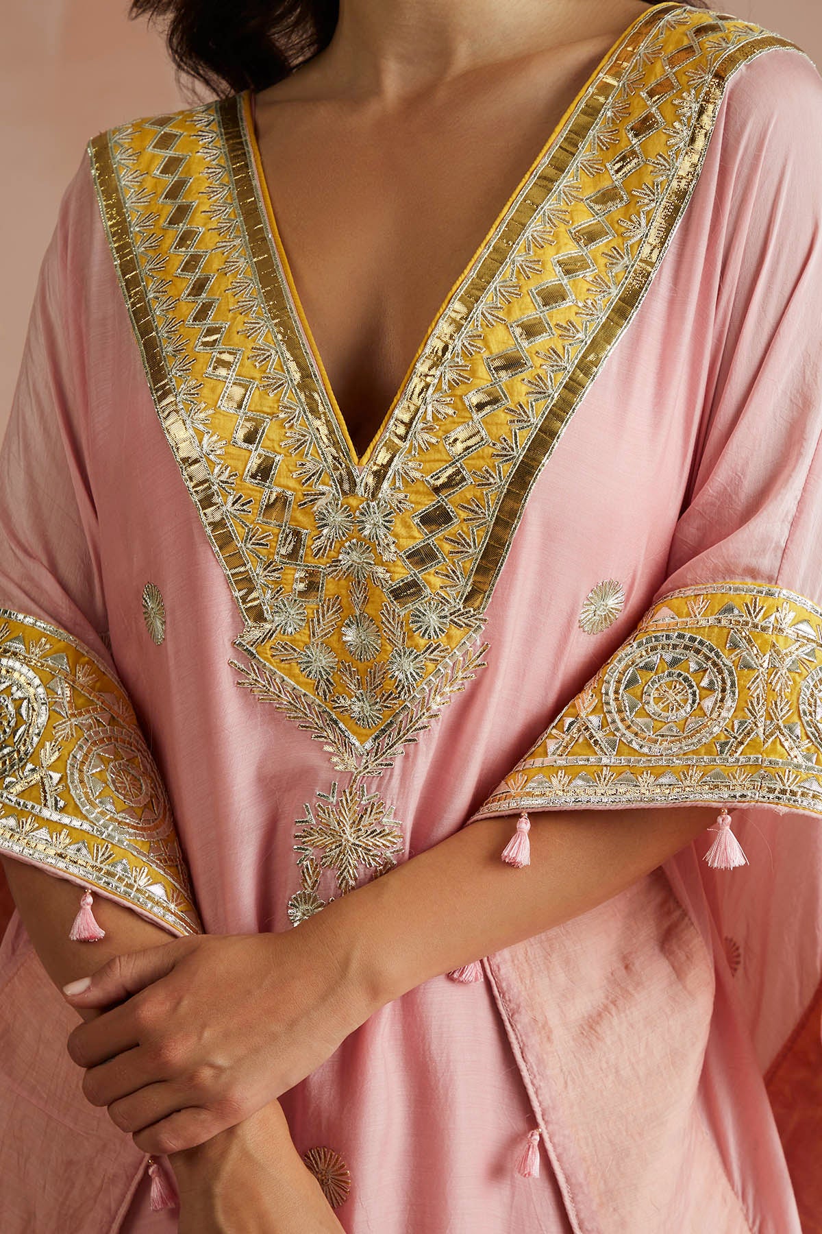 Kaftan cool: This blush pink kaftan nails fuss-free festive dressing, while keeping it polished. Hints of yellow at the sleeves and neckline, accentuated by glistening gota patchwork, make this a wedding season must-have.