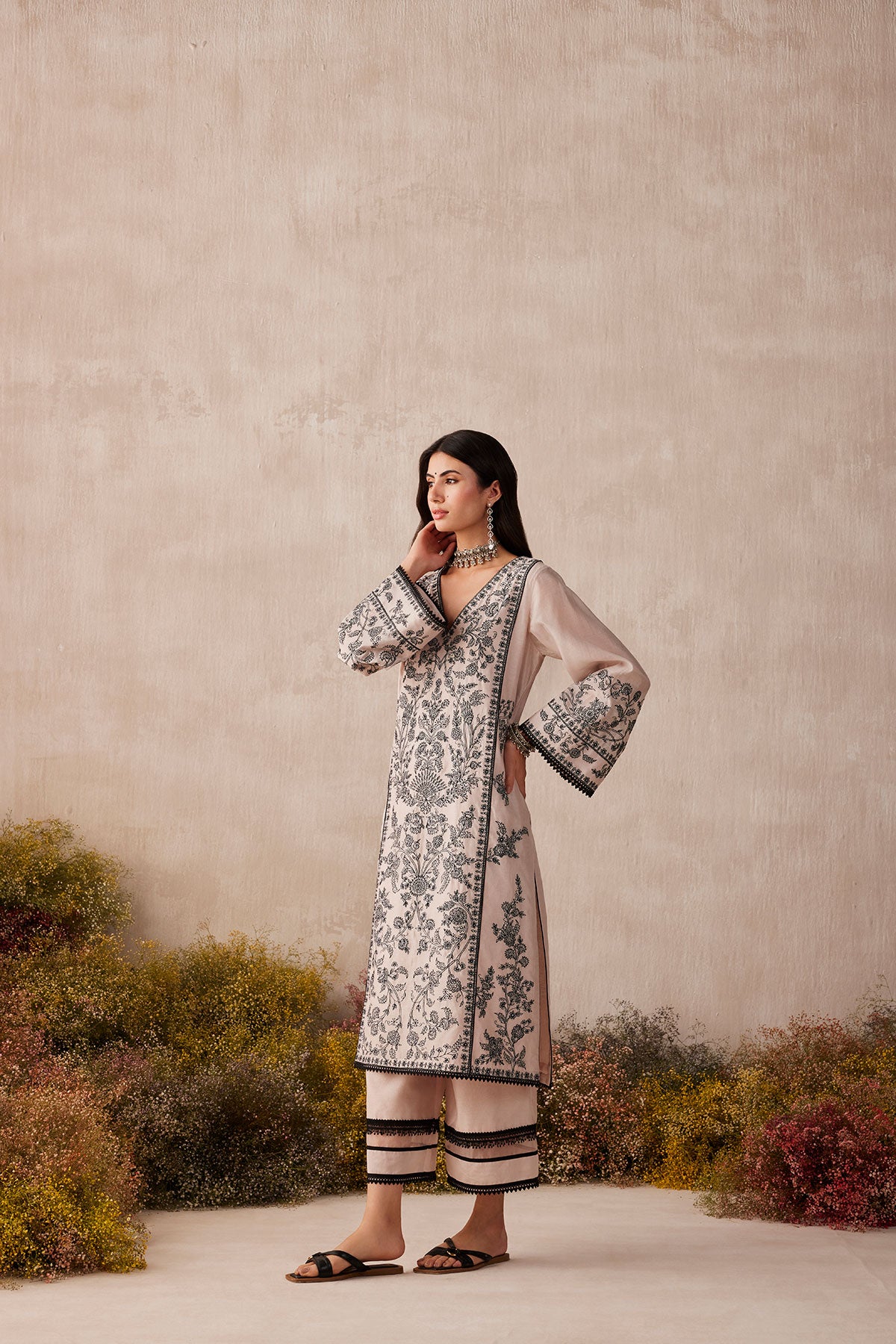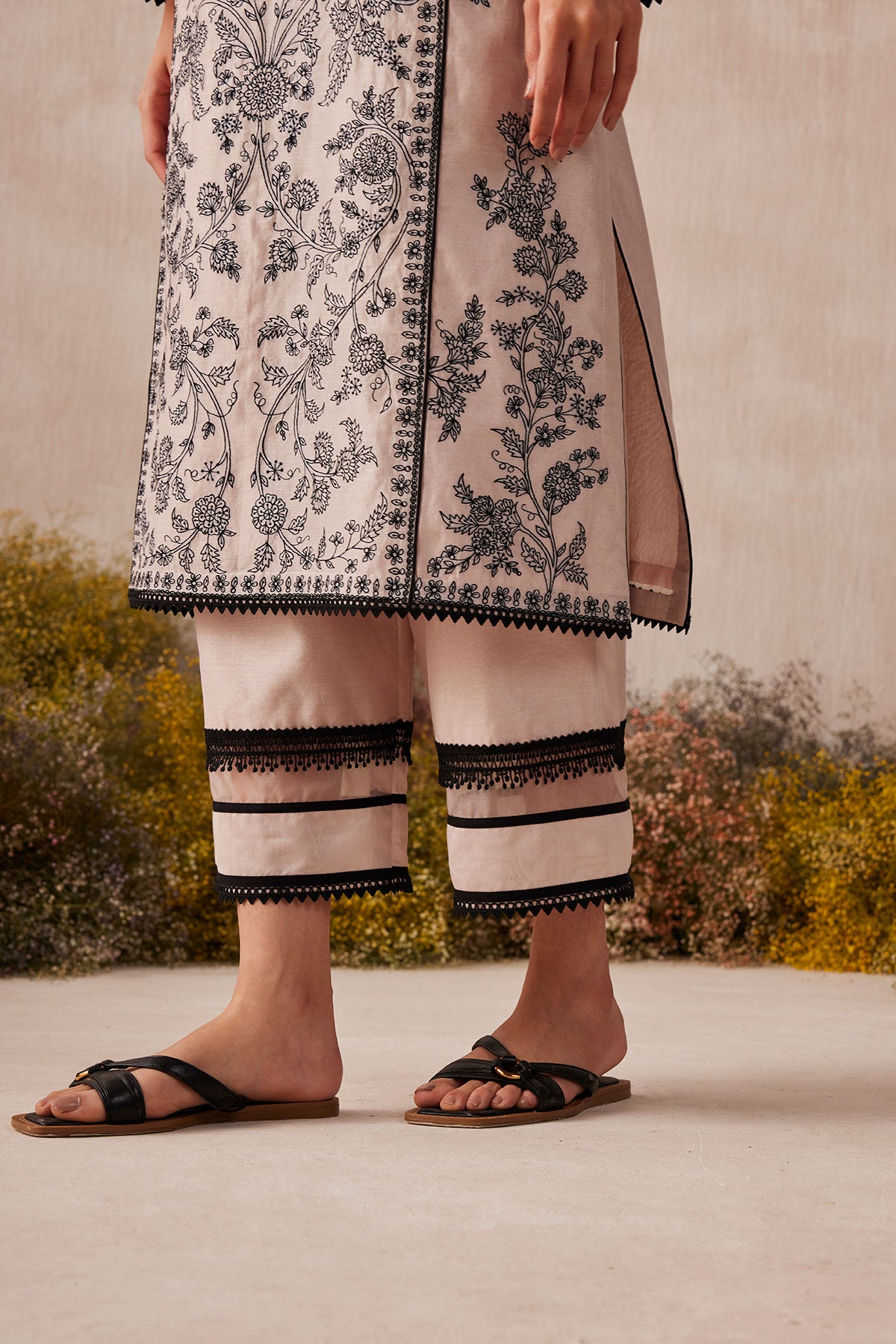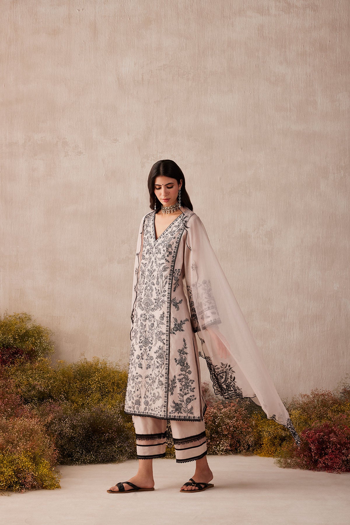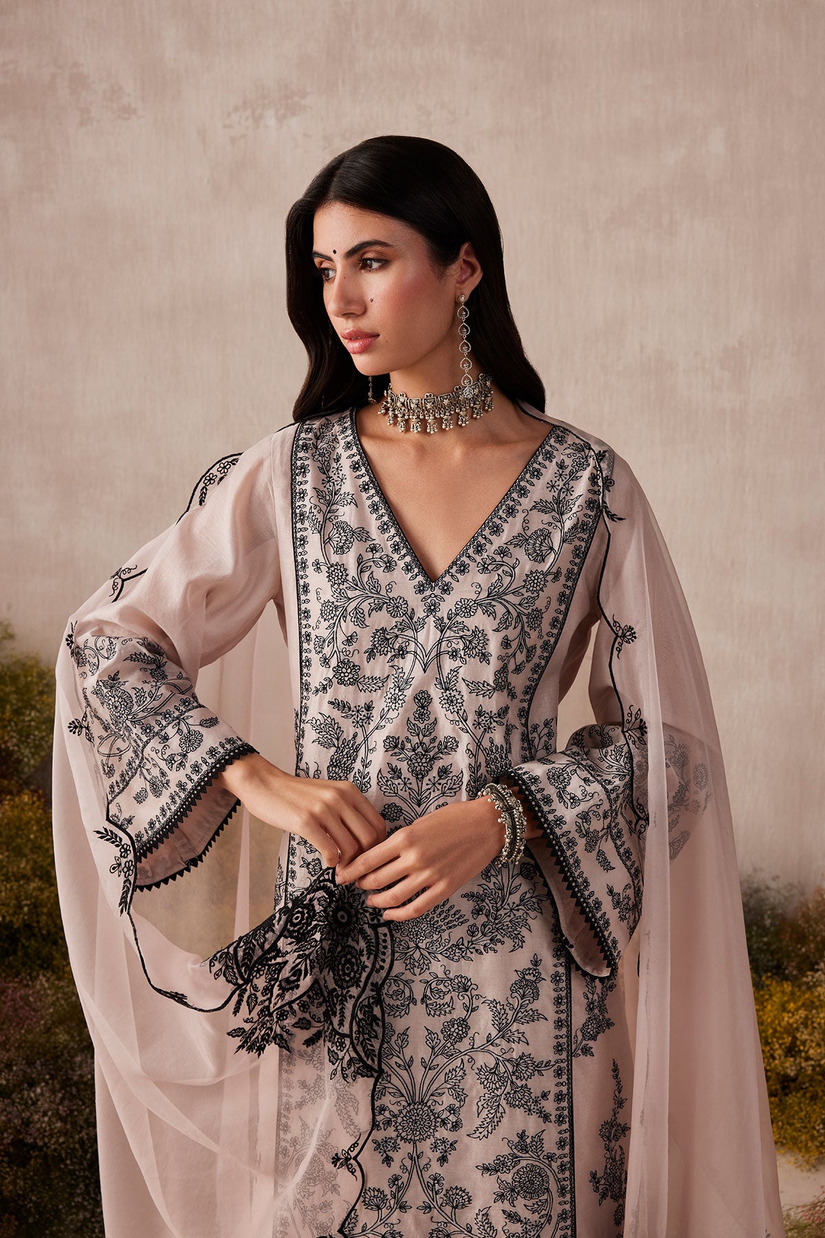 Summer Masterpiece: Our nude beige silk chanderi kurta features a floral jaal for the ages. The intricate contrast black threadwork stands out the on the perfectly neutral base while the palazzos are kept simple with sheer organza panels and delicate lacework. Complete this traditional look with a sheer organza dupatta that is scalloped to perfection.