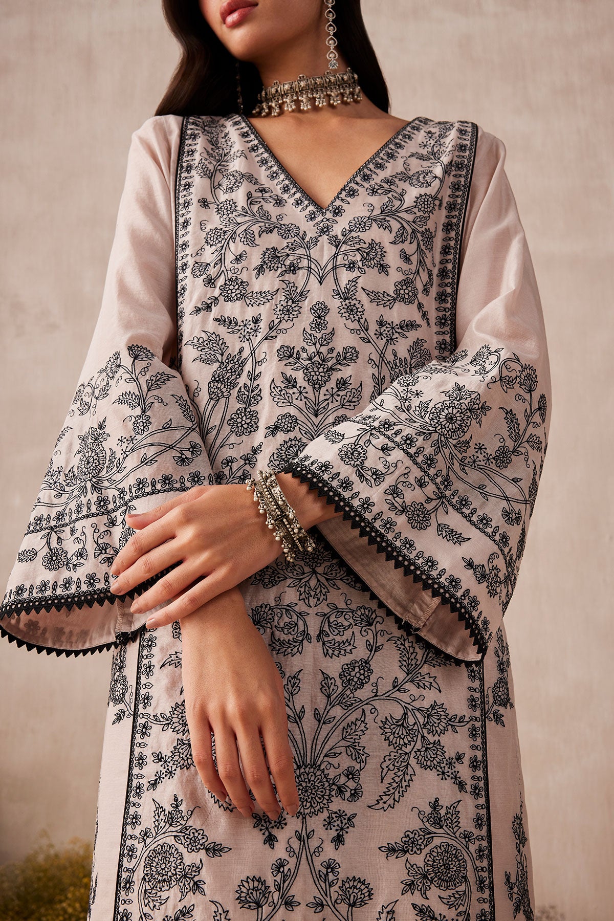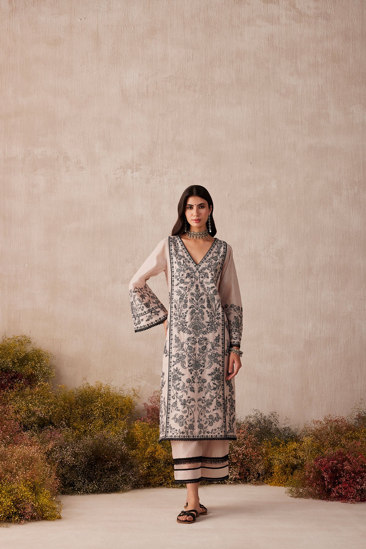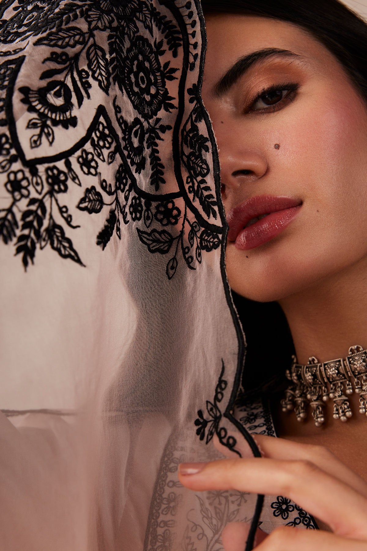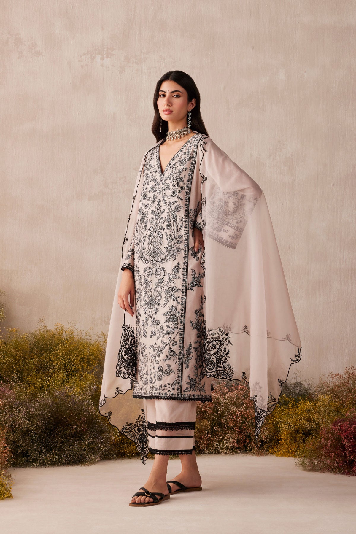 Summer Masterpiece: Our nude beige silk chanderi kurta features a floral jaal for the ages. The intricate contrast black threadwork stands out the on the perfectly neutral base while the palazzos are kept simple with sheer organza panels and delicate lacework. Complete this traditional look with a sheer organza dupatta that is scalloped to perfection.