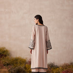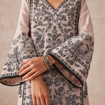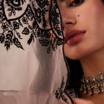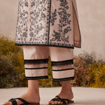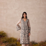 Summer Masterpiece: Our nude beige silk chanderi kurta features a floral jaal for the ages. The intricate contrast black threadwork stands out the on the perfectly neutral base while the palazzos are kept simple with sheer organza panels and delicate lacework. Complete this traditional look with a sheer organza dupatta that is scalloped to perfection.