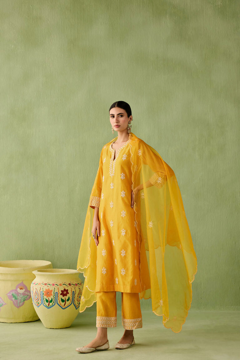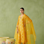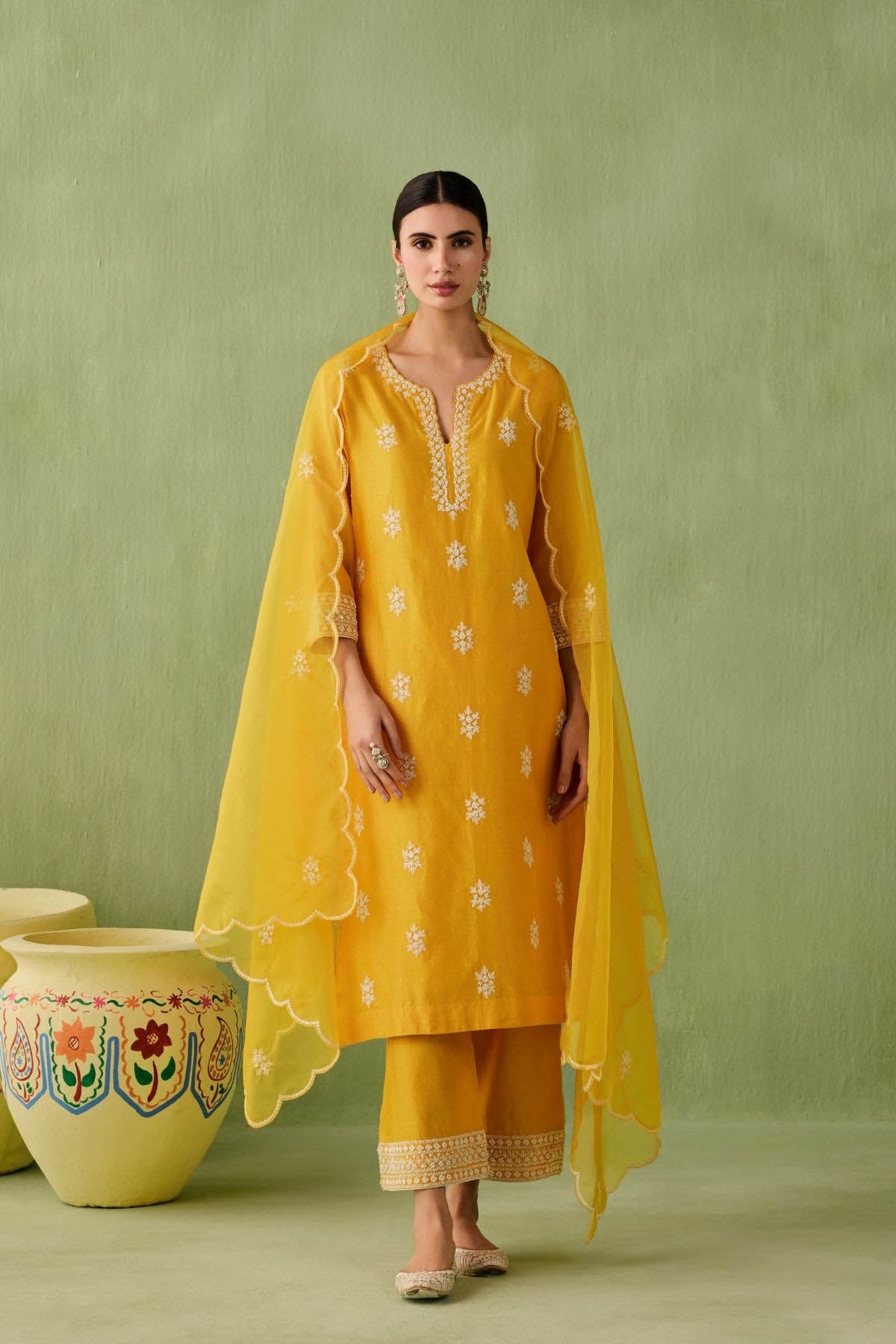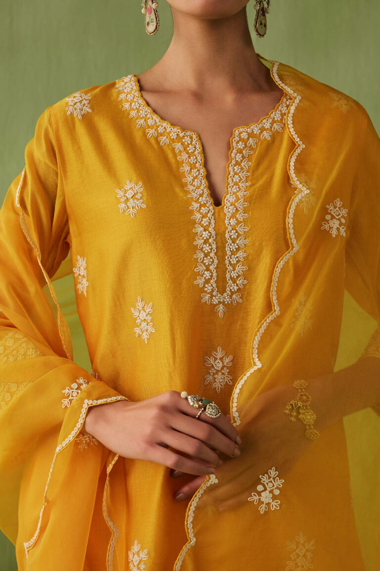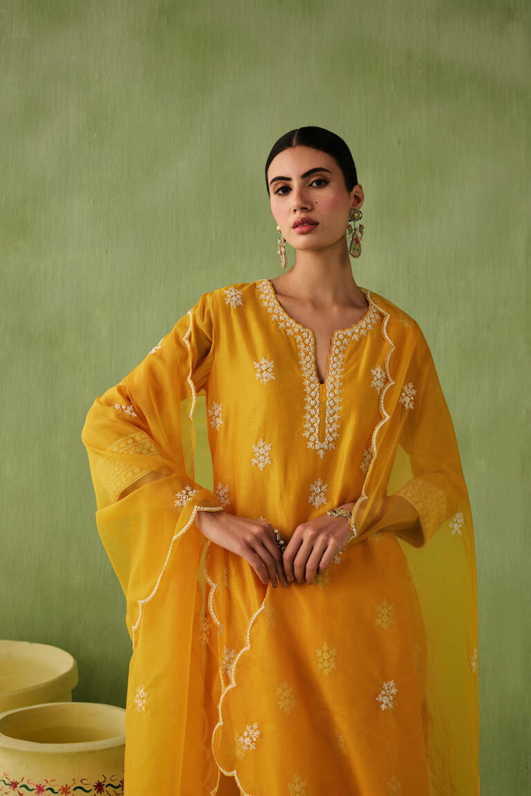 Step into elegance with this gorgeous forest green kurta set. The contrast pearl, sequin, bead, and resham embroidery in soft ivory hues is perfectly paired with a matching palazzo, while the sheer organza dupatta with floral motifs in dori and aari embroidery adds an ethereal touch. It’s the definition of minimum effort, maximum impact.
