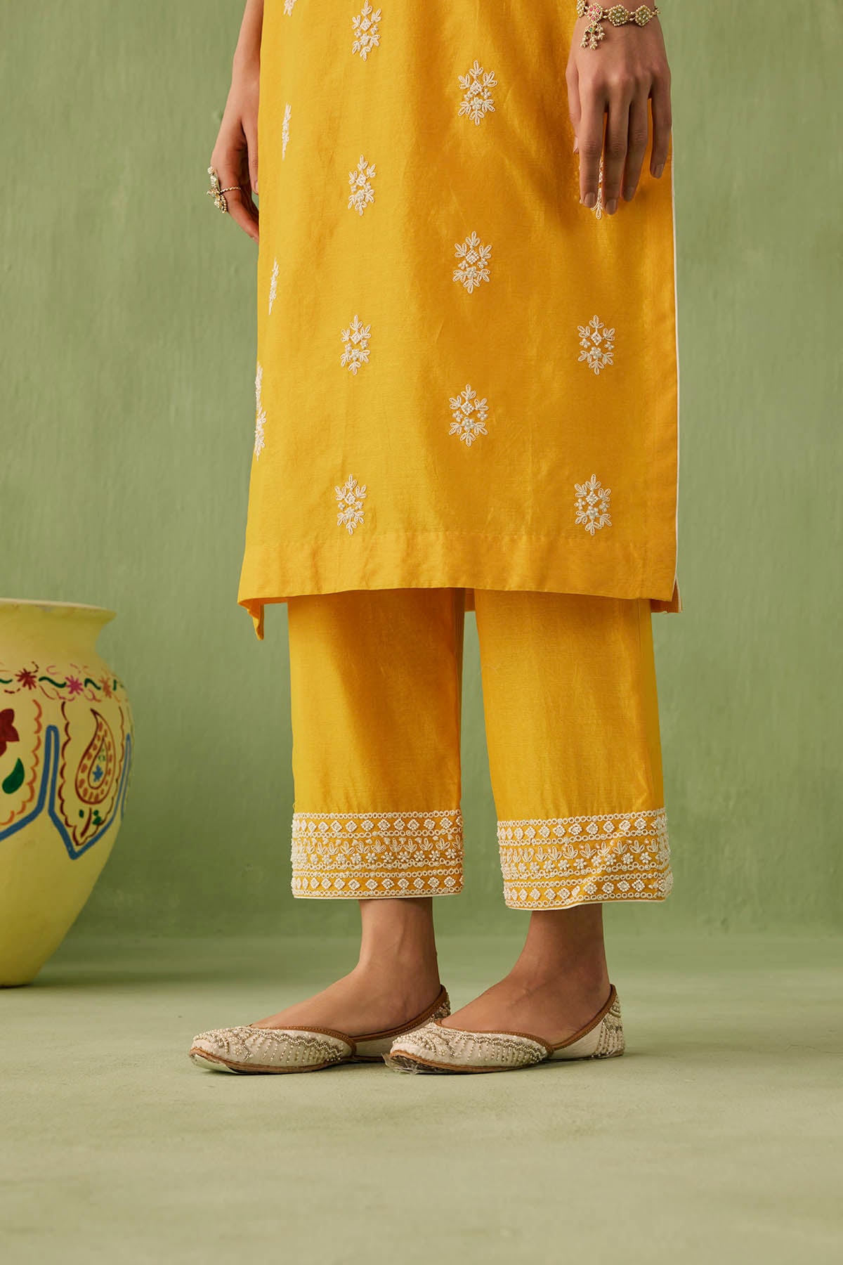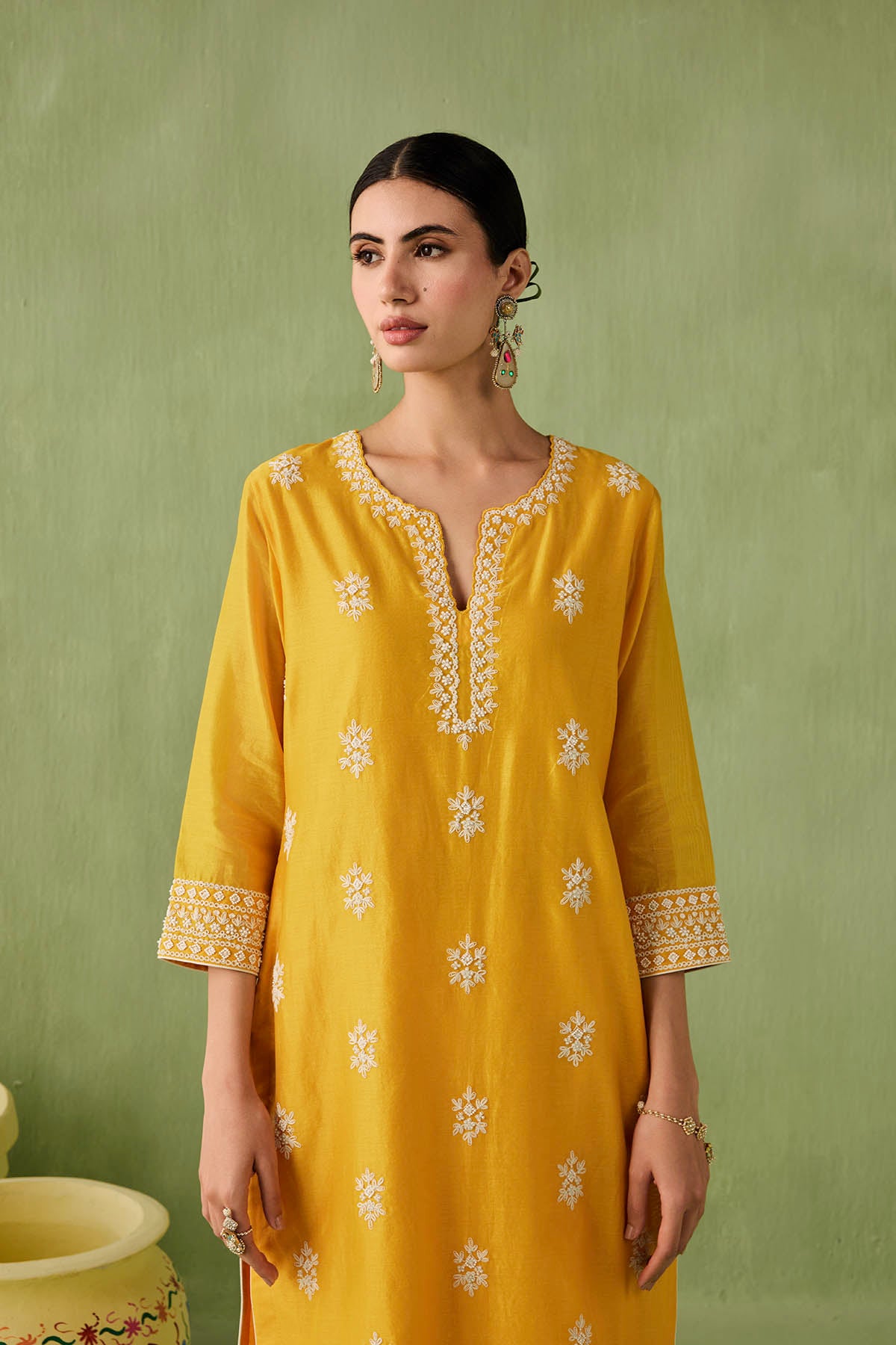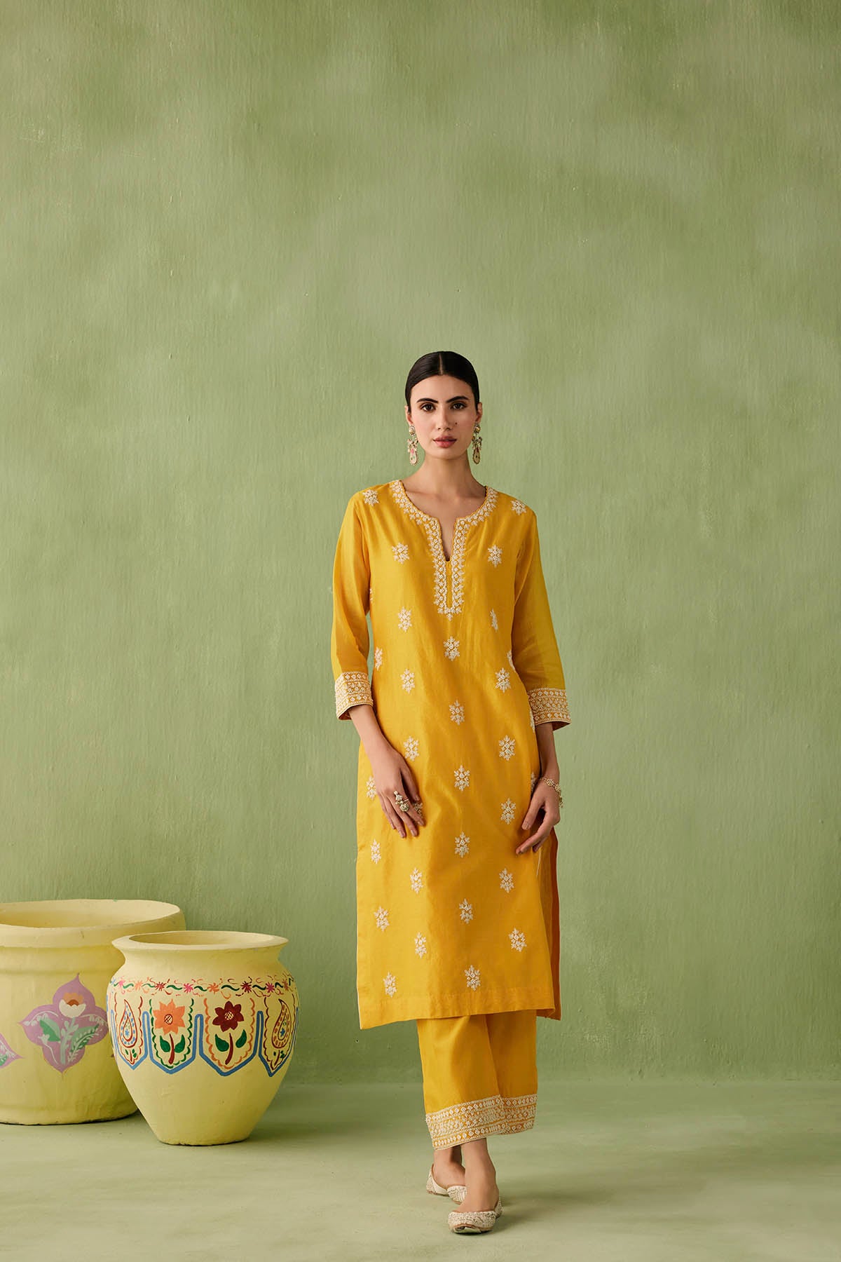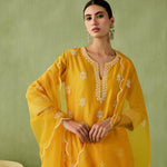 Step into elegance with this gorgeous forest green kurta set. The contrast pearl, sequin, bead, and resham embroidery in soft ivory hues is perfectly paired with a matching palazzo, while the sheer organza dupatta with floral motifs in dori and aari embroidery adds an ethereal touch. It’s the definition of minimum effort, maximum impact.