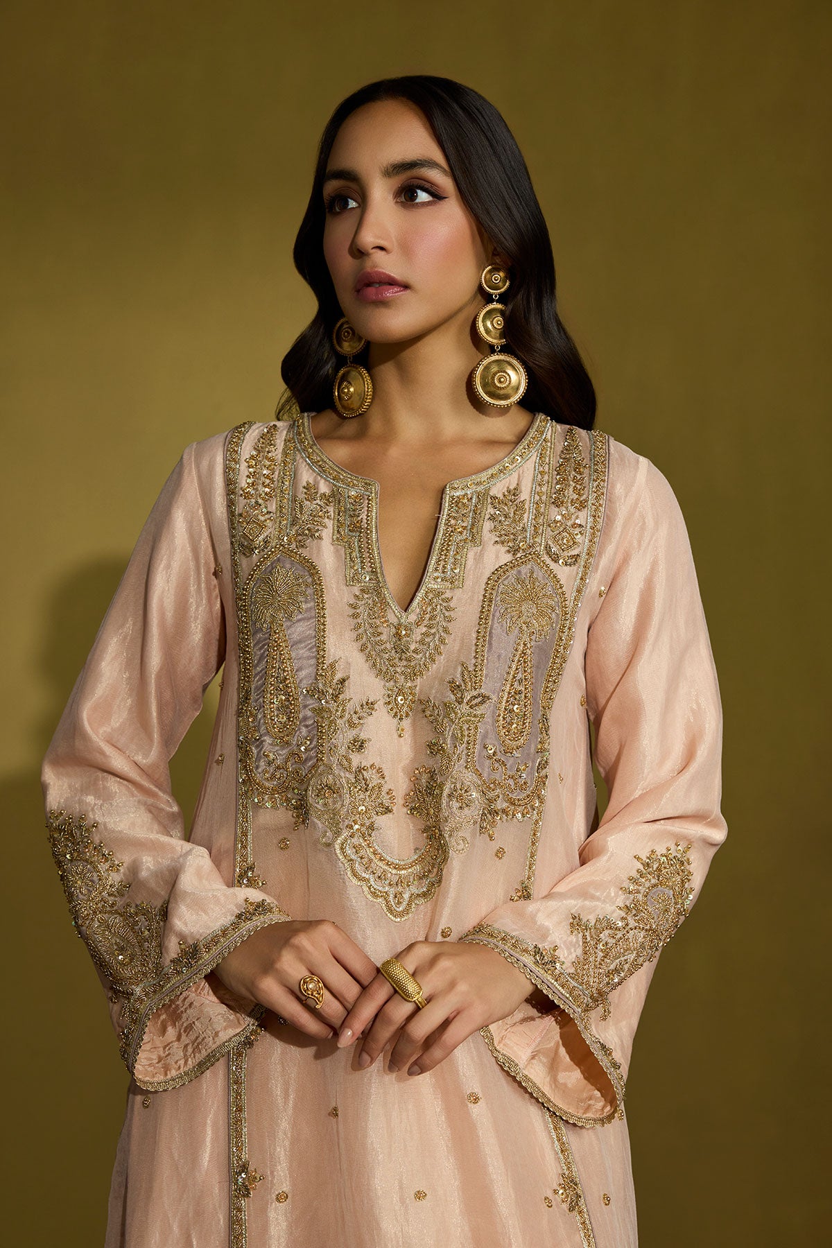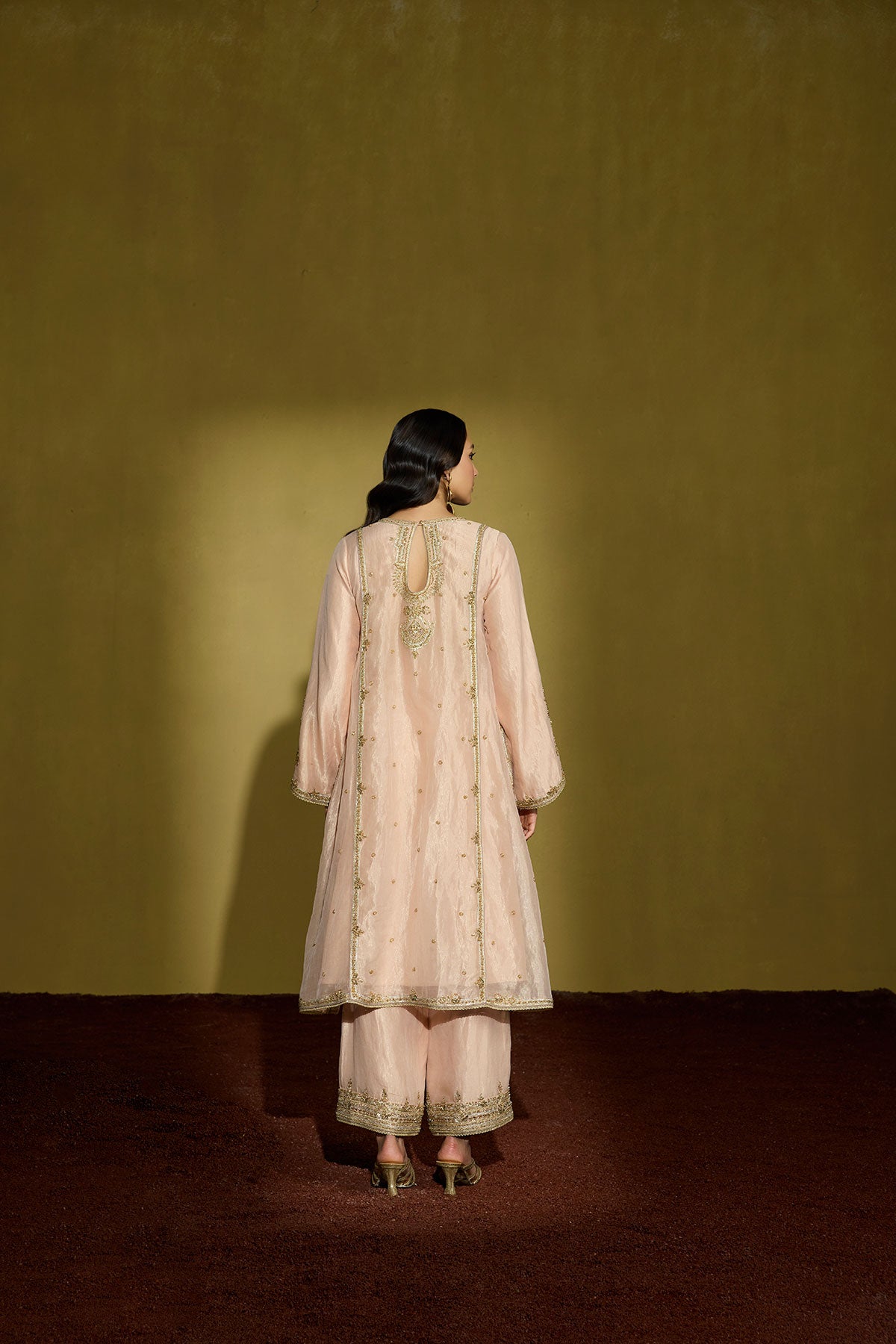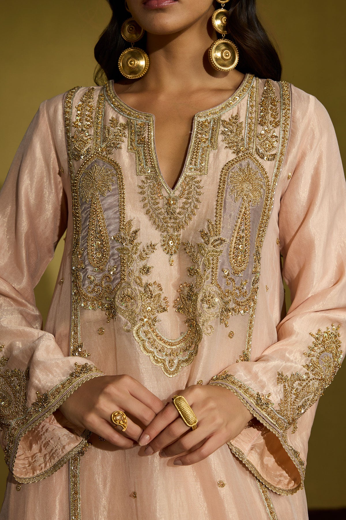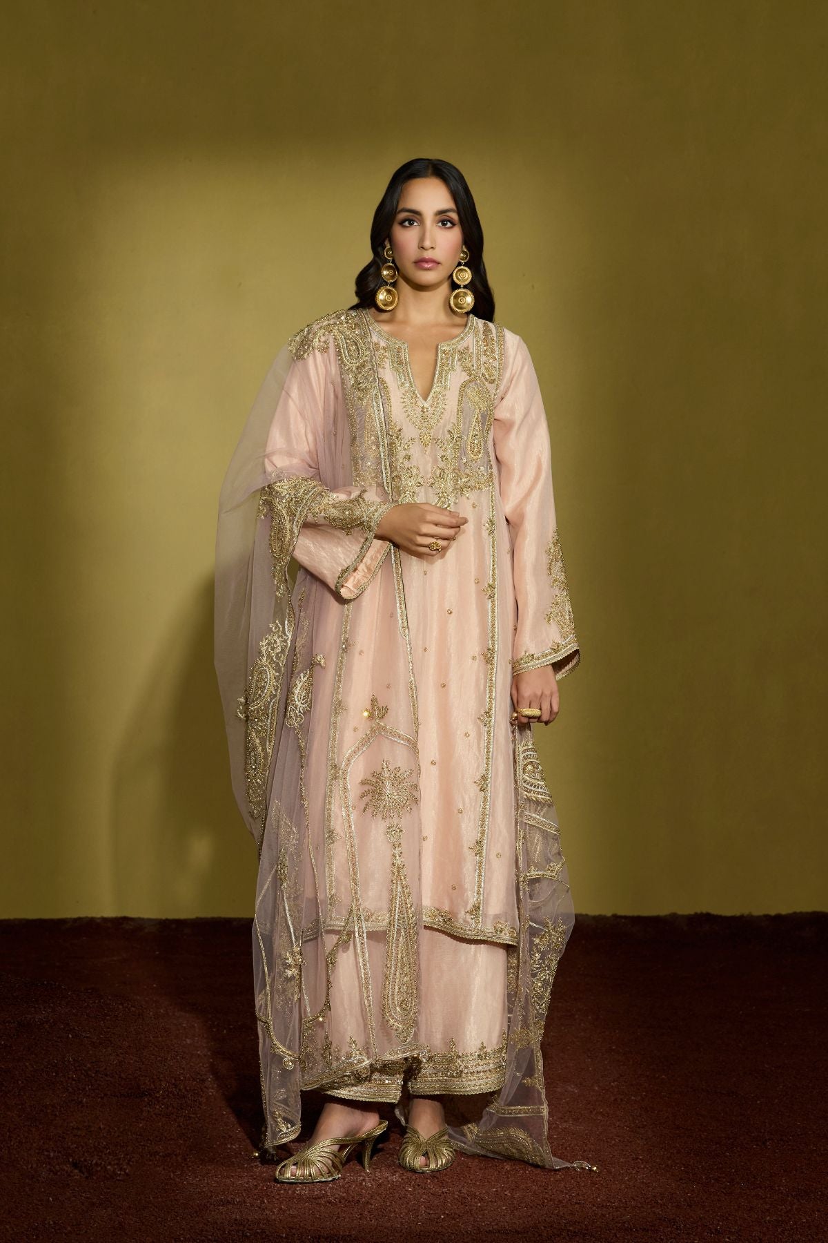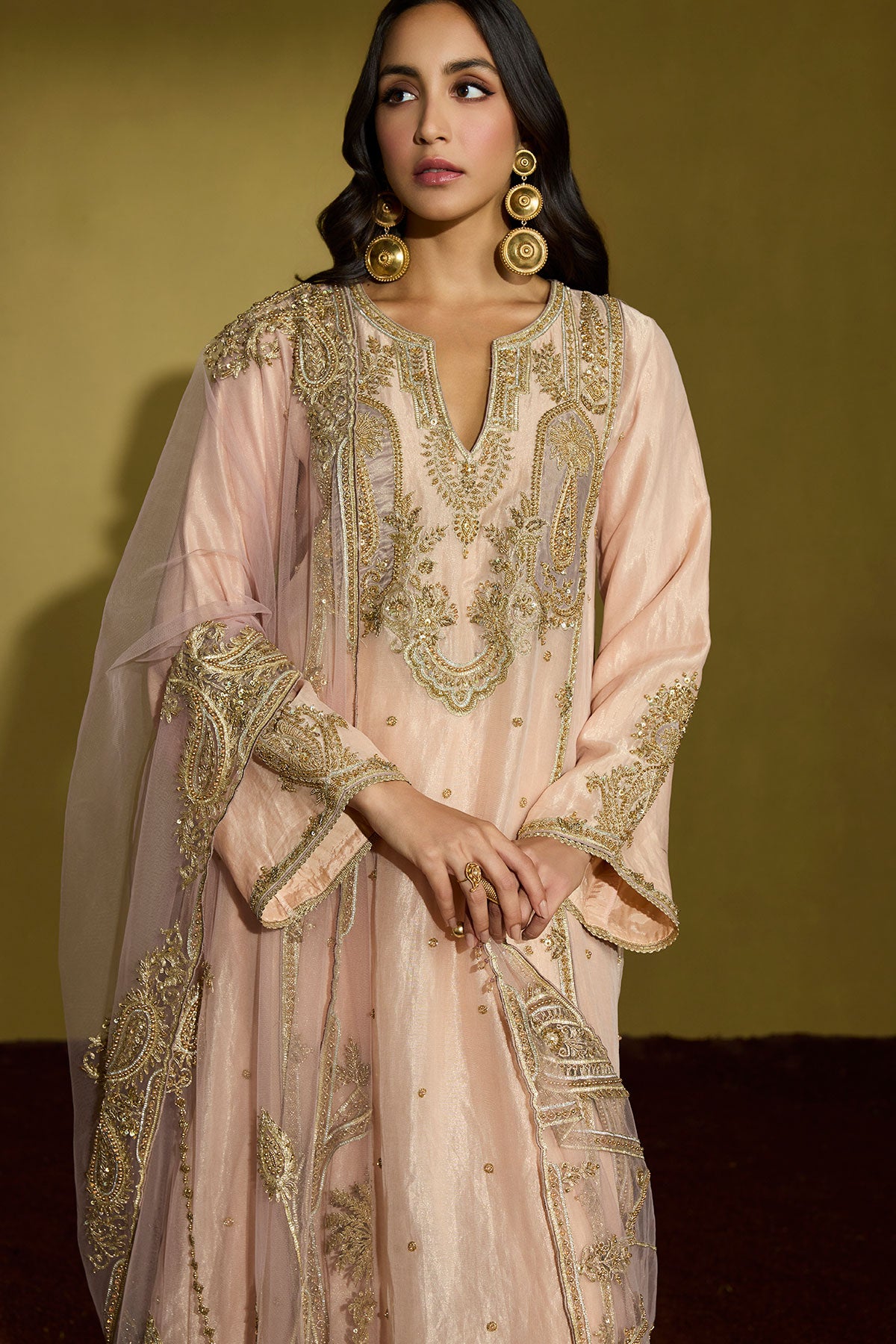 A peach silk tissue kurta, its surface alive with intricate gold embroidery, paired with a diaphanous lilac net dupatta that lends a whisper of contrast. Each detail is hand-finished—gota, sequins, beads, and delicate threadwork catching the light—creating a look that’s as refined as it is memorable, perfect for daytime weddings and elegant celebrations.