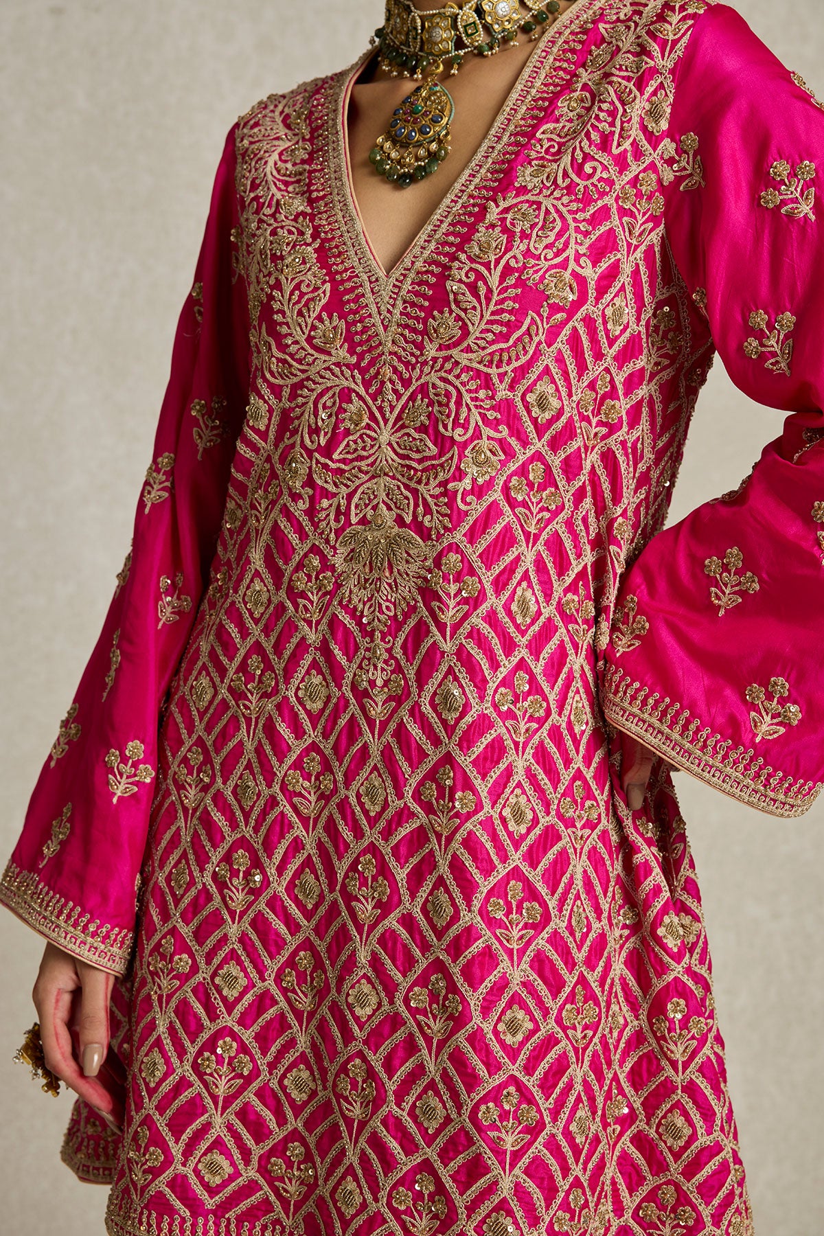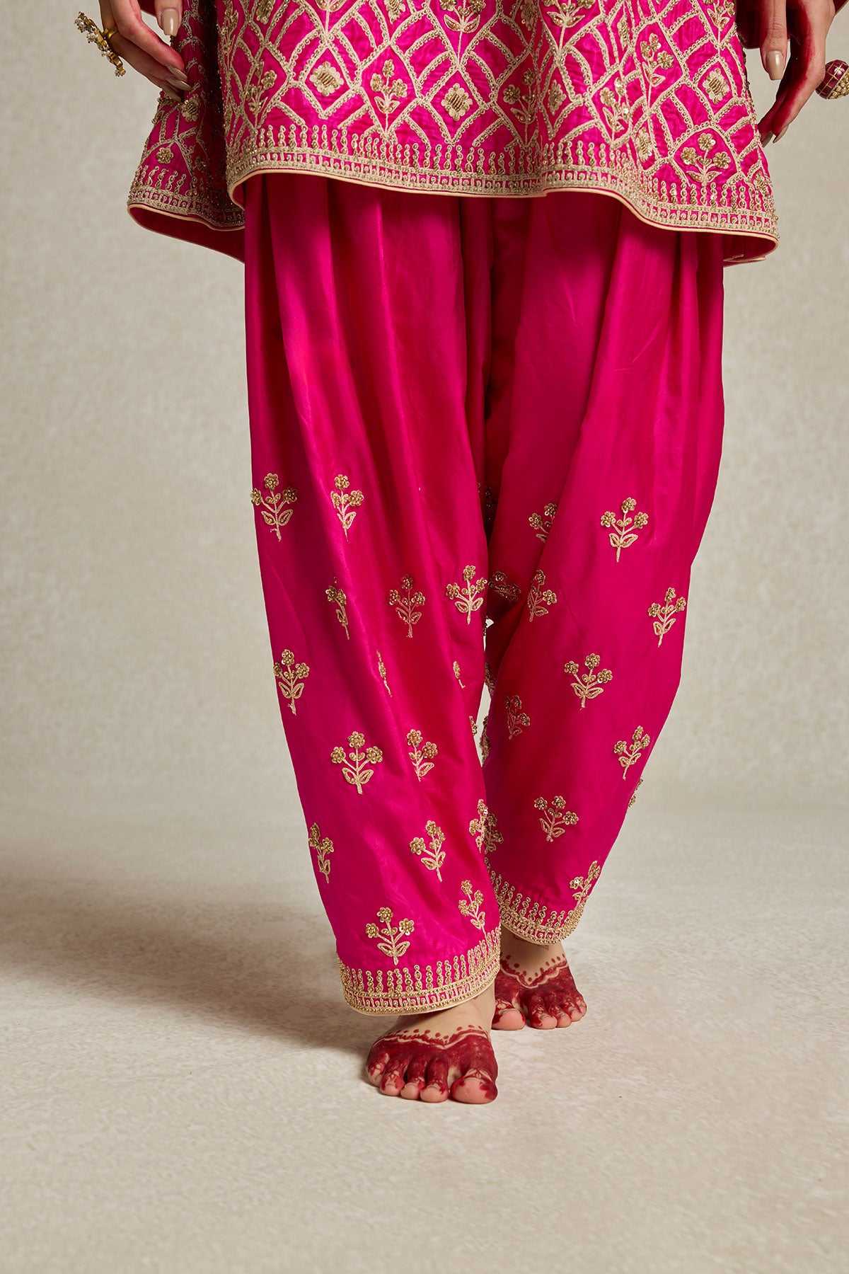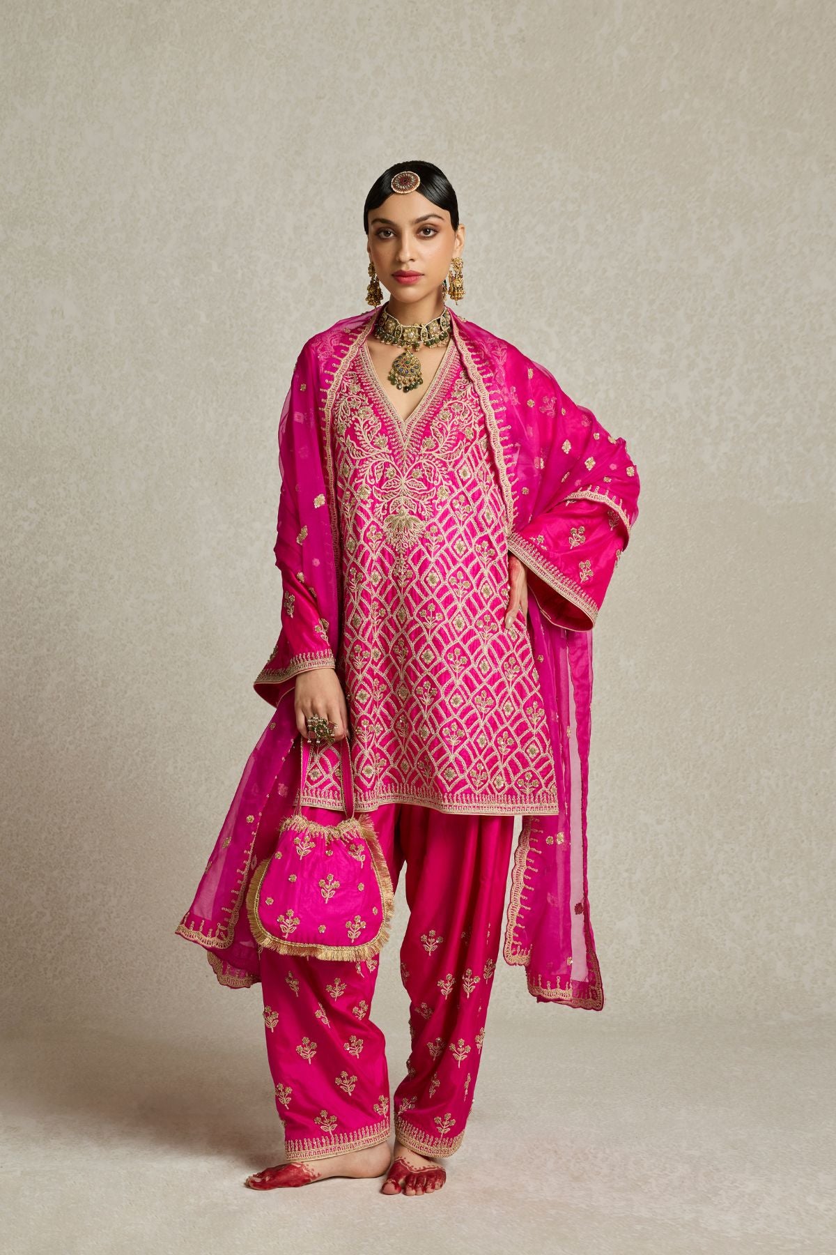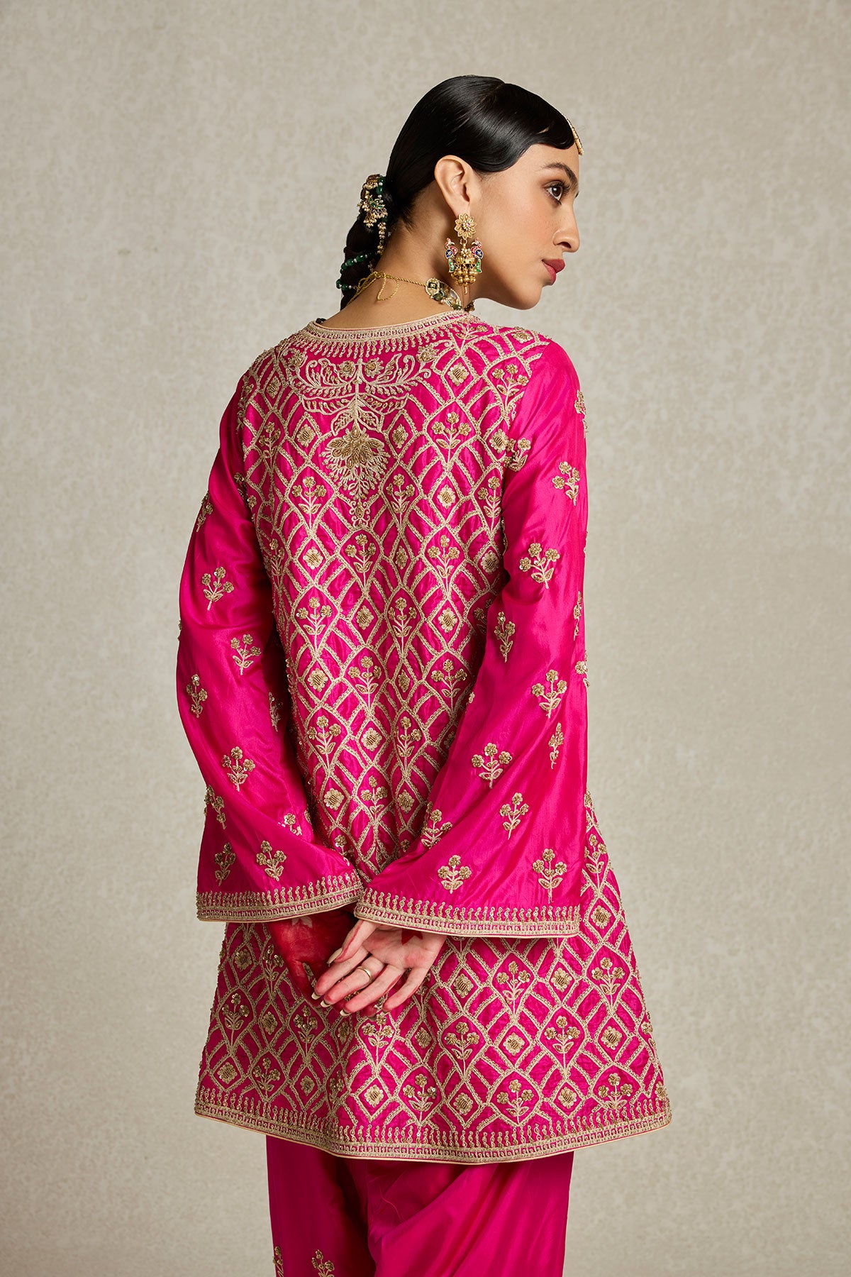 This short kurta and salwar set in rani pink captures the essence of 1980s Punjab with its lively and rich embroidery. Kiran dori, sitara, and beadwork embellish the surface of the kurta and salwar, creating a vibrant yet traditional look that’s perfect for the spirited woman who lights up every celebration.