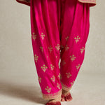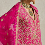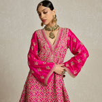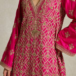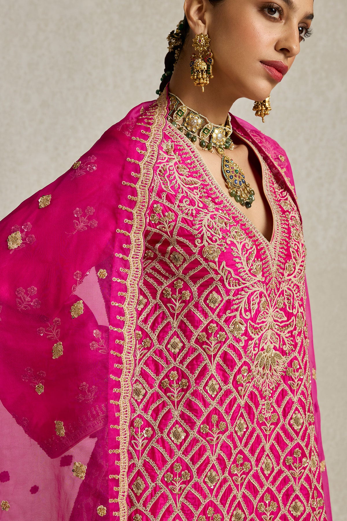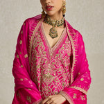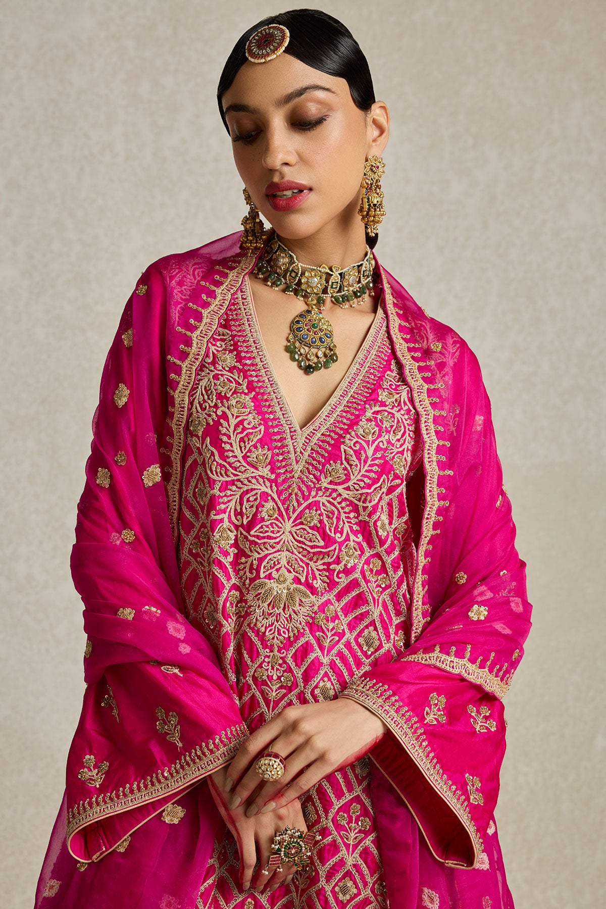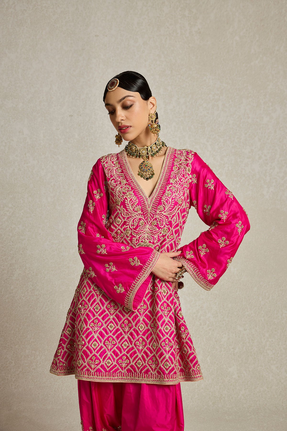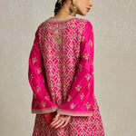 This short kurta and salwar set in rani pink captures the essence of 1980s Punjab with its lively and rich embroidery. Kiran dori, sitara, and beadwork embellish the surface of the kurta and salwar, creating a vibrant yet traditional look that’s perfect for the spirited woman who lights up every celebration.
