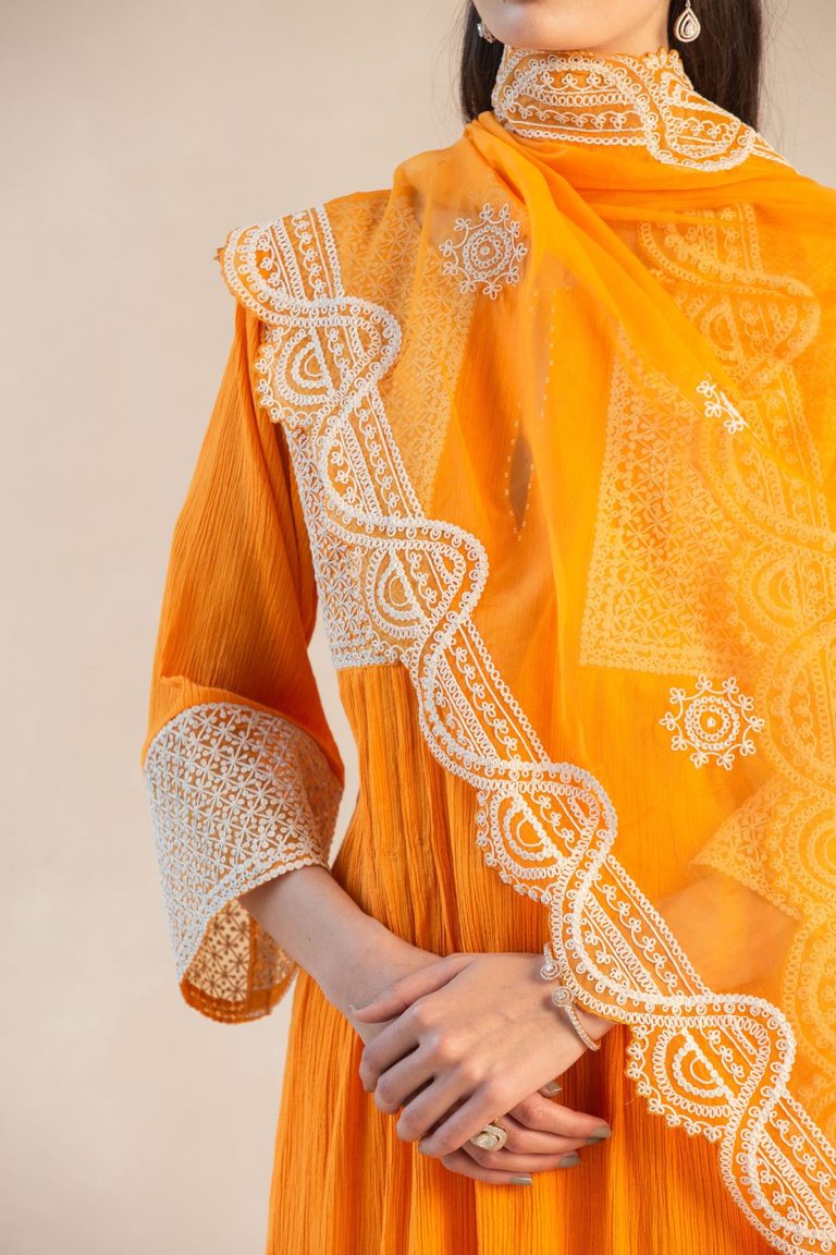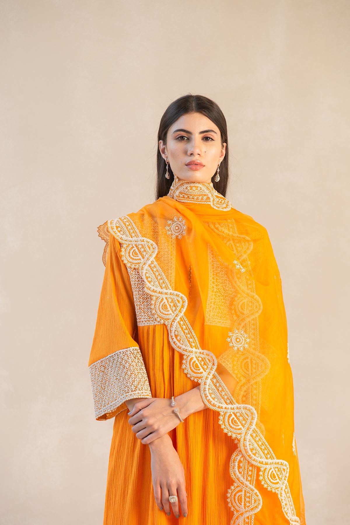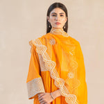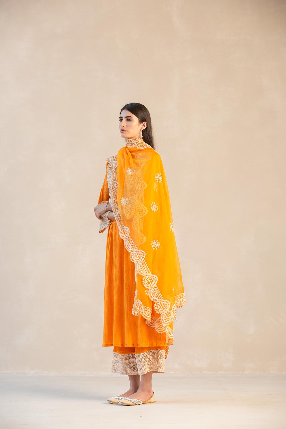 Expert ecru dori work lines the edges of this ice blue outfit. Thick bands on the straight-cut palazzo pants and sleeves, through to a modest yoke and intertwined link across a gently rippled dupatta edge–all in lightweight cotton gauze and organza.