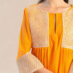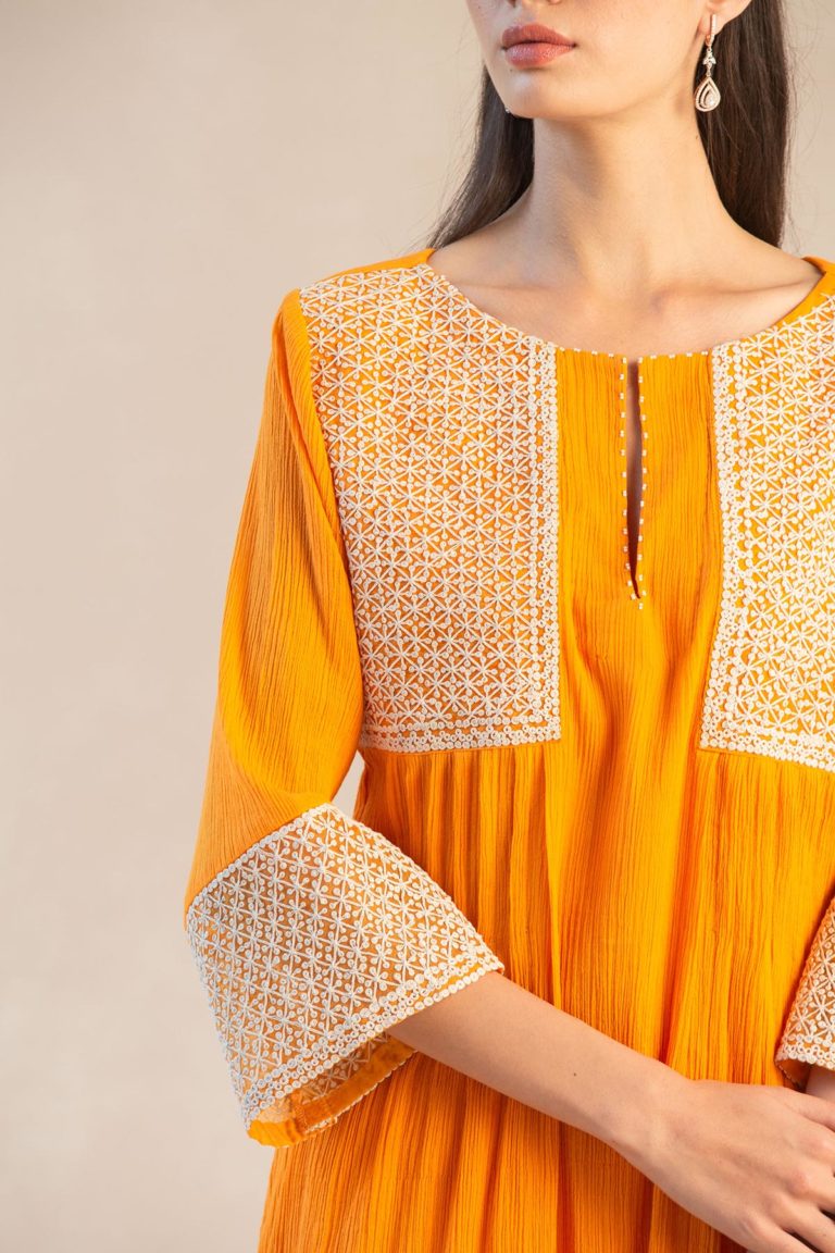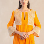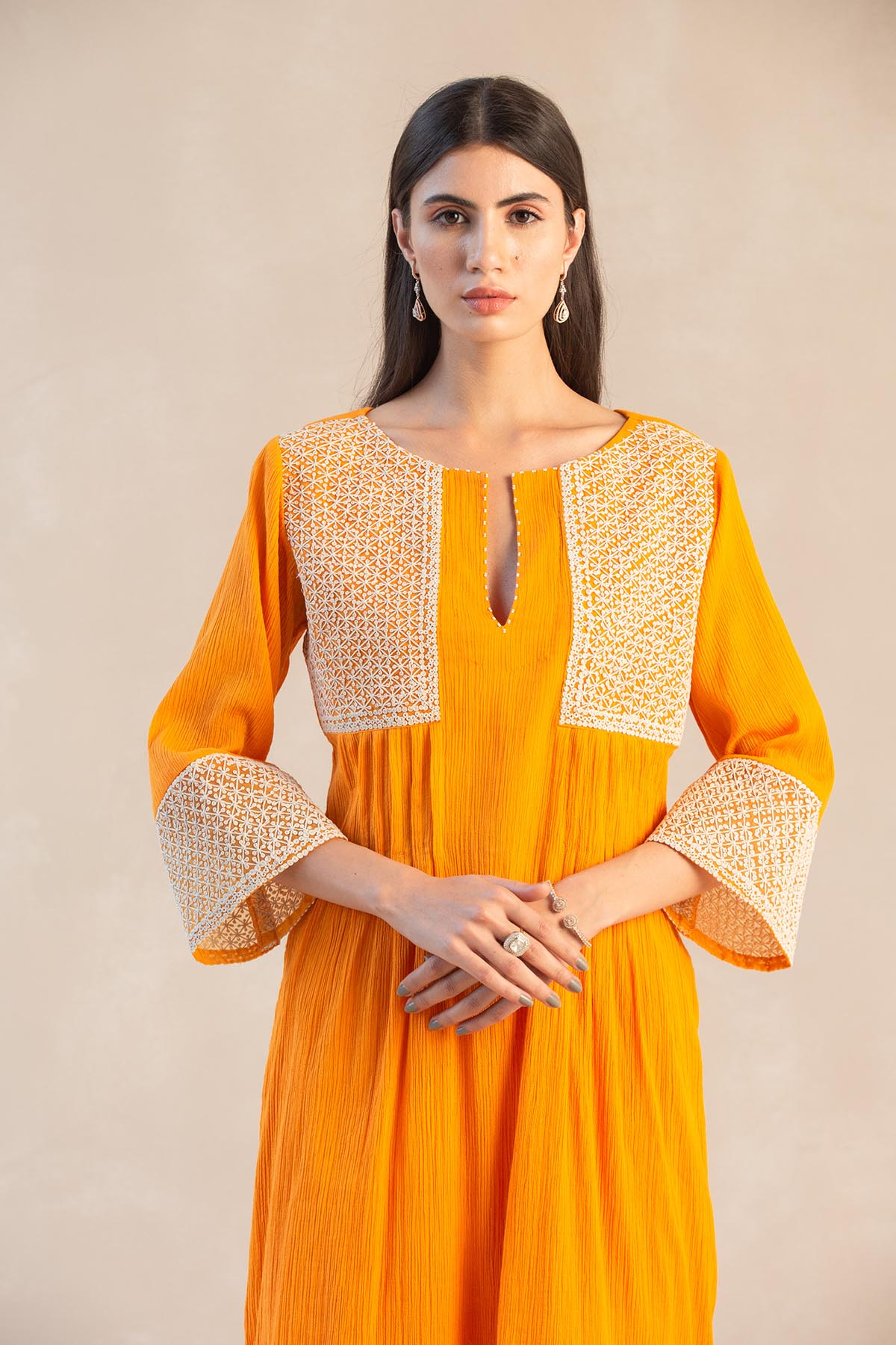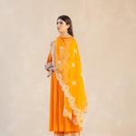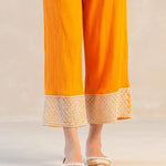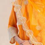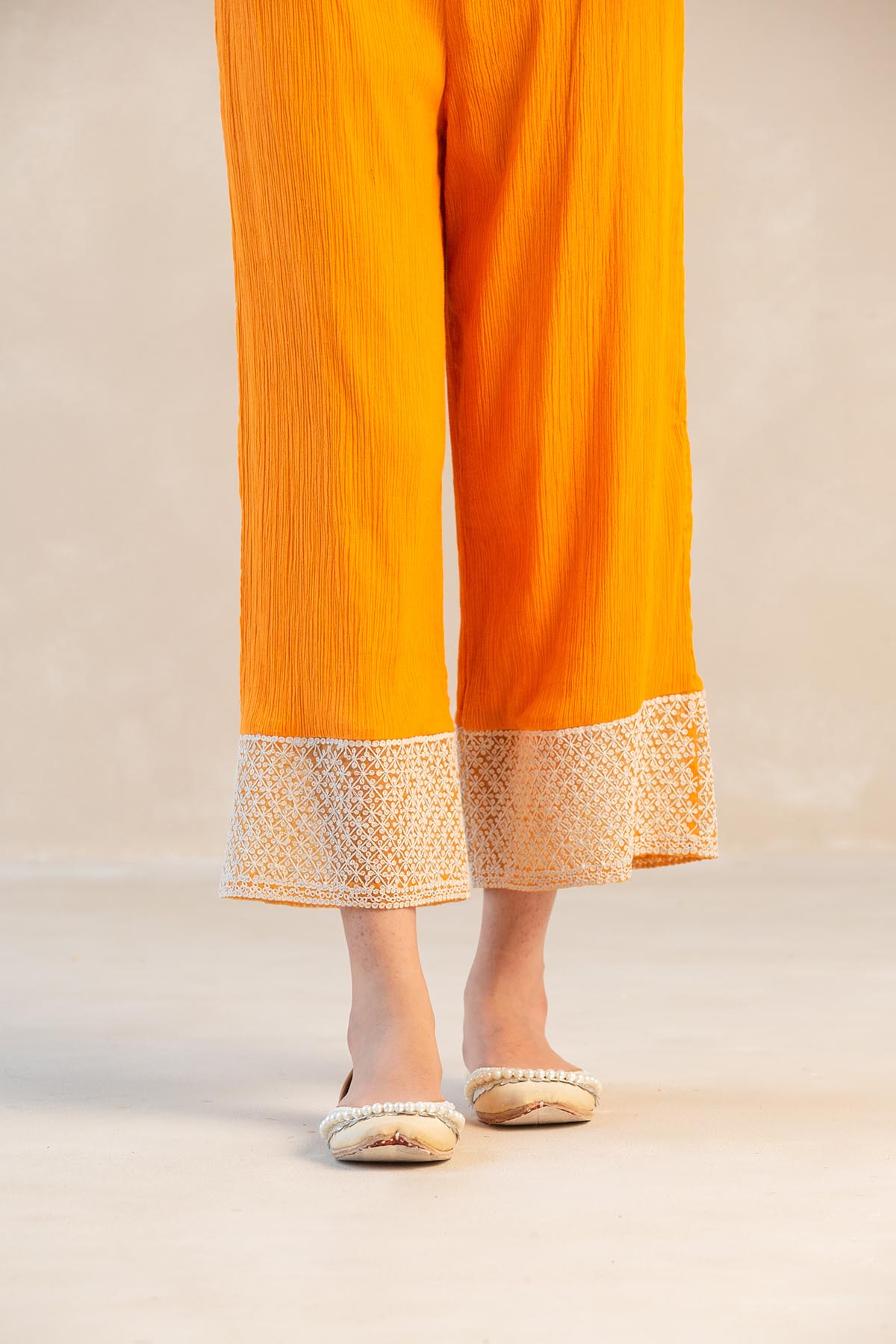 Expert ecru dori work lines the edges of this ice blue outfit. Thick bands on the straight-cut palazzo pants and sleeves, through to a modest yoke and intertwined link across a gently rippled dupatta edge–all in lightweight cotton gauze and organza.