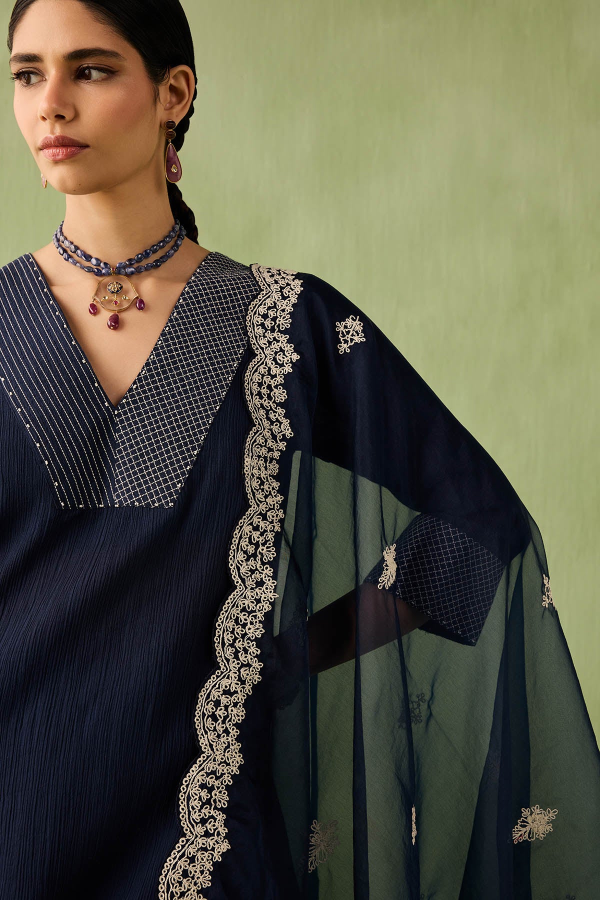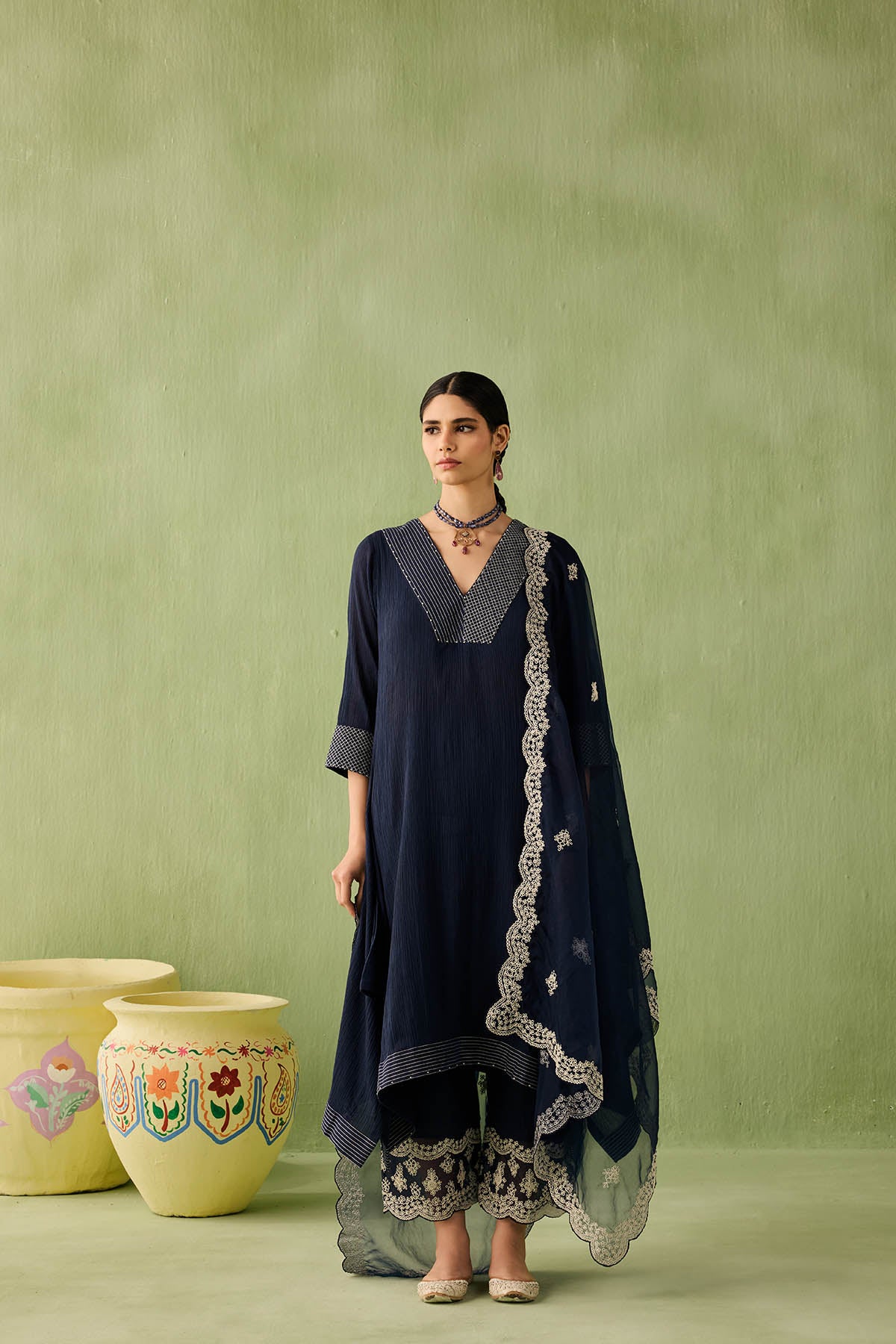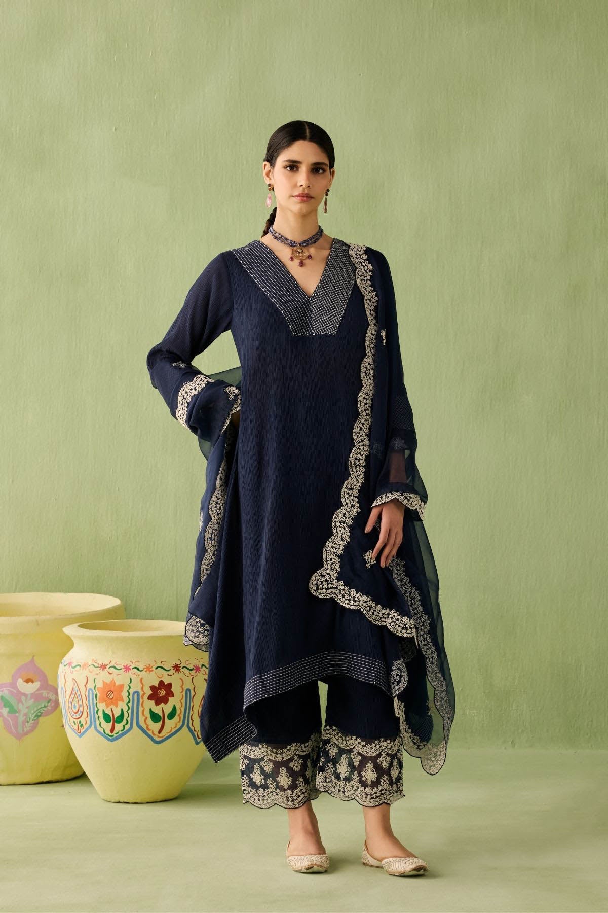 In a soft day-time beige, this breezy kurta set in cotton gauze comes with an abstract waterfall hemline. The scallops on the pants and diaphanous oragnza dupatta are embroidered and sprinkled with ecru threadwork motifs.