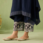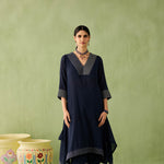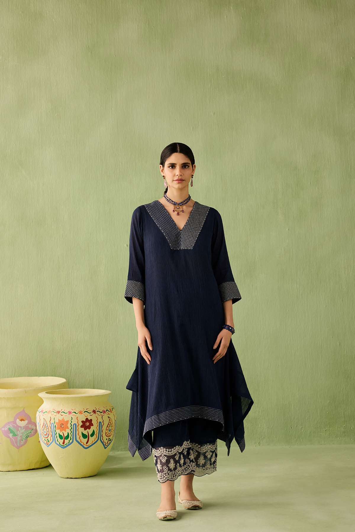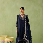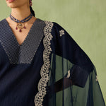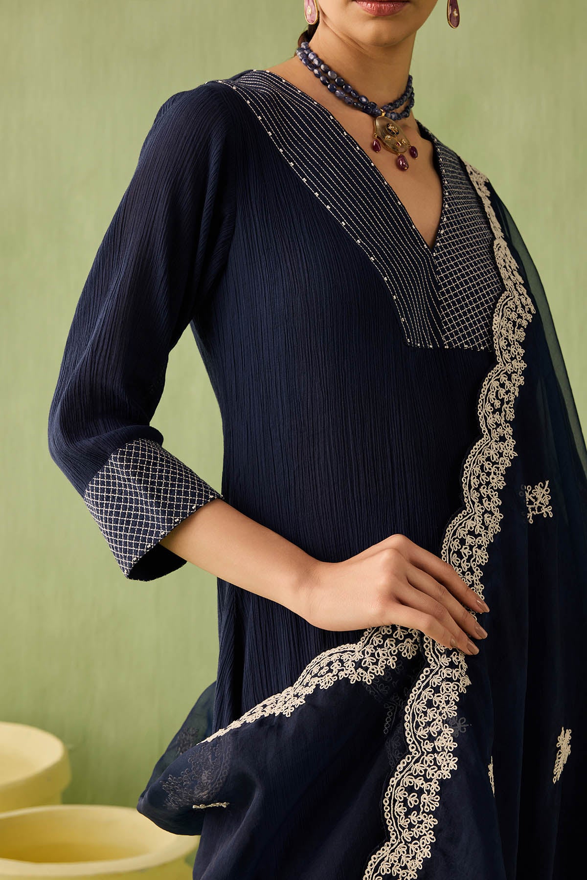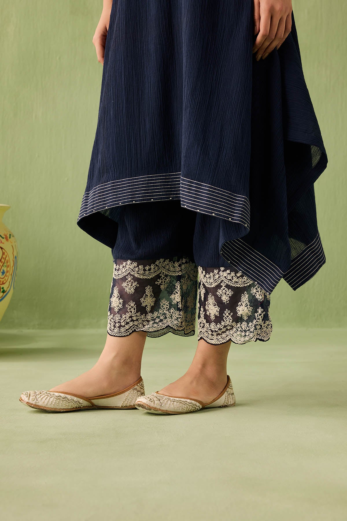 In a soft day-time beige, this breezy kurta set in cotton gauze comes with an abstract waterfall hemline. The scallops on the pants and diaphanous oragnza dupatta are embroidered and sprinkled with ecru threadwork motifs.