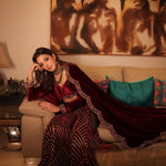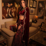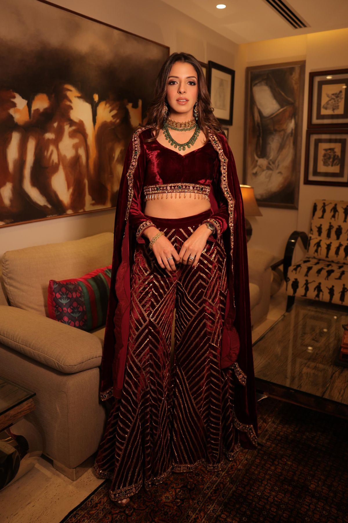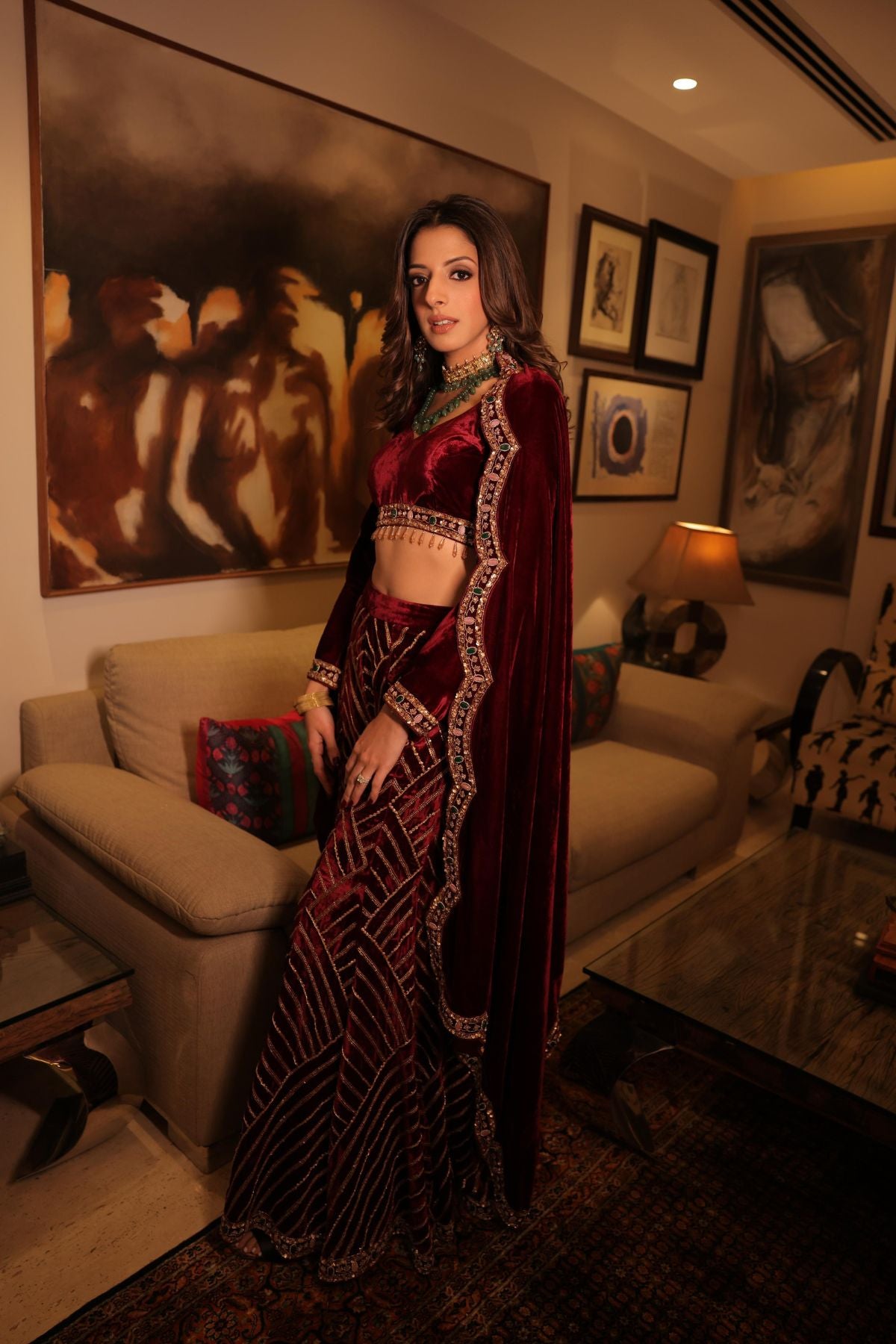 Borrowed from the past – this season, we revisit the old-world sharara silhouette to reimagine it for present-day festivities. The result is our hero silhouette for the season. A draped silk velvet take on the sharara paired with a matching blouse and scalloped dupatta, accentuated with semi-precious embellishments and antique gold embroideries.