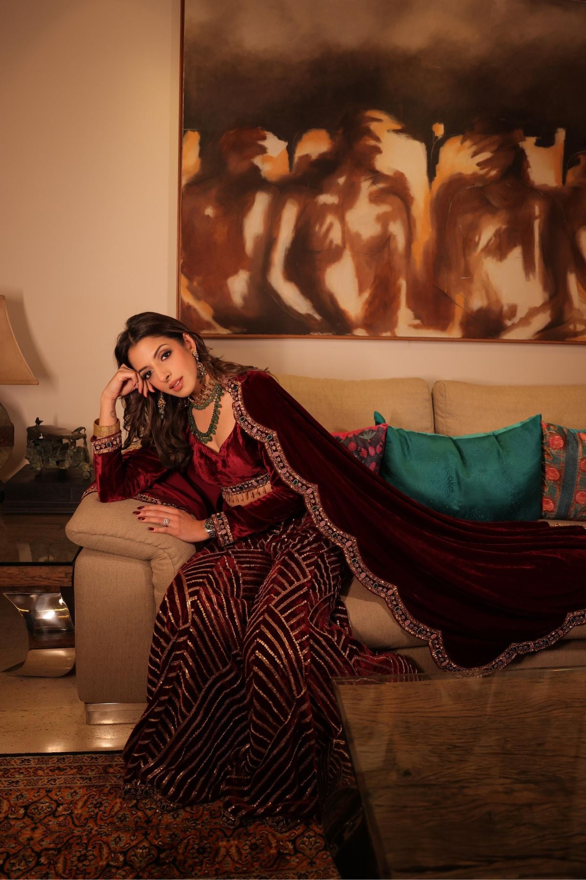 Custom Silk Velvet Scalloped Drape Sharara Set