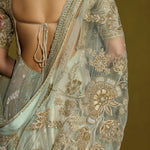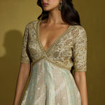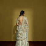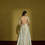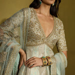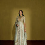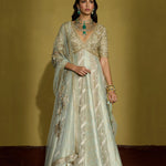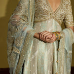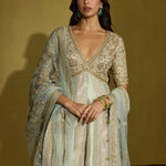 An anarkali that is all about decadence—this ensemble intertwines zari silk tissue with brocade patches, creating a rich medley of textures in serene sage green. The accompanying net dupatta, adorned with oversized handcrafted motifs, becomes a statement in itself. Perfect for a curated trousseau or intimate celebrations, it’s a harmonious blend of artisanal craftsmanship and timeless luxury.