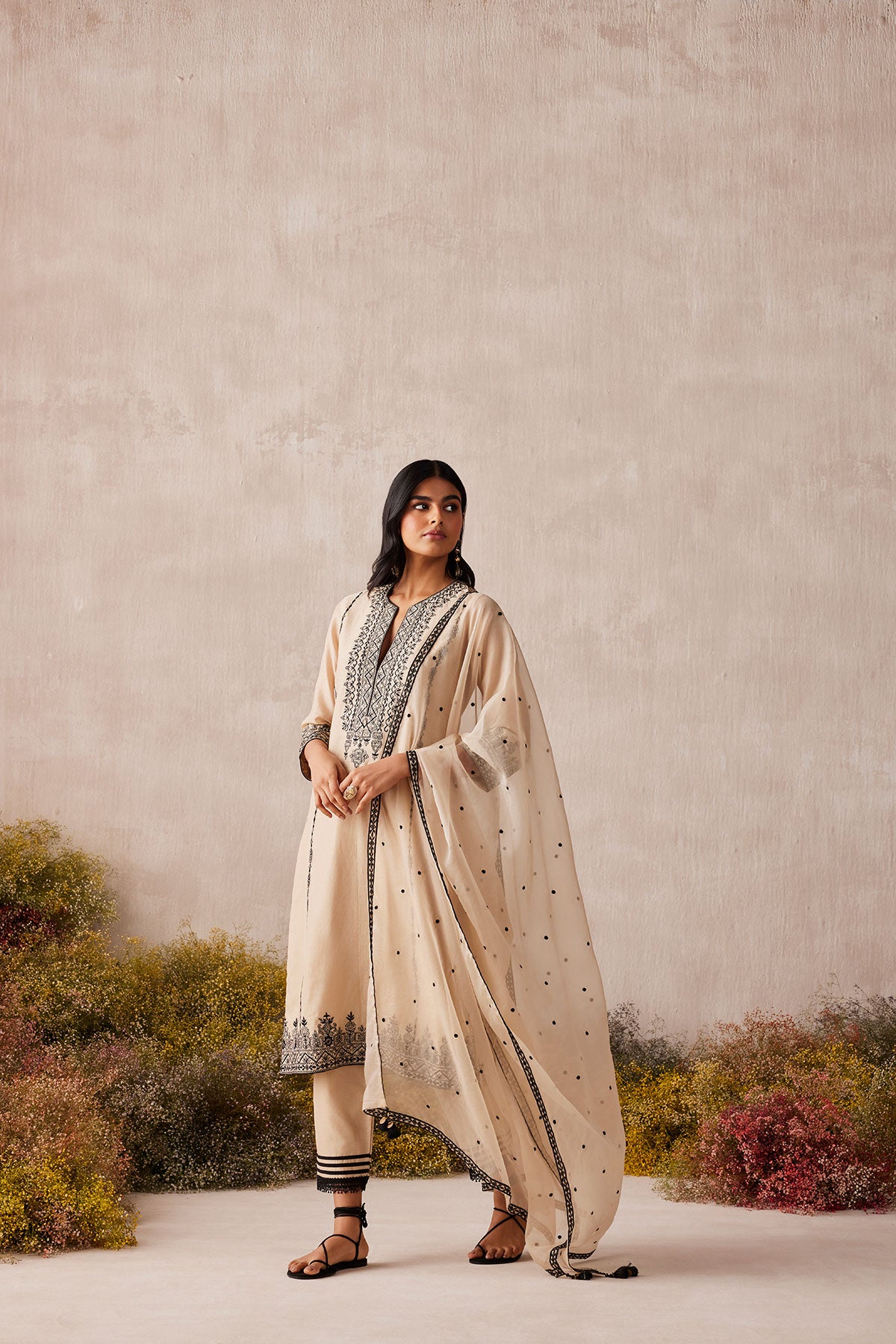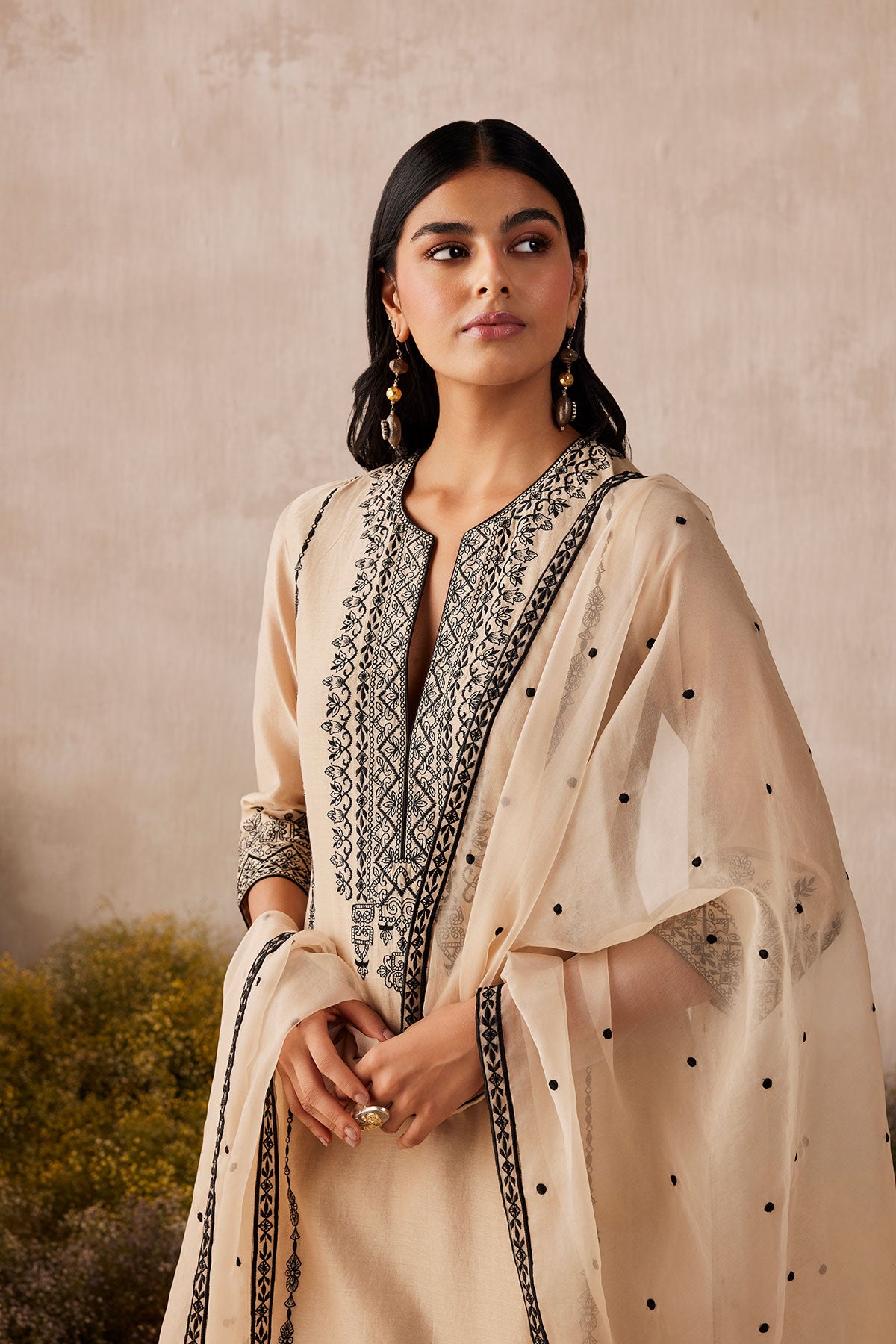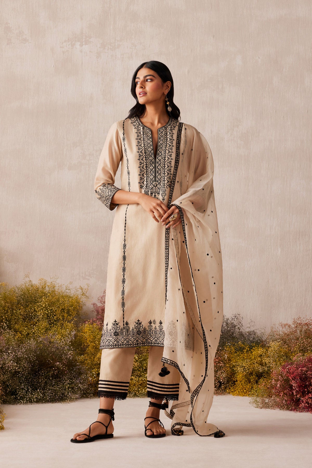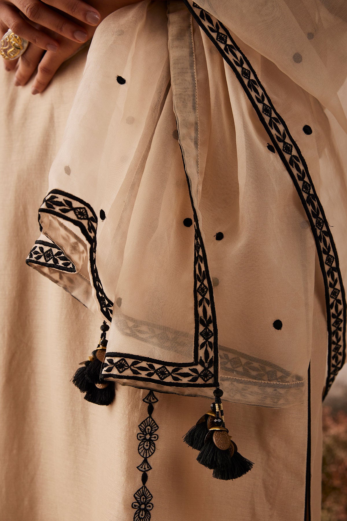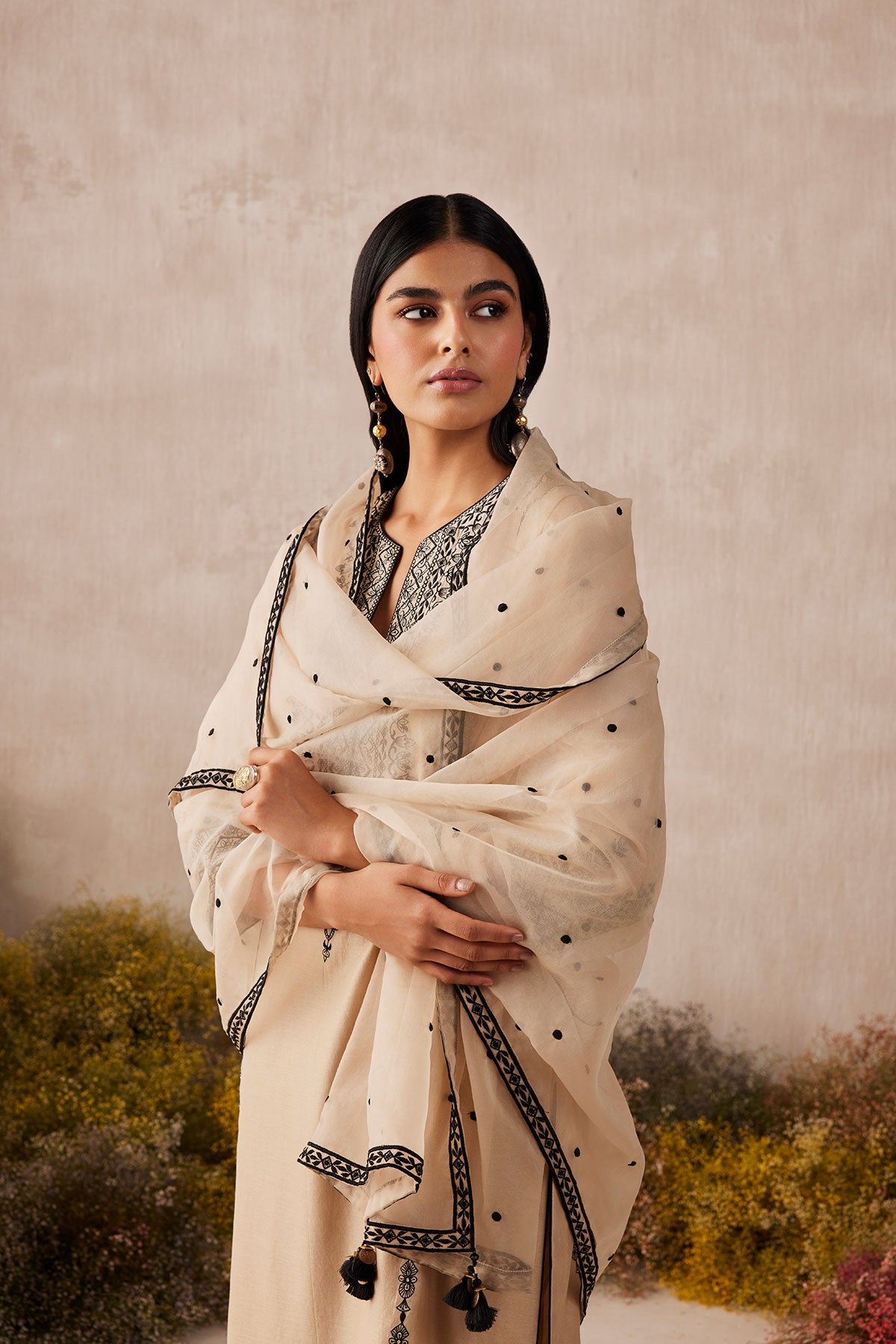 The dark beige base of this silk chanderi kurta is elevated with contrast black threadwork in an intricate floral jaal along the yoke. The bottoms feature delicate lacework and striped applique patches while the sheer organza dupatta comes with small motifs sprinkled across the surface. There is something about contrast threadwork that just always stands out!