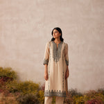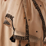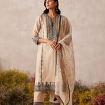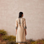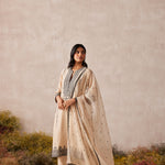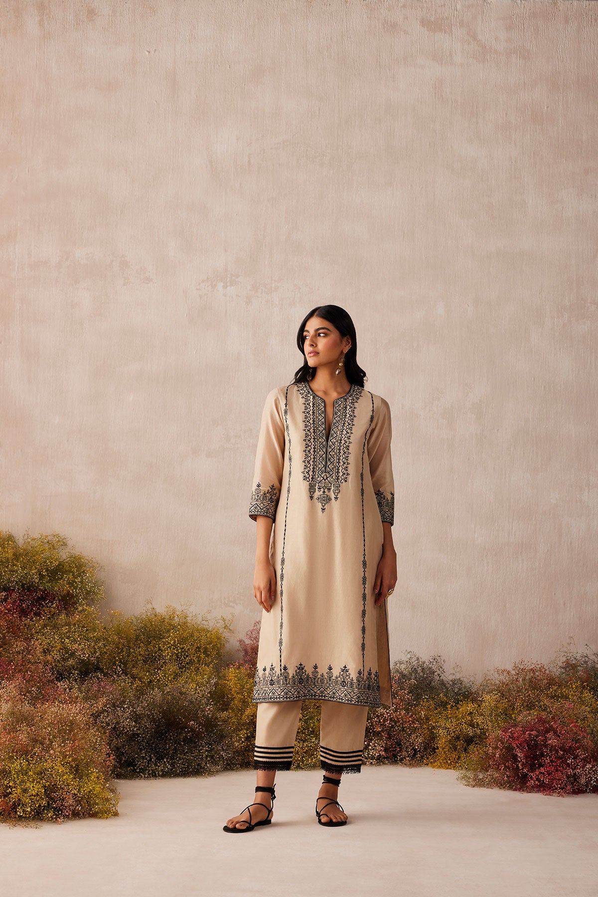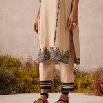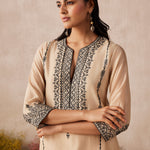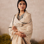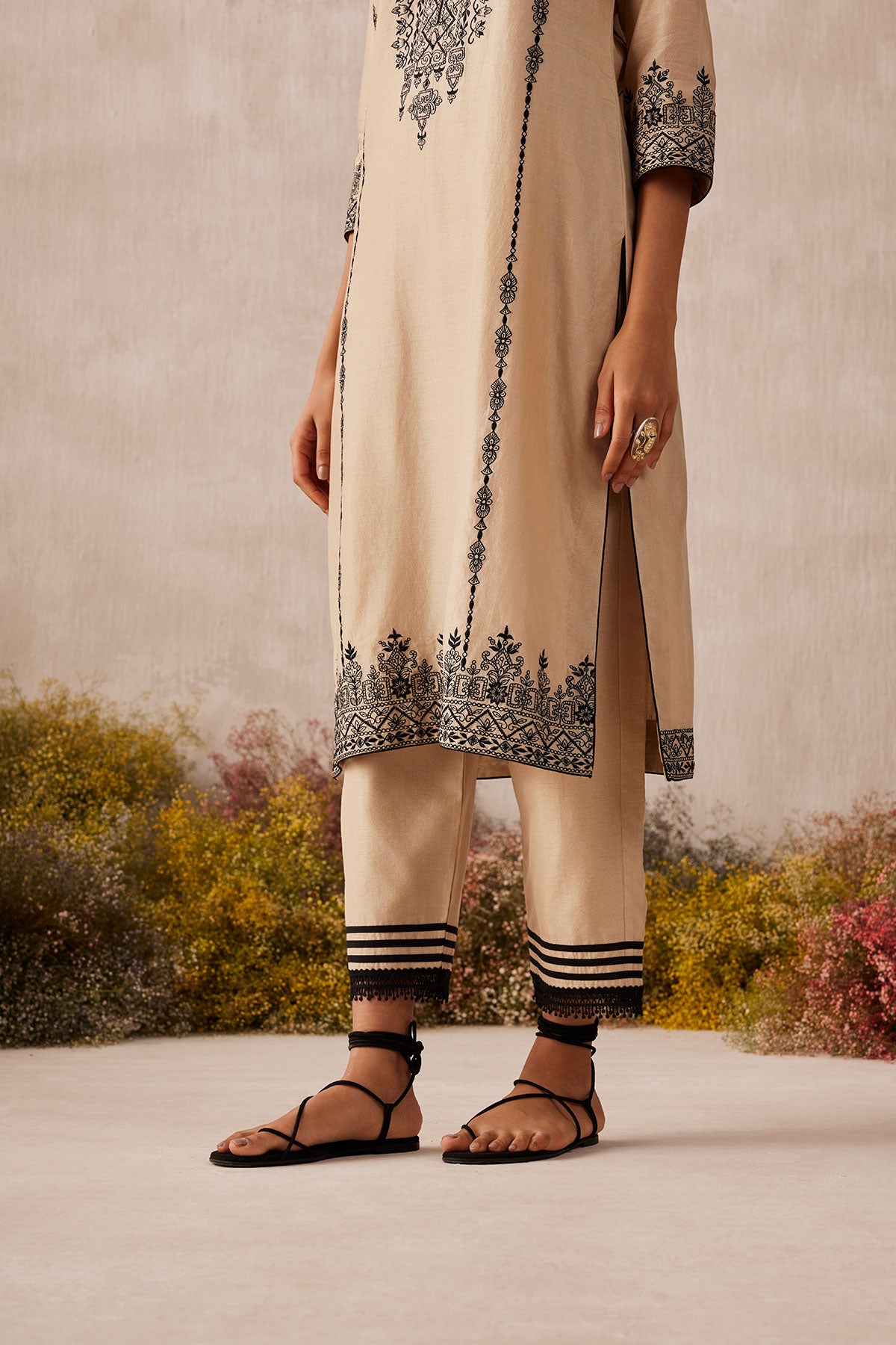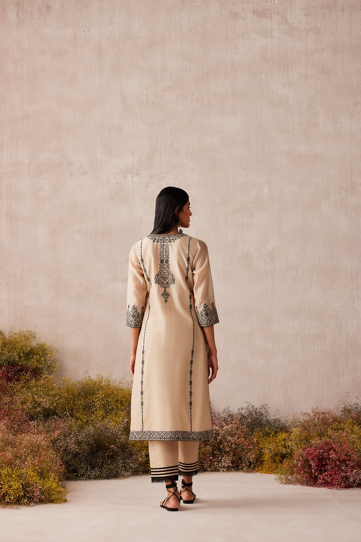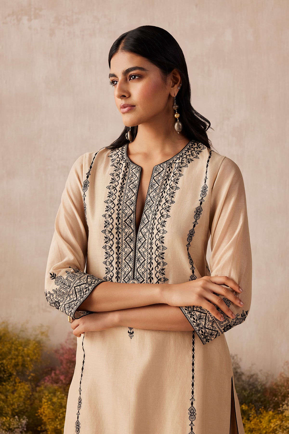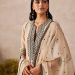 The dark beige base of this silk chanderi kurta is elevated with contrast black threadwork in an intricate floral jaal along the yoke. The bottoms feature delicate lacework and striped applique patches while the sheer organza dupatta comes with small motifs sprinkled across the surface. There is something about contrast threadwork that just always stands out!