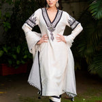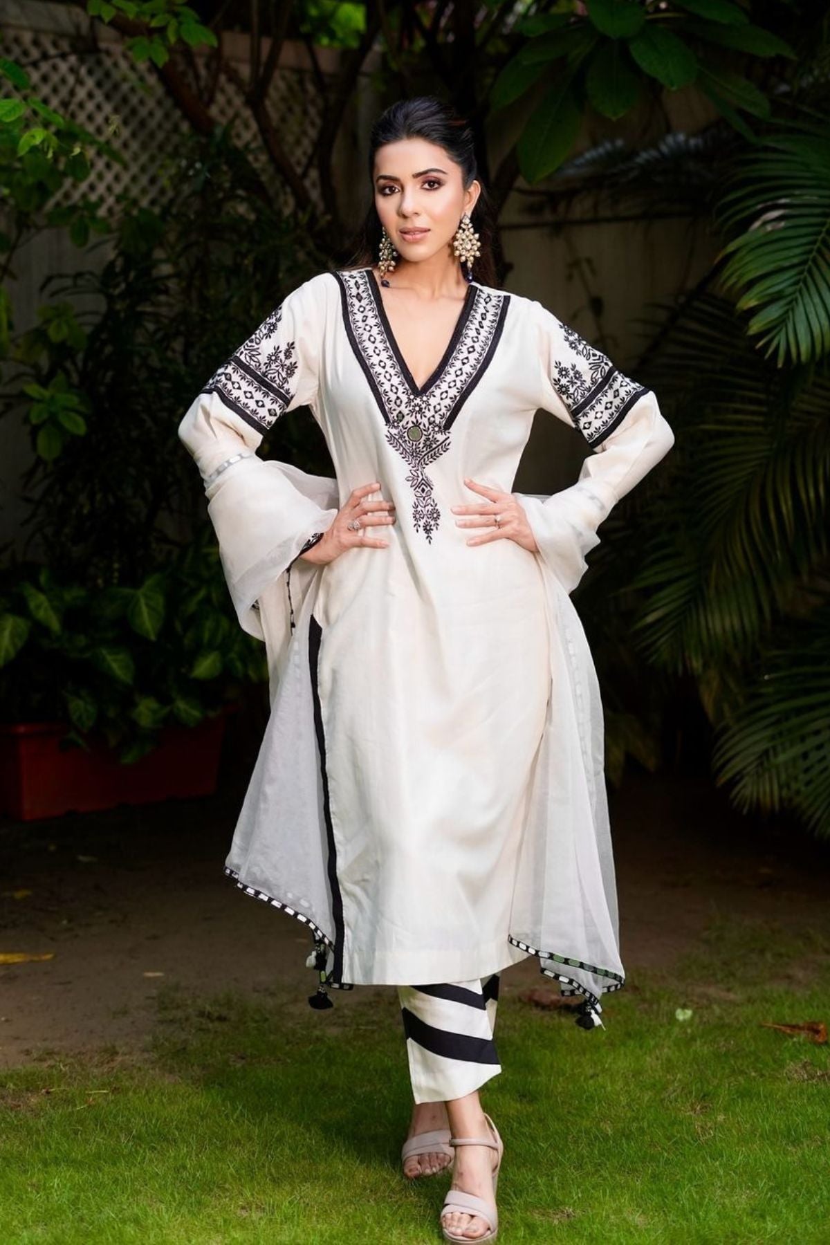 This straight cut kurta set goes the extra mile as separates. On a clear enamel base, ebony gota patti, resham, and mirror work line hemlines and cuffs, perfect to sit as a set, or to be matched separately with existing colours in your closet.