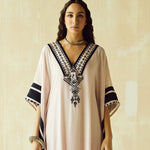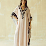 Muslin drapes down the shoulder to the ankle in this floor-skimming kaftan with a plunging neckline and contrast appliqué panel hemming the sides. An intricately embroidered yoke is what makes this resort-ready look go the extra mile.