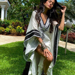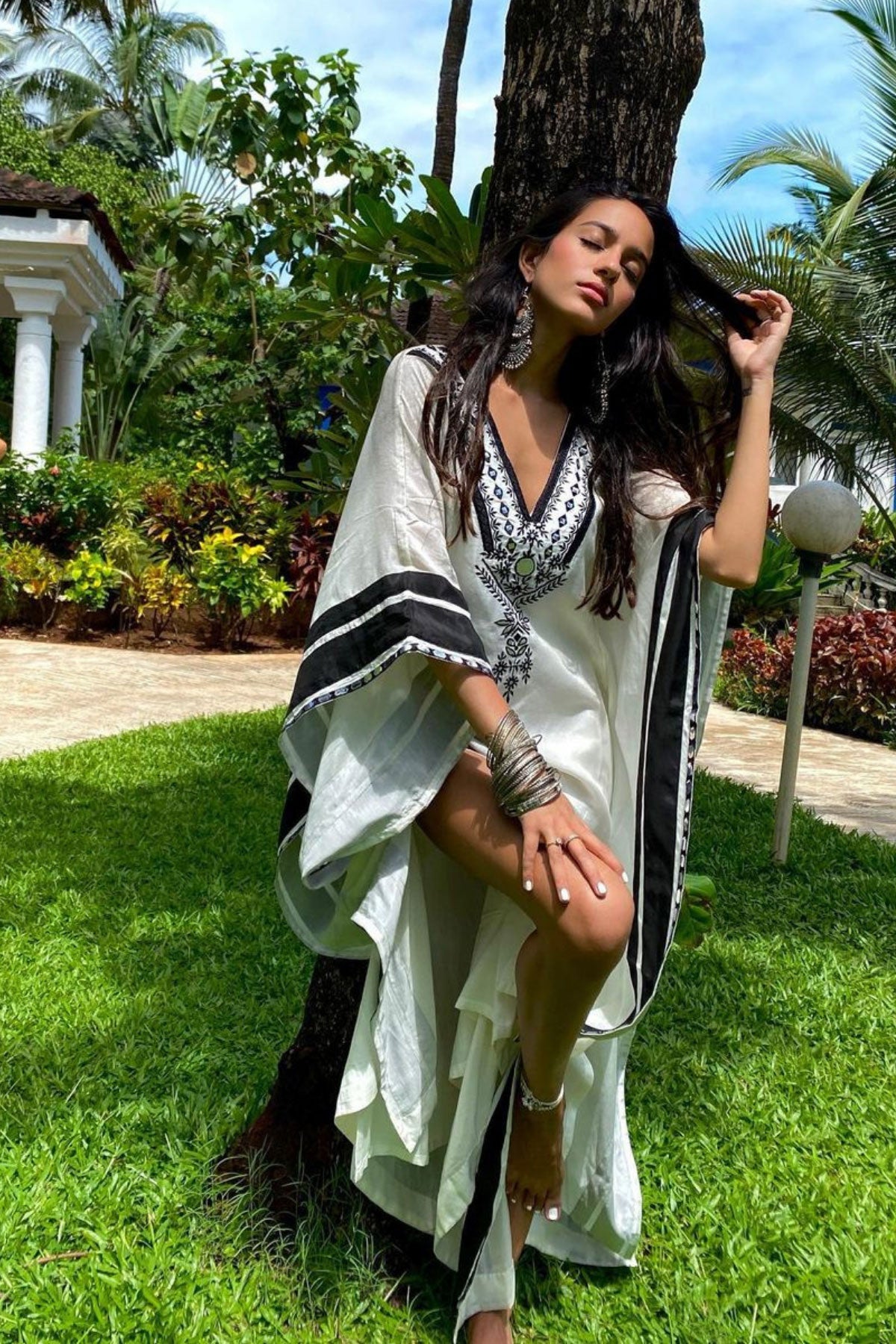 Ivory Muslin drapes down the shoulder to the ankle in this floor-skimming kaftan with a plunging neckline and contrast appliqué panel hemming the sides. An intricately embroidered yoke is what makes this resort-ready look that go the extra mile.