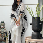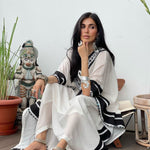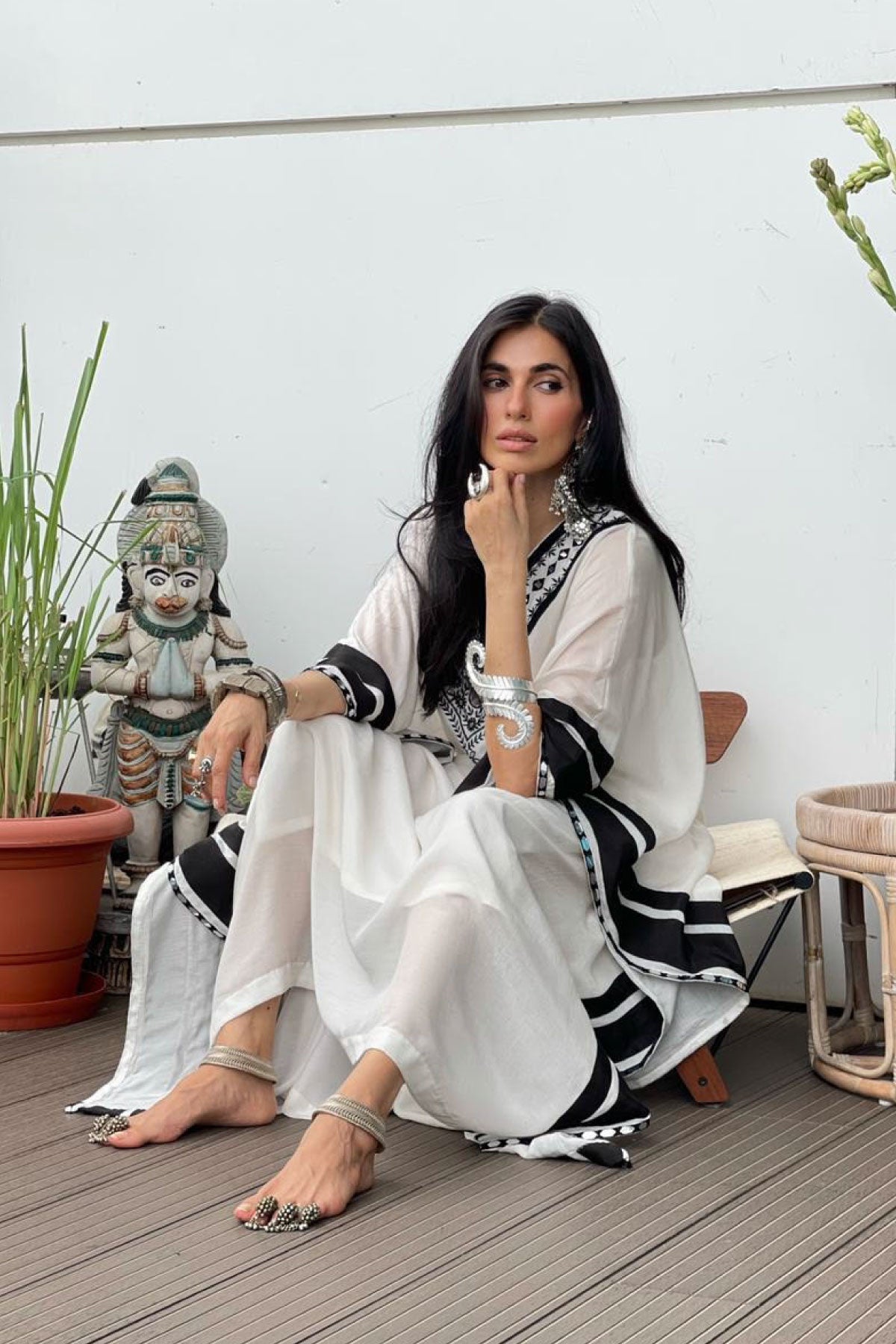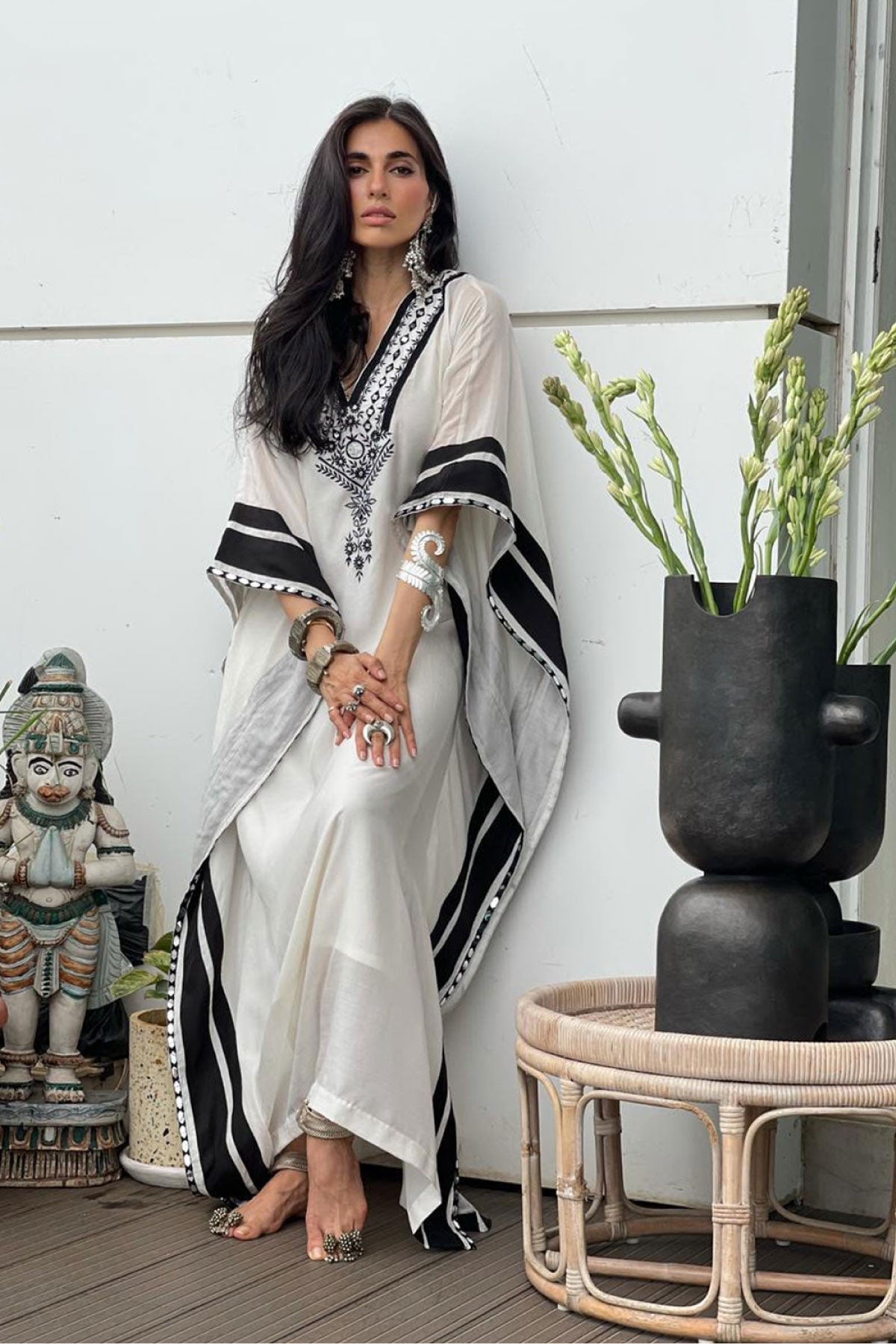 Ivory Muslin drapes down the shoulder to the ankle in this floor-skimming kaftan with a plunging neckline and contrast appliqué panel hemming the sides. An intricately embroidered yoke is what makes this resort-ready look that go the extra mile.