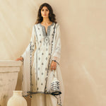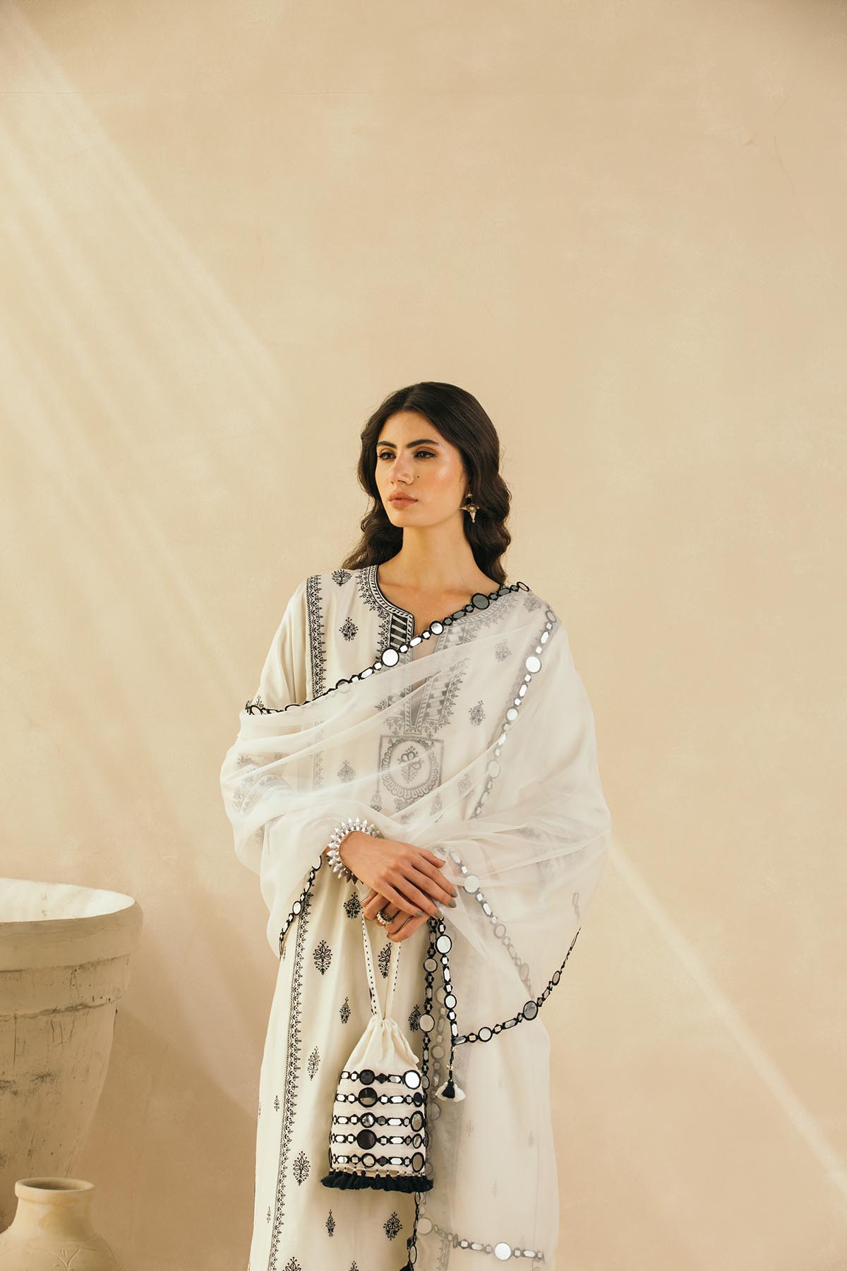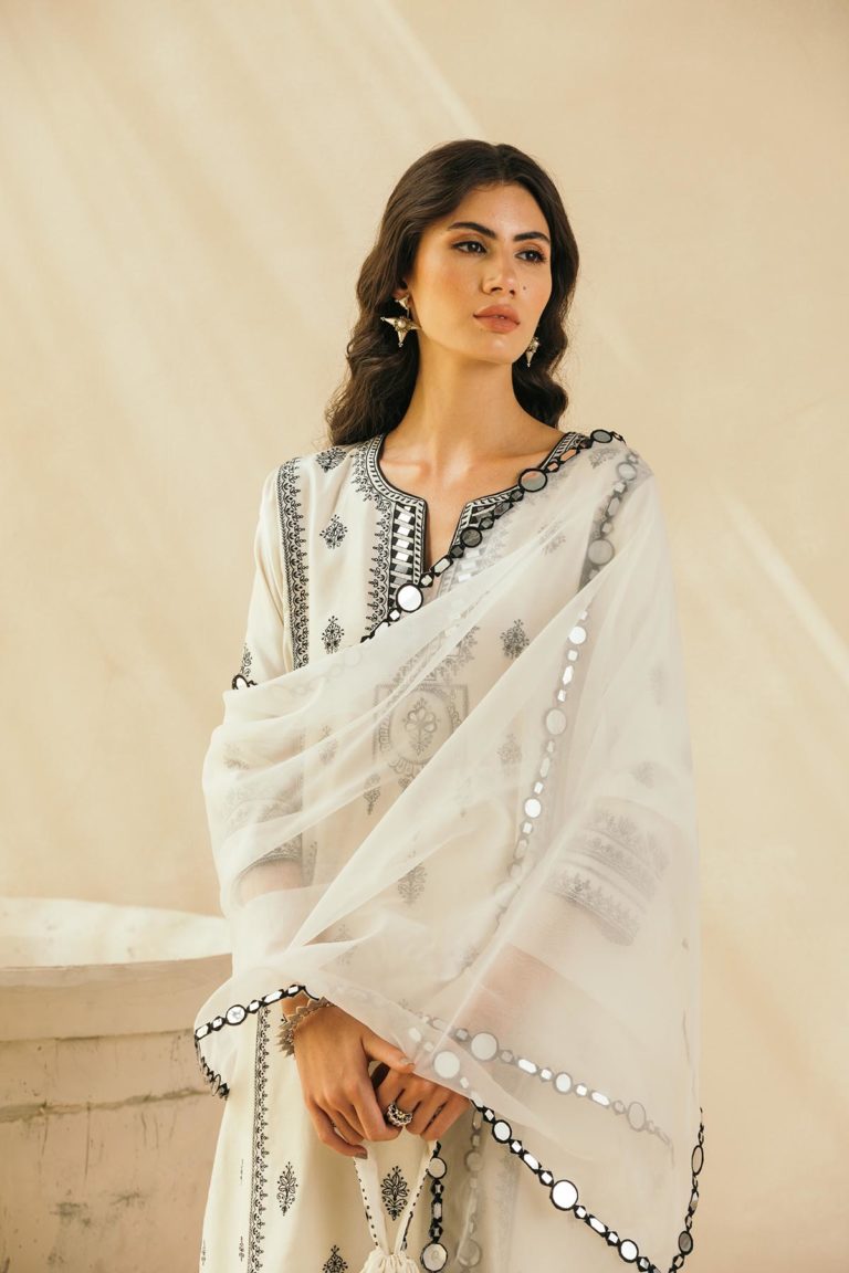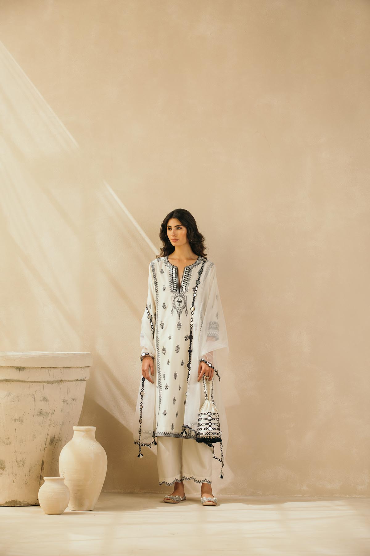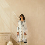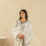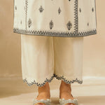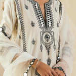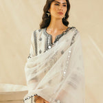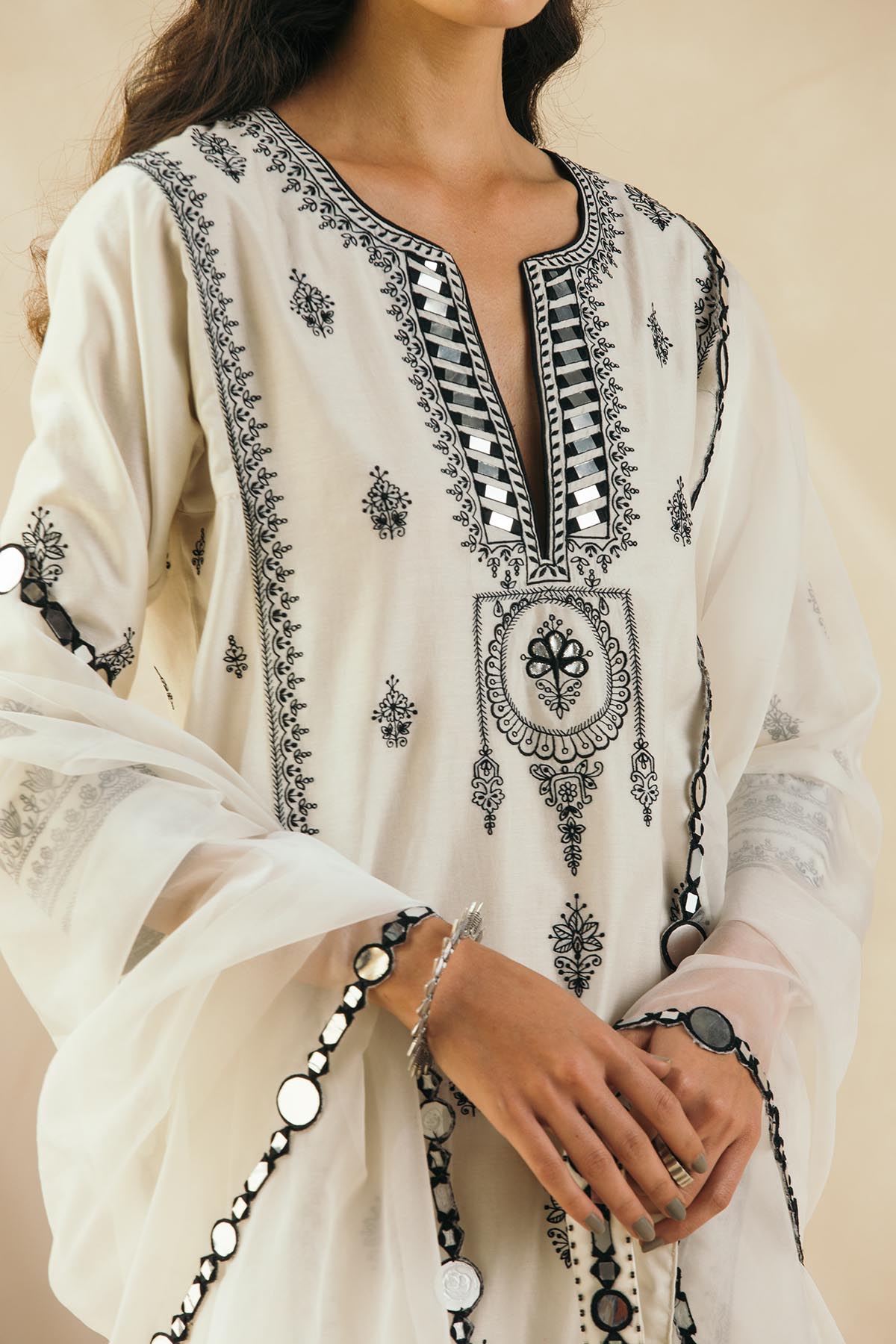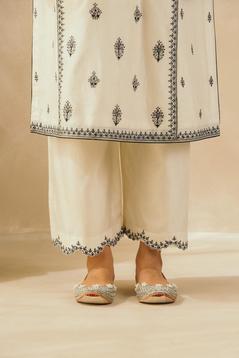 Ebony & Ivory perfection — This kalidaar silk chanderi embroidered kurta comes with scalloped palazzos and a buttery organza dupatta that is edged with abstract mirrors across the border. The thread work embroidered motifs spread across the kurta are the hero of this piece, and find their inspiration in the royal robes of Mughal queens.