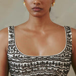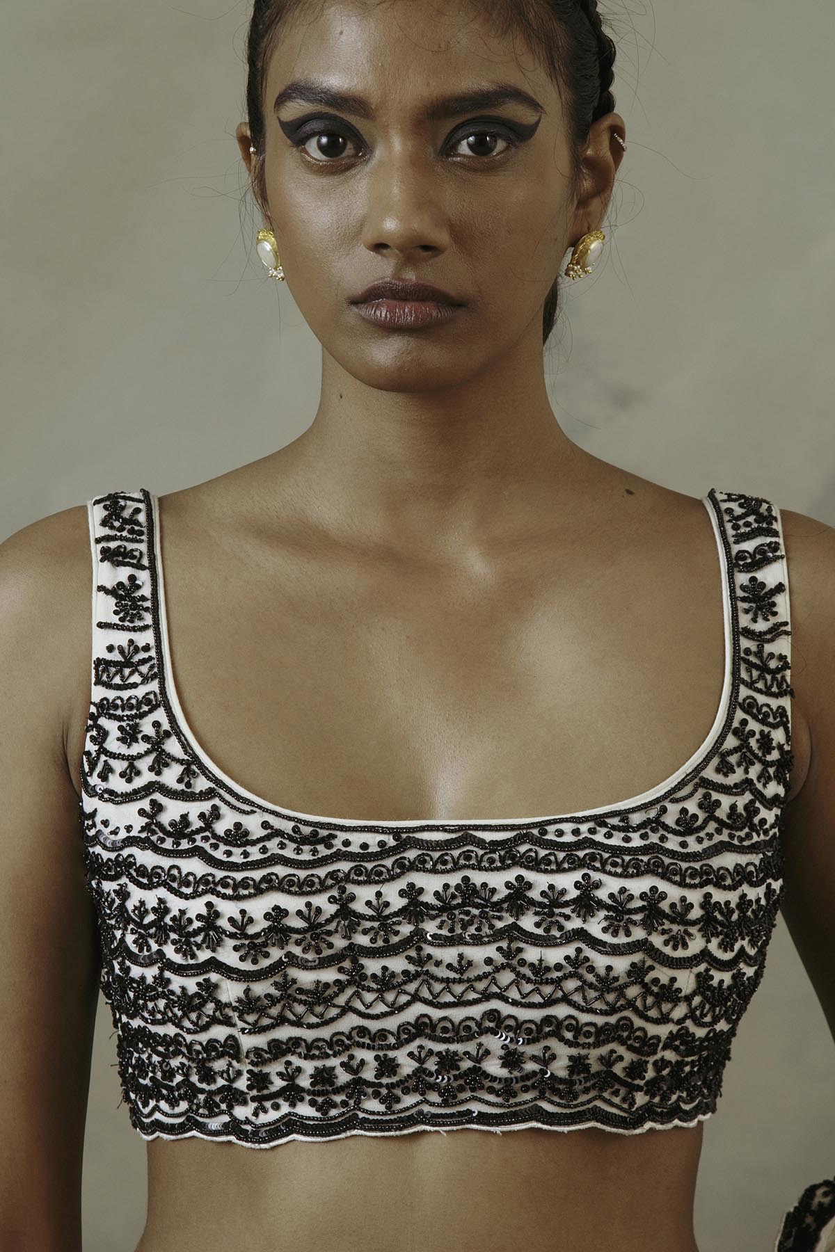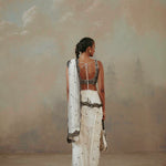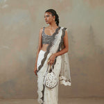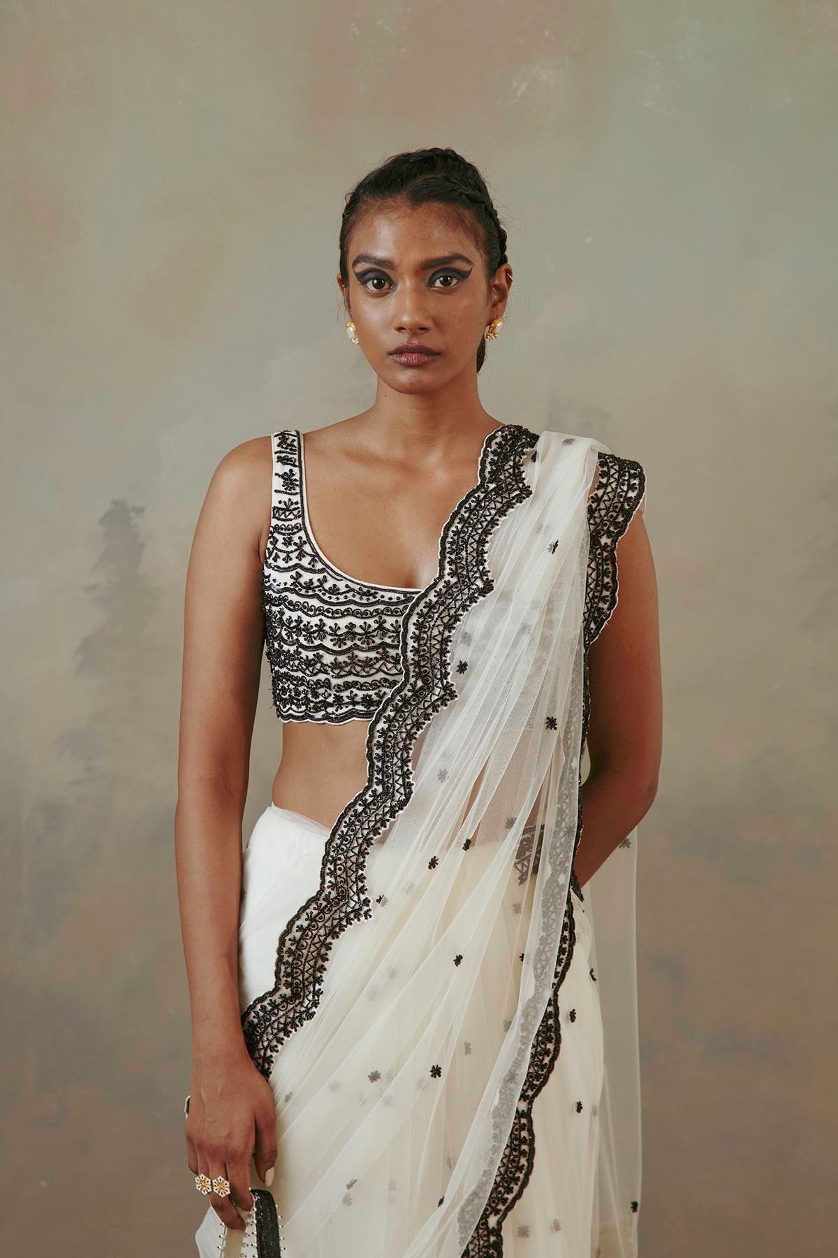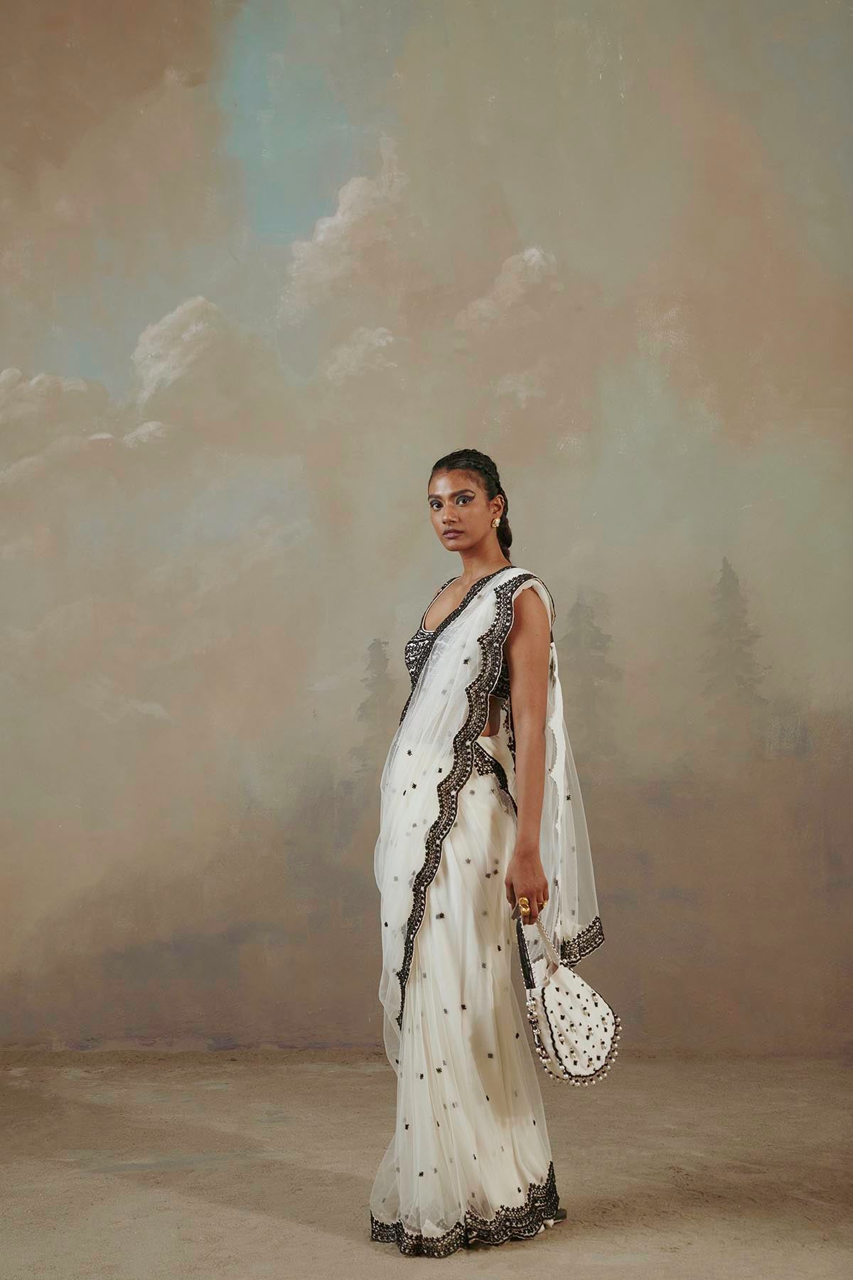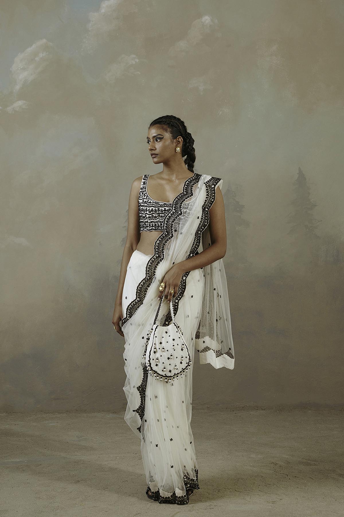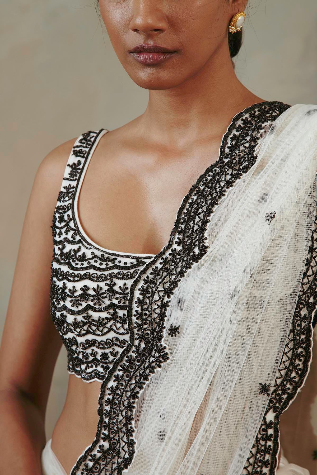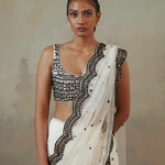 Our gossamer net saree in pristine ivory with a delicately scalloped contrast border is all about minimum effort, maximum effect. The silk chanderi sequins and bead work blouse adds allure to the look while the color palette keeps it close to tradition. Adorned with a mix of ebony beads, delicate sequins and cutdana work, the scalloped border is sure to add stop and stare intrigue to your repertoire.