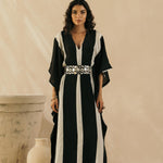 Cinched at the waist with a mirrored obi belt, this breezy muslin kaftan with bold awning stripes works wonders out on city asphalt, or barefoot by the beach.