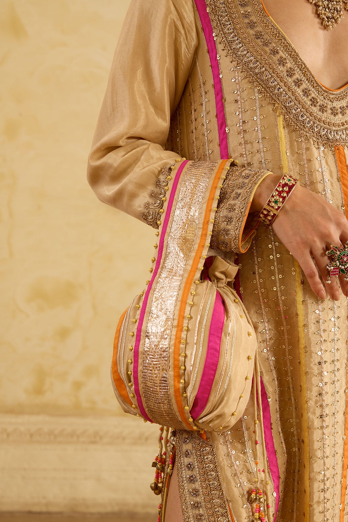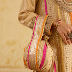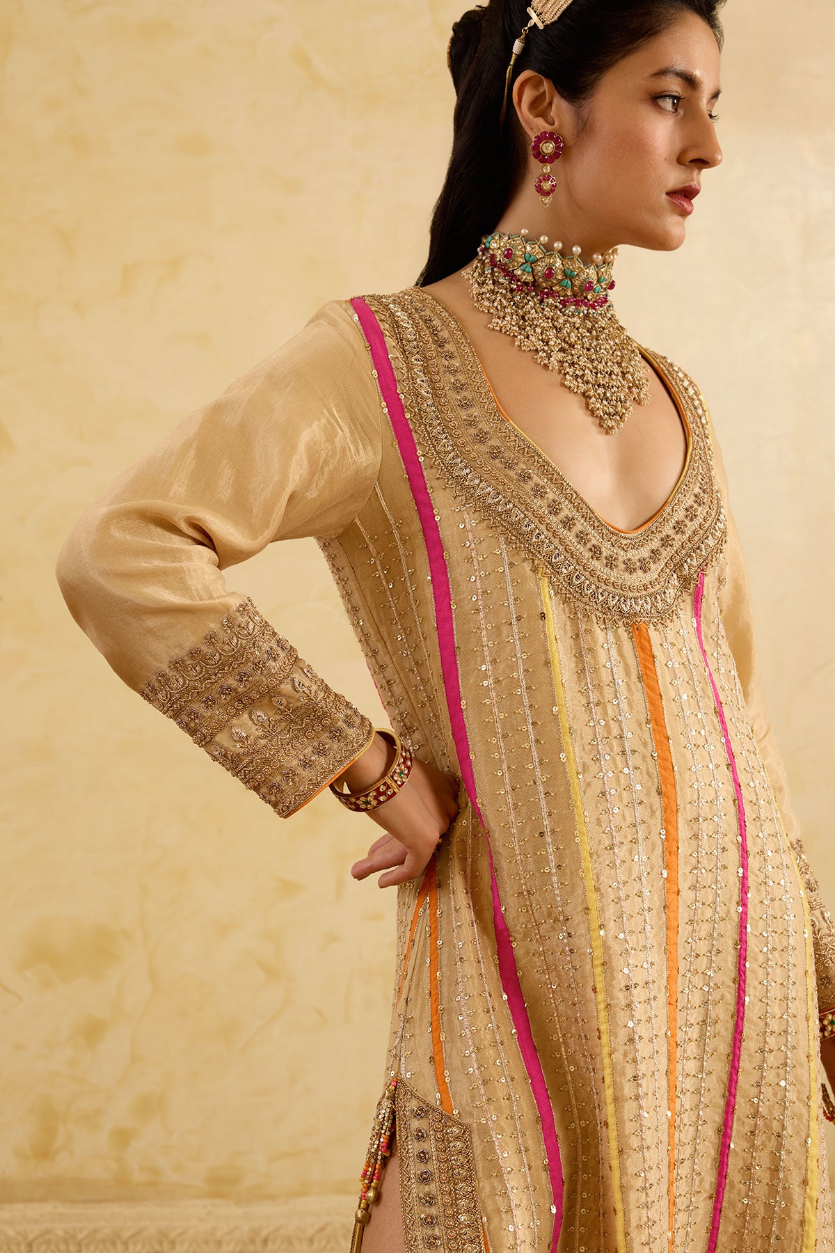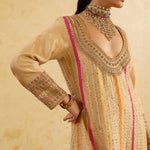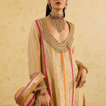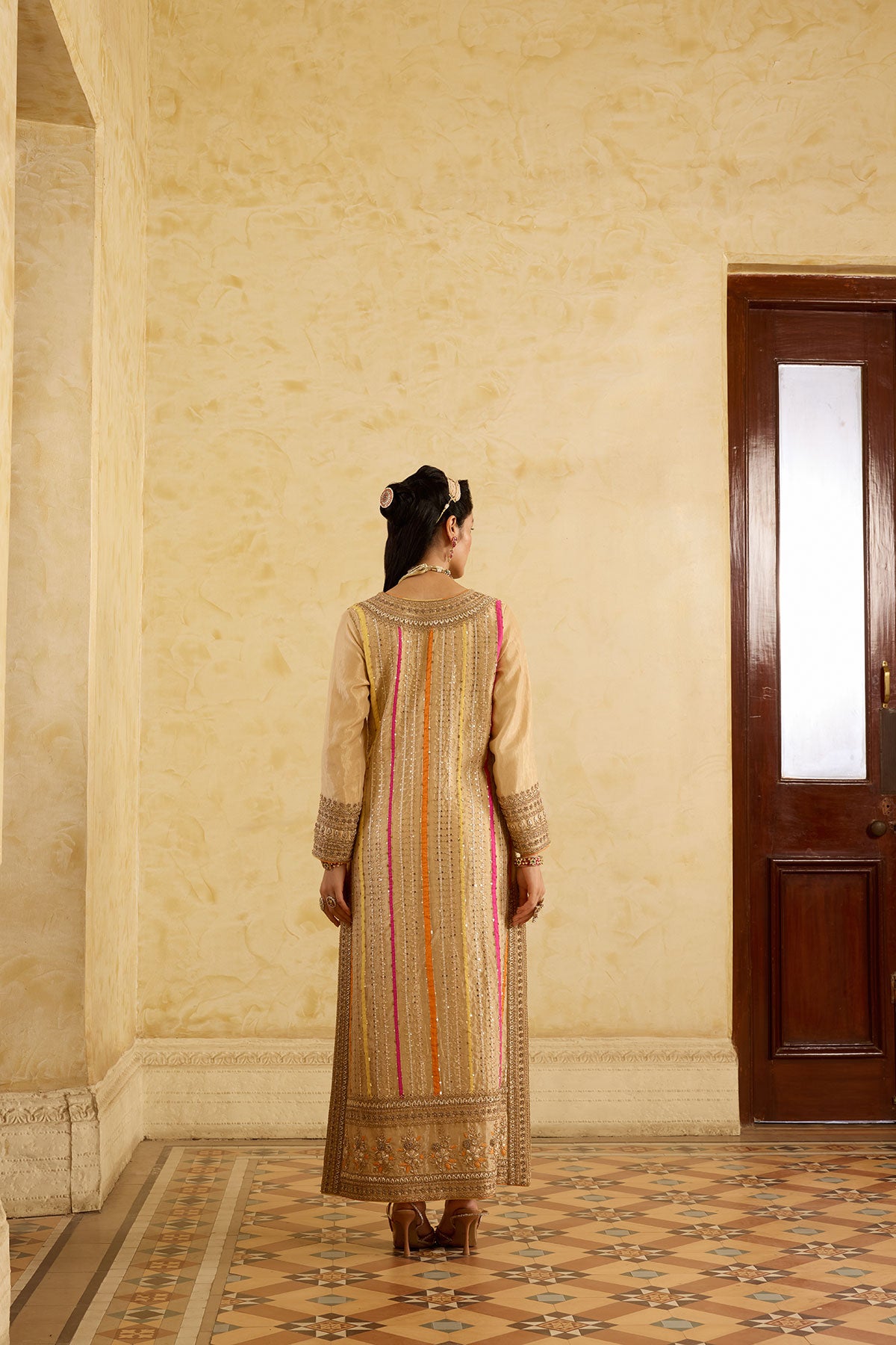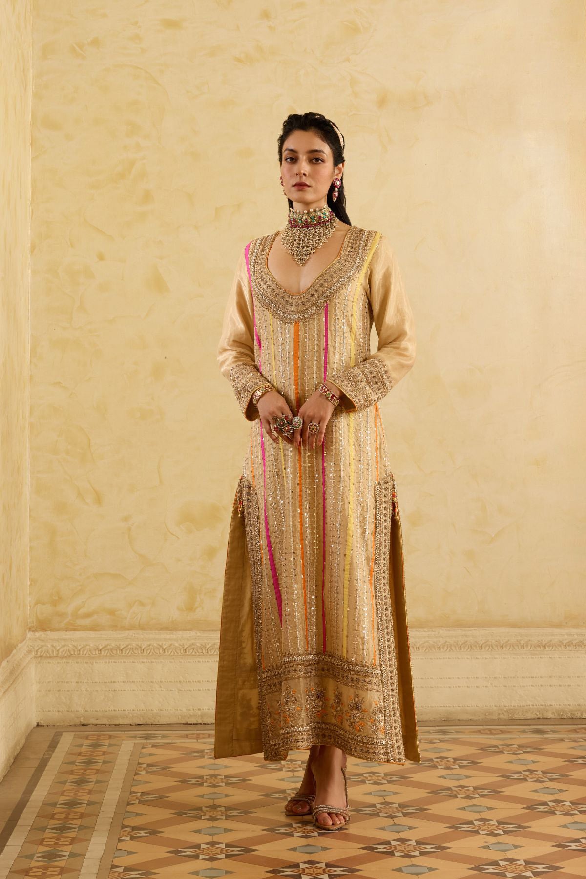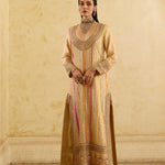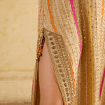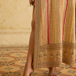 This silk tissue kaftan comes adorned with intricate zardosi, detailed floral motifs, and a statement neckline. The vertical embroidery elongates the silhouette, while ornate hemwork adds a regal touch. Perfect for weddings, festive evenings, and celebrations that call for a contemporary statement.